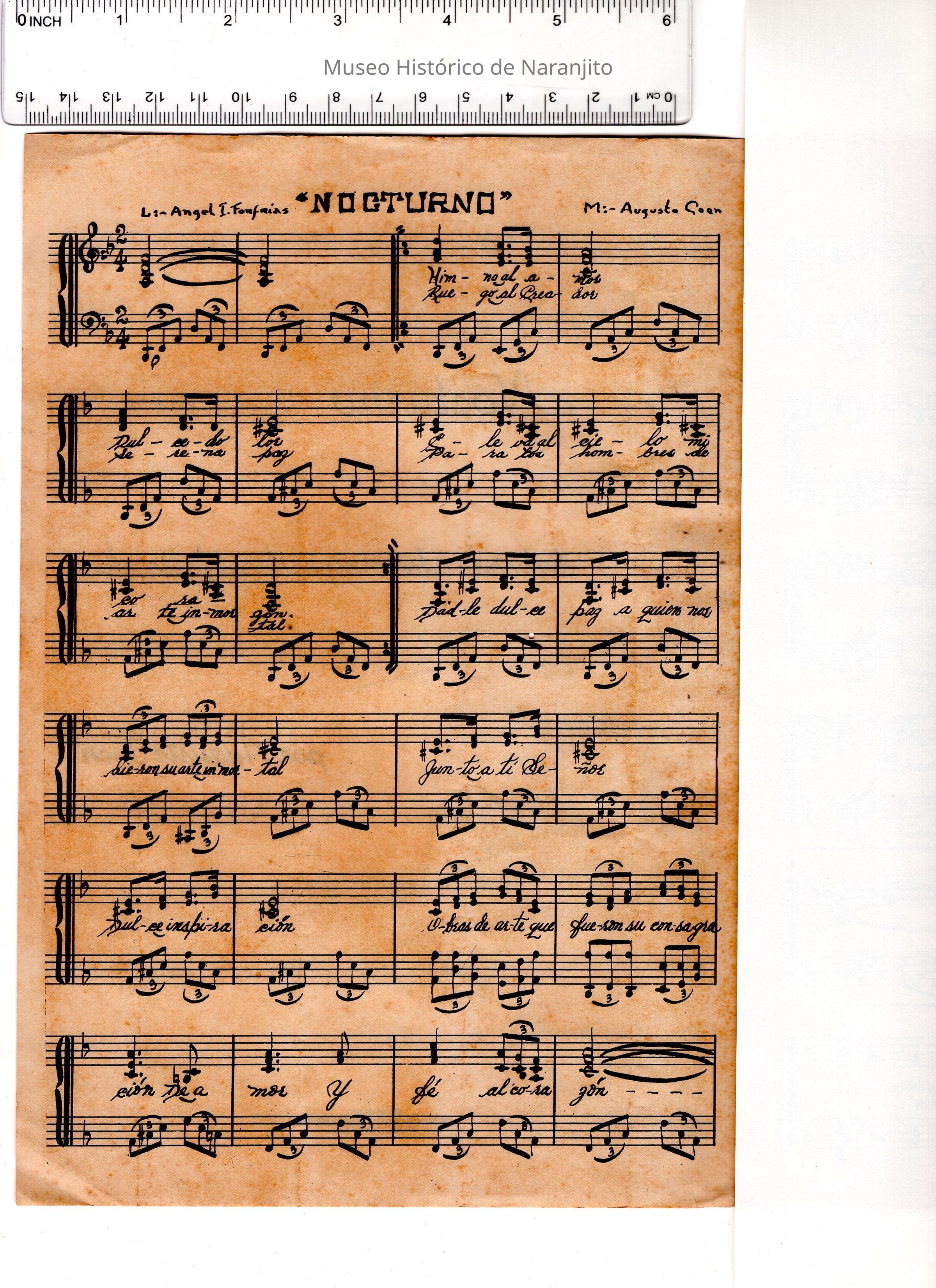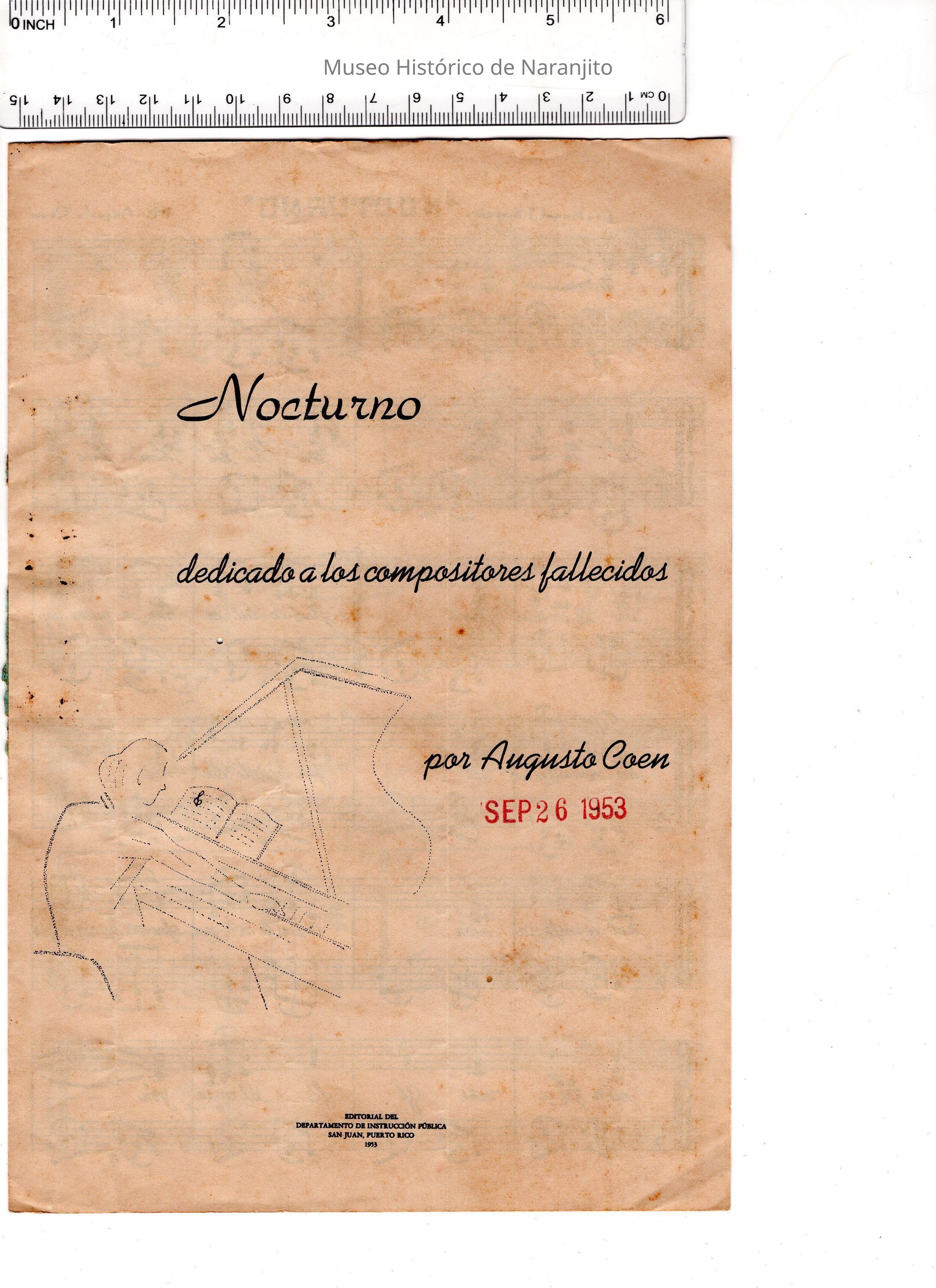 Partitura de la canción titulada "Nocturno" compuesta por Augusto Coen, quien fue un destacado músico y director de orquesta puertorriqueño. En colaboración con Ángel I. Fonfrías quien fue un cantante y compositor puertorriqueño.
