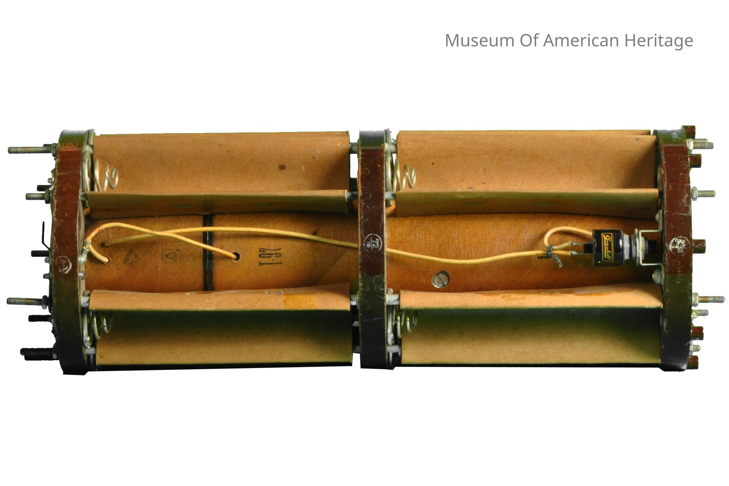 Uses 14 approx. 1 dia x 6 long batteries, timer with thumb key, scale 0 to 24 (minutes?), D ring for attaching parachute, dropped from air plane to jam enemy radios.