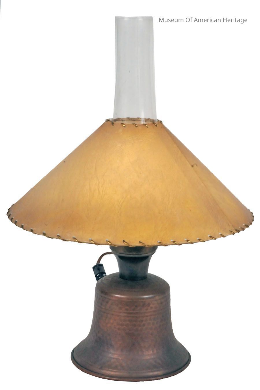 hammered copper base, glass chimney. paper shade with edge stitching.