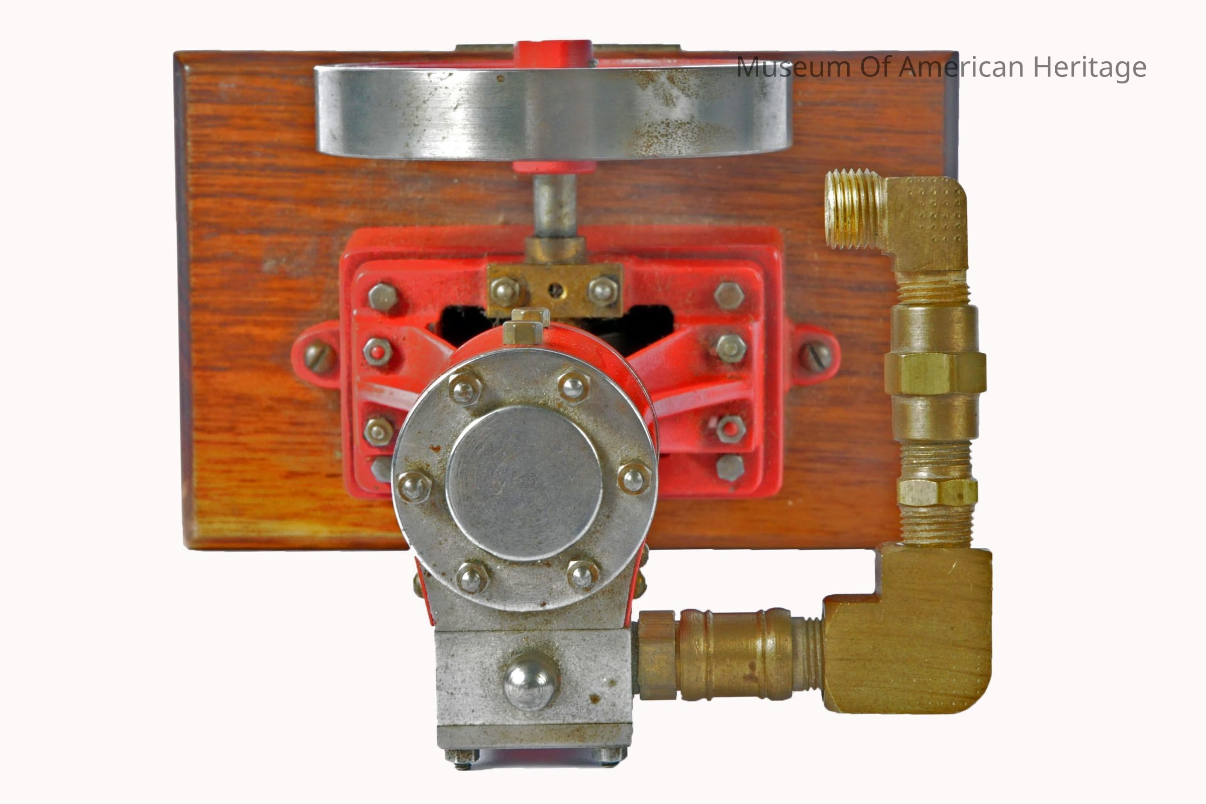 Vertical top piston engine mode, made from a kit, unknown builder, mounted on wood base.