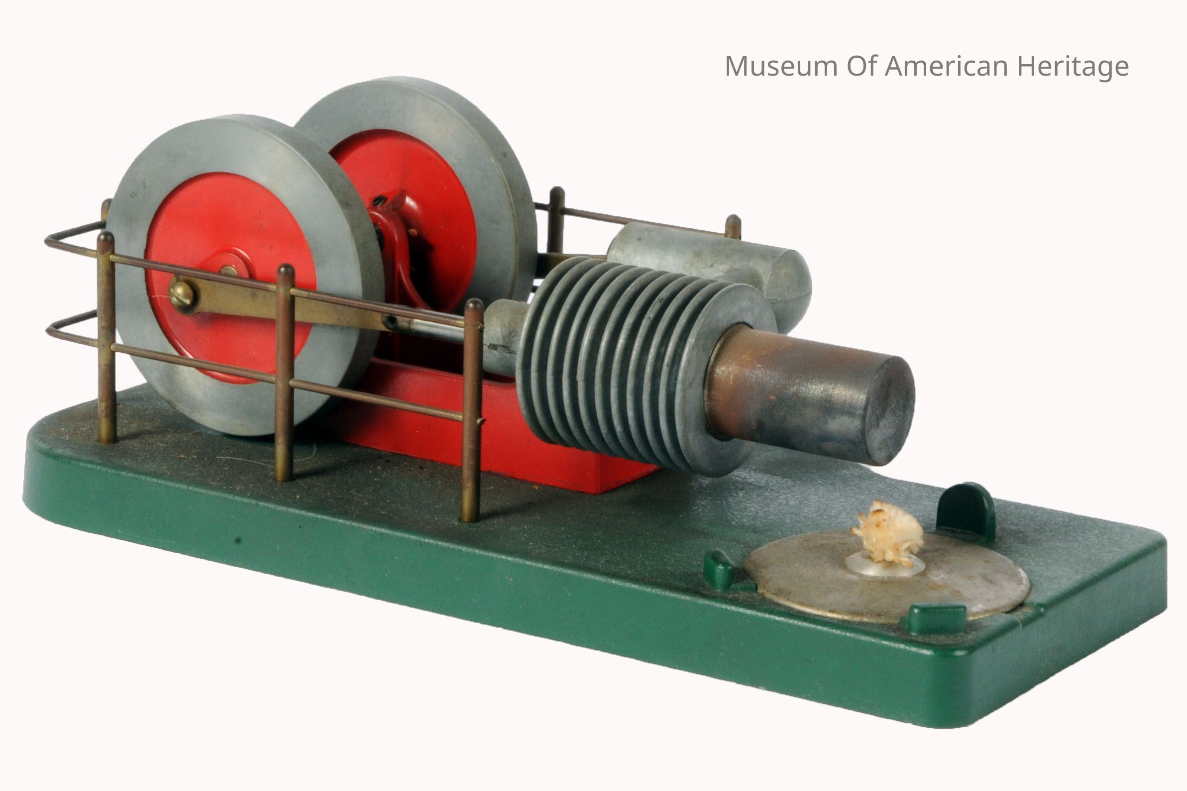 Horizontal piston, dual flywheels, alcohol wick built into base with reservoir built into base.