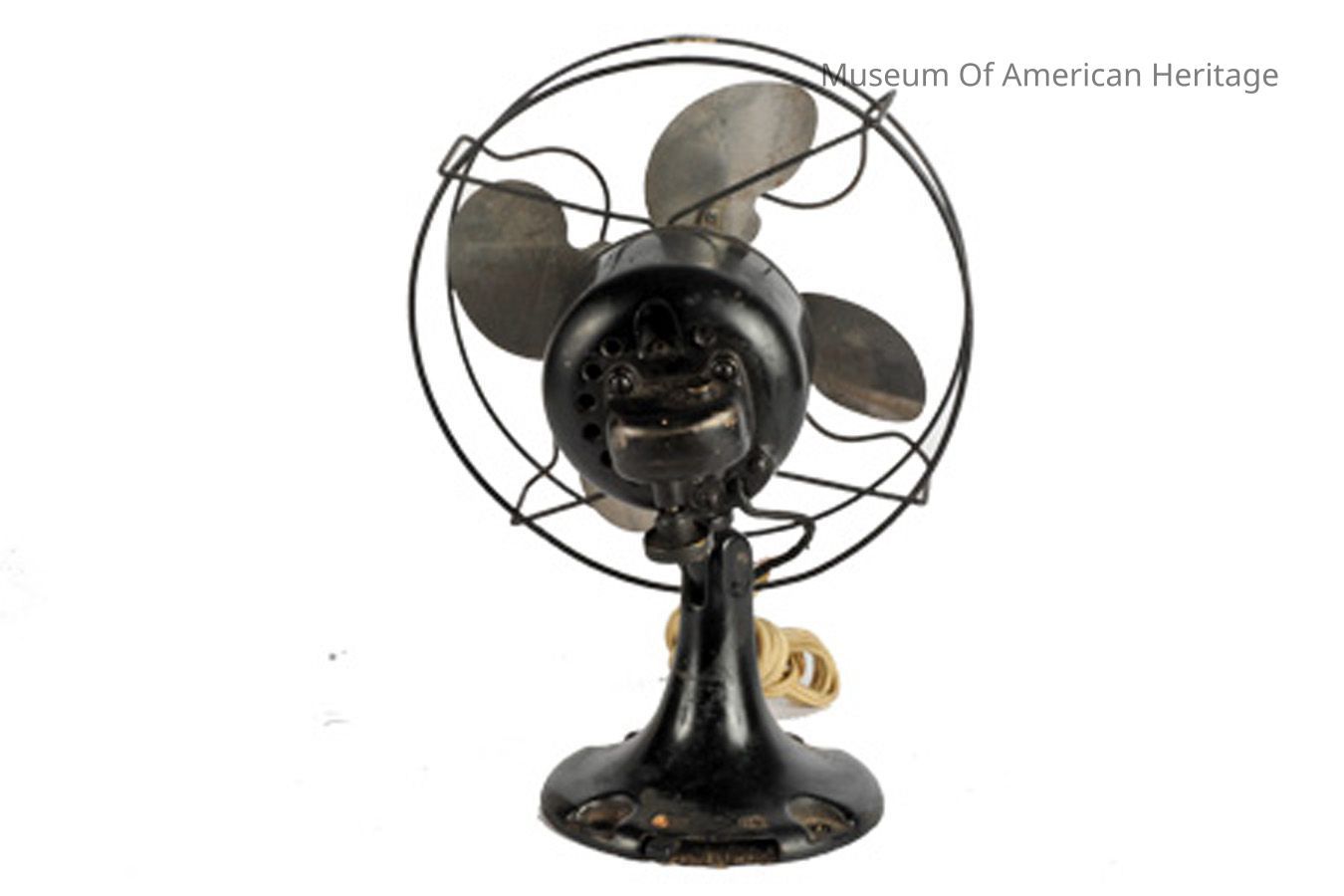 Modern AC cord added, 4 blades, single S cage, on/off switch in edge of base.
