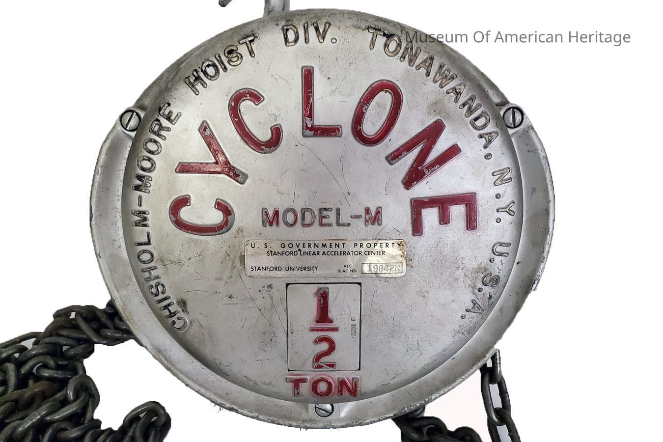 Cyclone Hoists were introduced in 1904. 1/2 Ton capacity. Top Hook and hook at chain end, approximately 15 feet of chain.