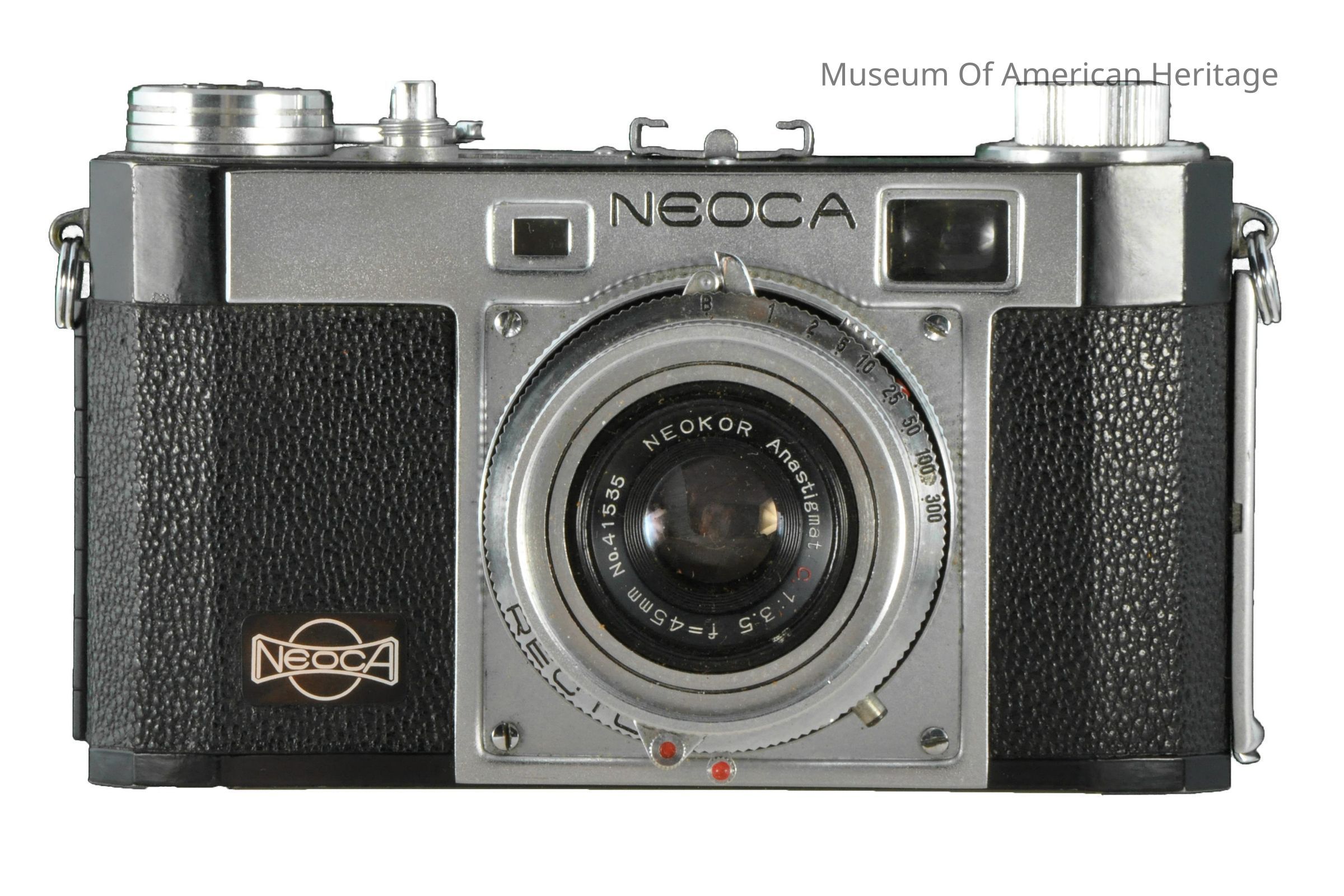 Range finder, central shutter, dual stroke advance lever, no exposure meter, shutter speeds B plus 1s to 1/300s, brown leather case.