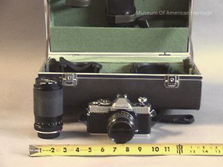 Black leather case, Vivitar zoom lens, electronic flash, in brown leather case.
