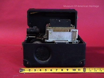 Leather case, early attempt at slide changer mechanism, clear plastic slide holders.