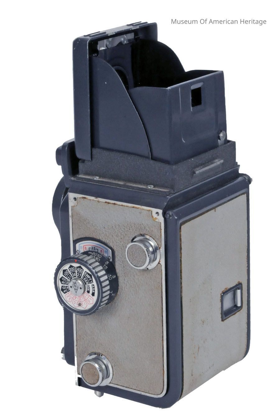 127 type roll film, Crank film advance, red window, f/3.5, Copal shutter, twin-lens reflex camera