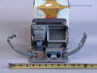 In original box, cast base, carrying handle, folding film holders, plastic red takeup reel.