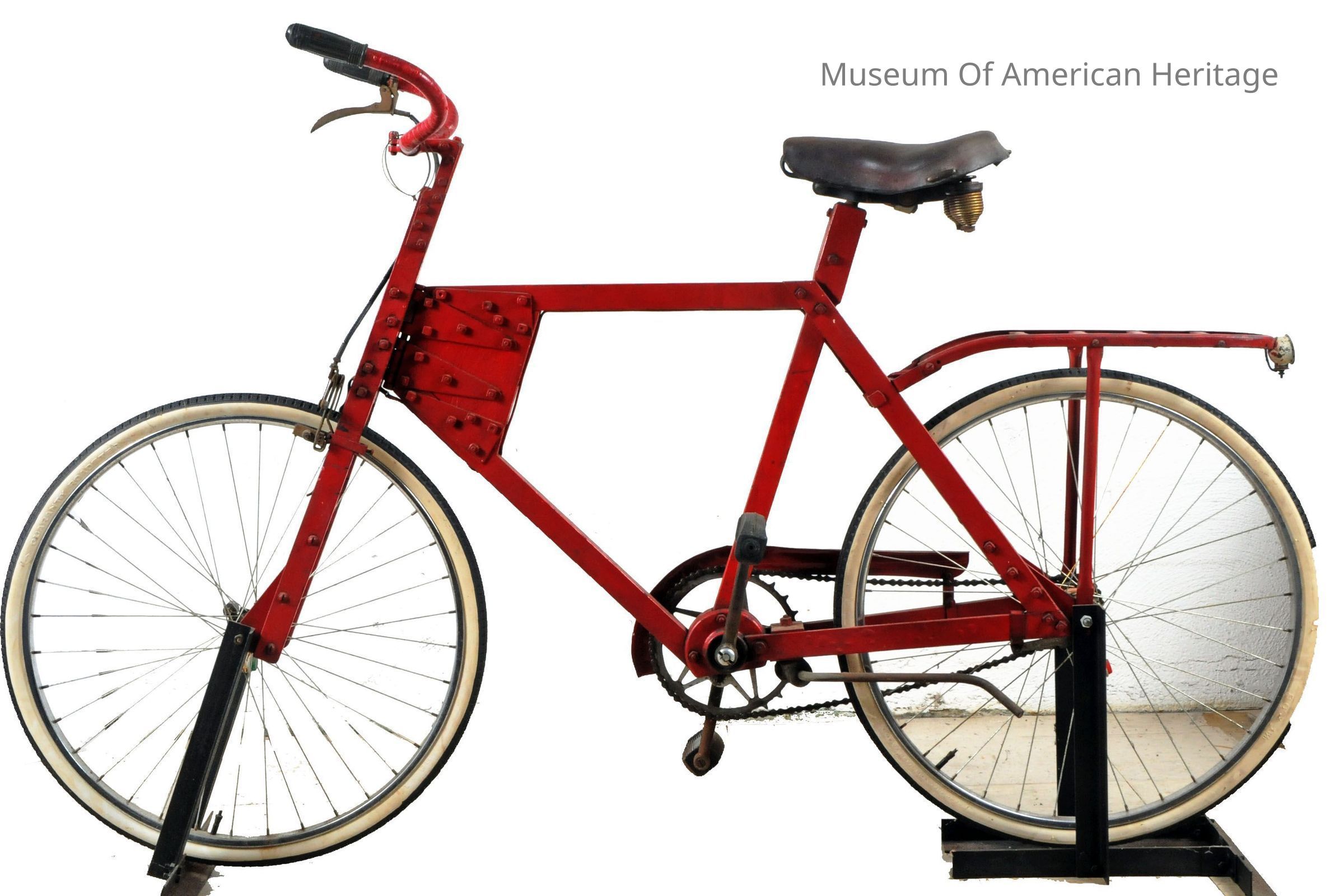 Made entirely from non-priority materials during World War II, front wheel fork pivots using large gate hinges, recycled seat, handle bars, sprockets & petals. Featured in March 1943 Mechanix Illustrated.