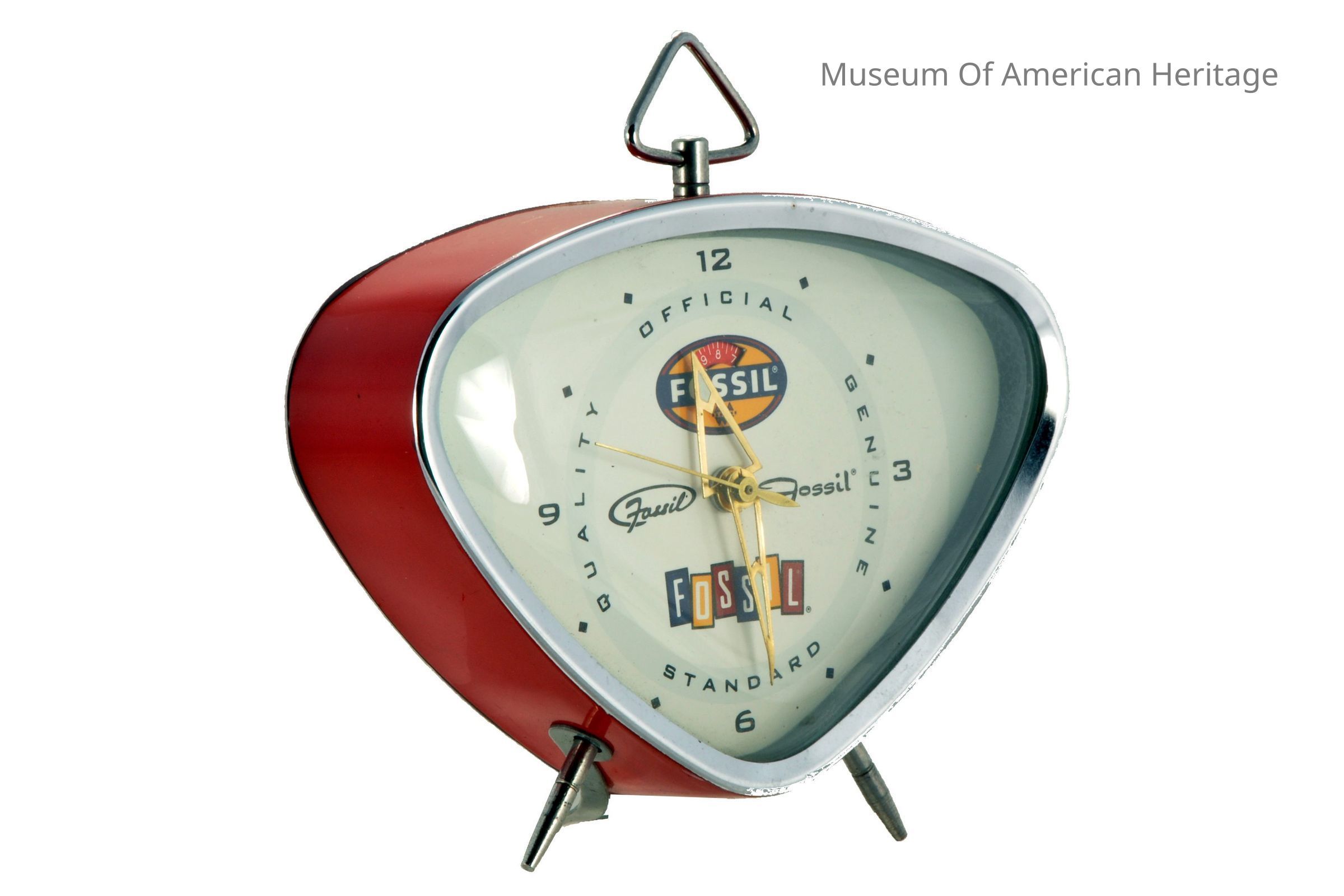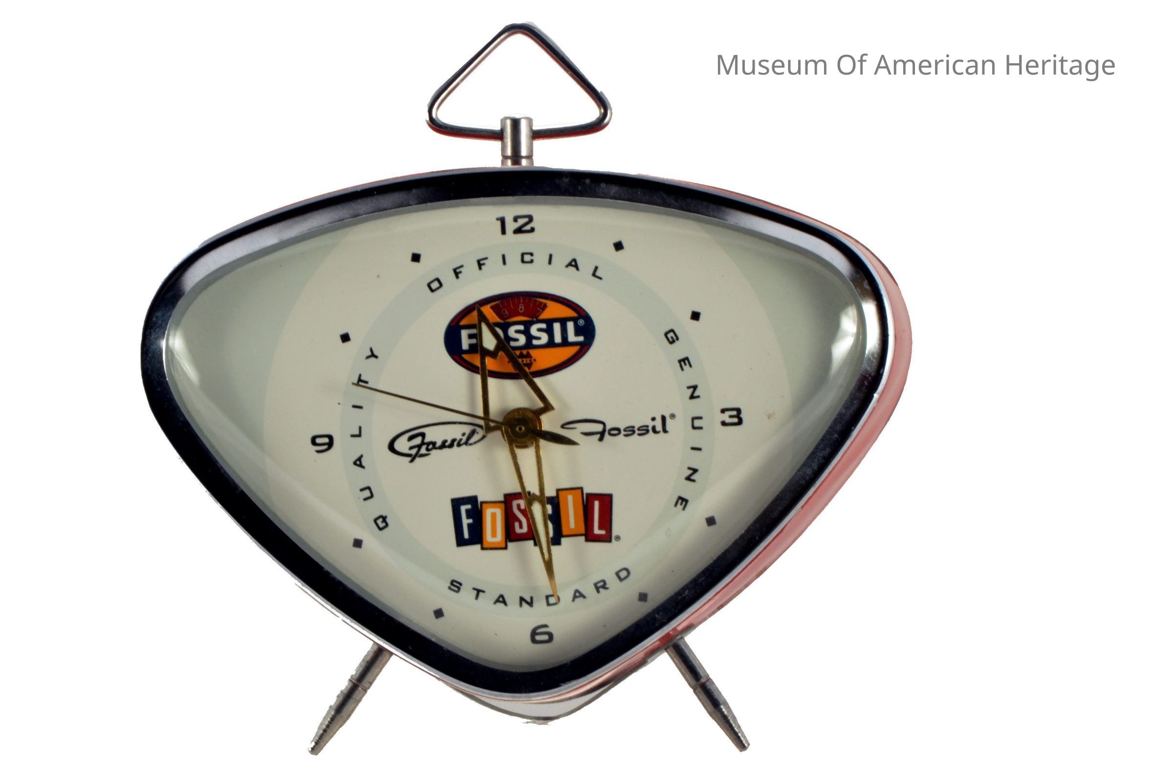 Triangular shape, small triangular handle on top, Official Genuine Standard Quality at 90 around face, black numerals at 3, 6, 9 and twelve, other times designated with square dots, Fossil in several fonts and locations on face.