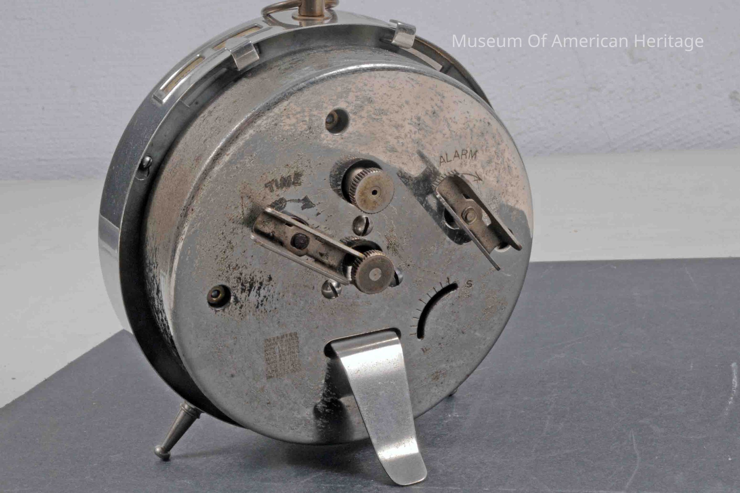 Two legs with stand on back, ring on top, wind up, white radium? numbers on black face.
