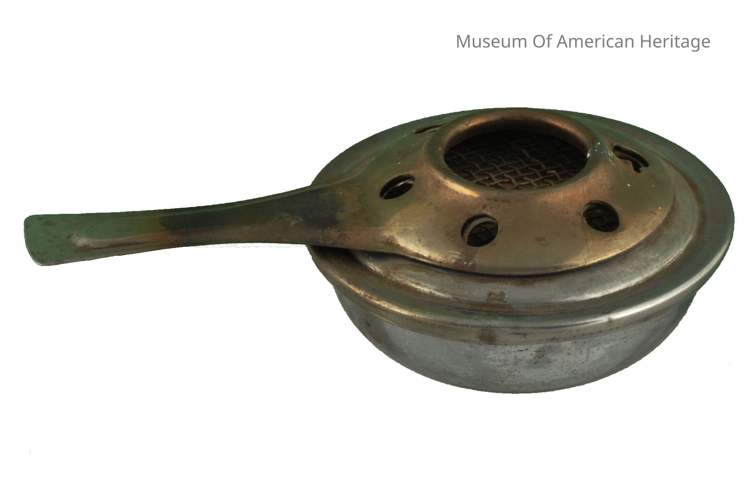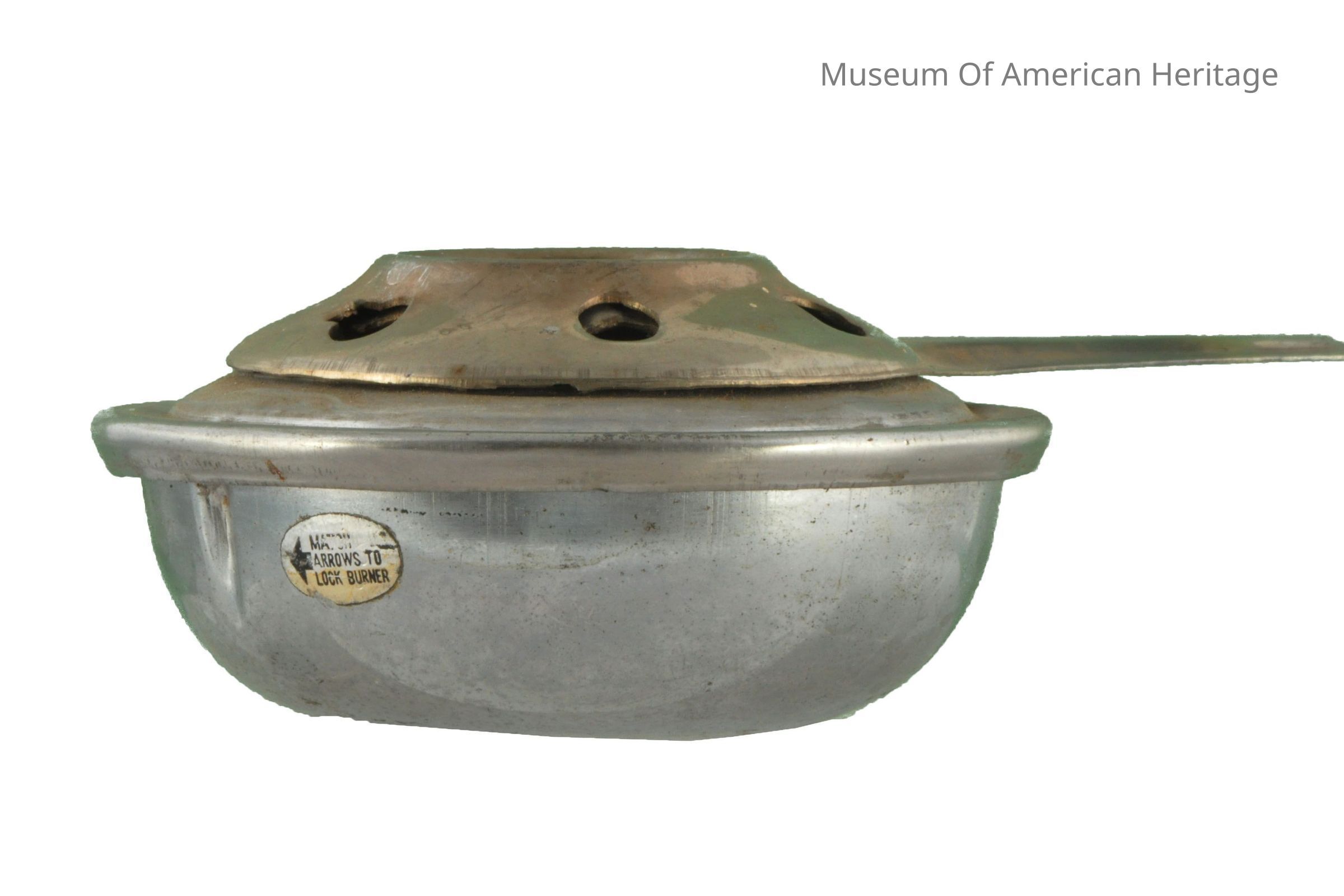 Bowl shaped, handle rotates top side to side to expose vent holes, screen over fabric heat source, arrow points to lock. Possibly part of chafing dish.