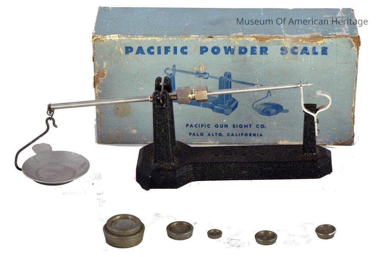 For weighing gun powder for reloading ammunition, cast metal base, metal balance beam, metal weigh pans, metal weights.