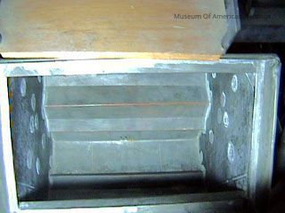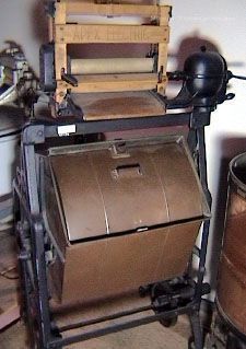 Electric, belt drive, tank rocks back and forth by crank shaft, horizontal half-cylindrical tub, gear-driven wringer, wood frame, cast iron hardware.