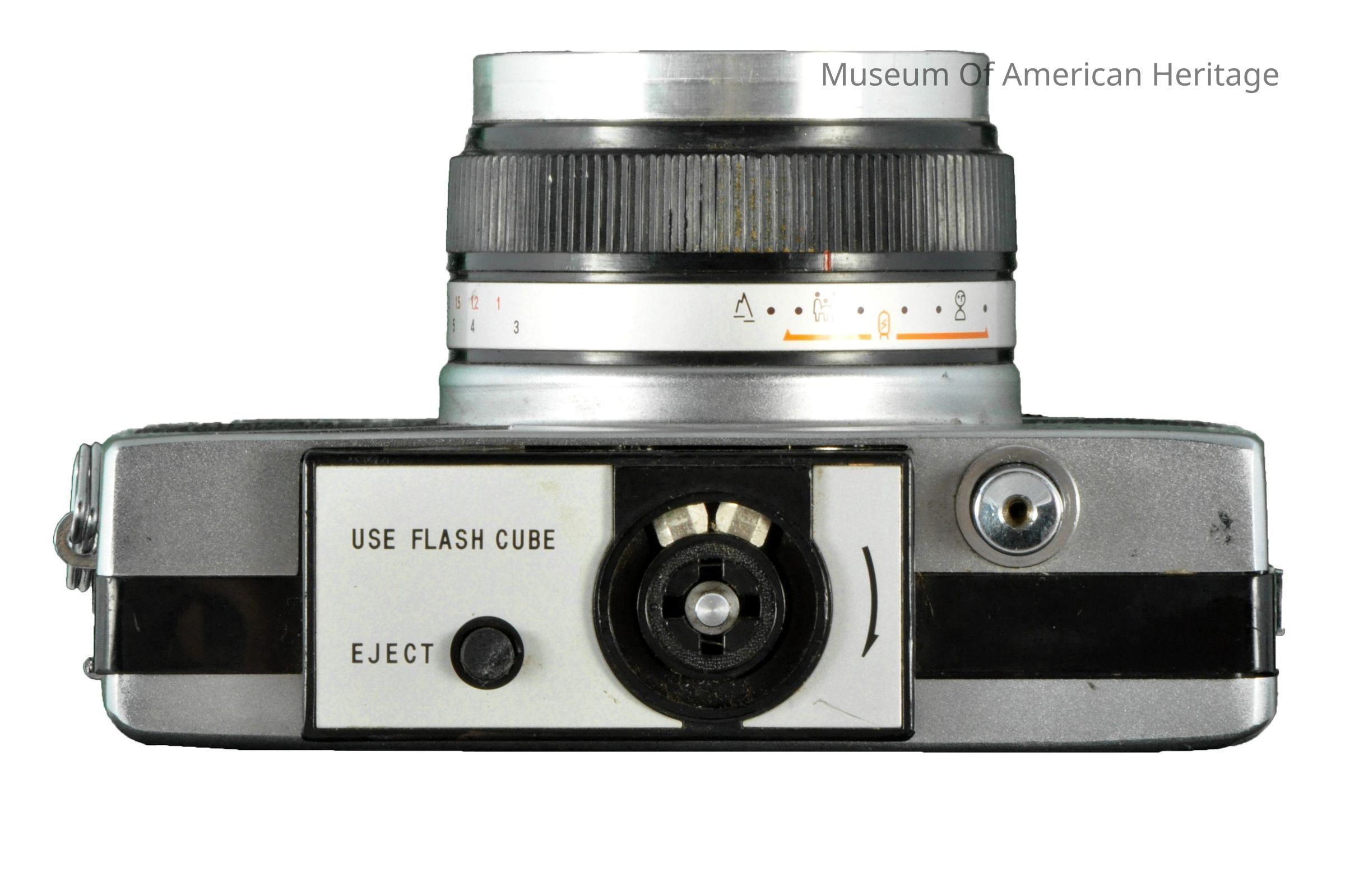 Built in Selenium exposure meter, f2.5 40mm lens, viewfinder, 15v battery, flash cubes.