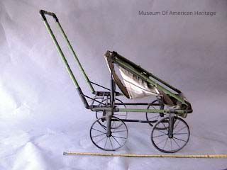 Metal & wood, rubber tires, canvas seat, collapsible, springs, spoke wheels.