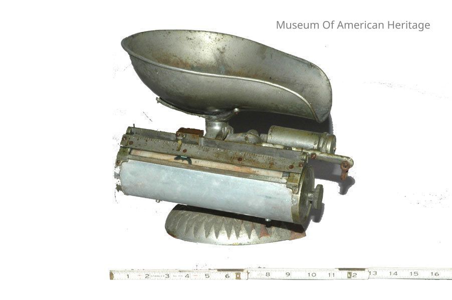 This balance scale features the familiar scoop used for weighing dry goods. This scale is attached to an indicator that points to the suggested price of the item being weighed. This specific scale was used at a family grocery store in North Dakota.