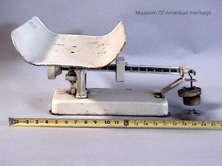Baby scale, beam type, 2 attachable weights (10 lb.), 0-10 beam scale, back side of beam shows age/height/weight, boys / girls charts.