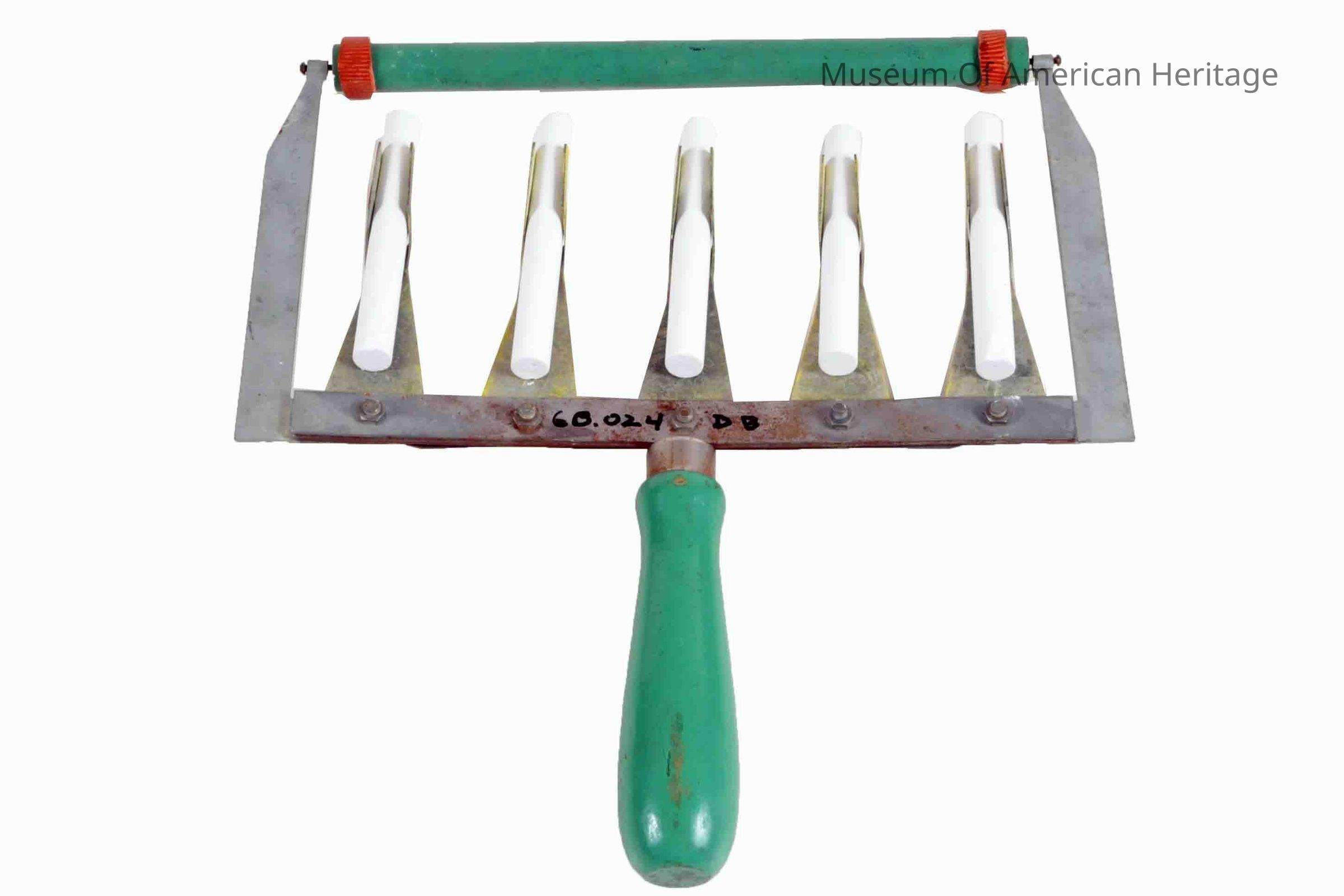 Holds 5 chalk stick or pencils for drawing music staff or stave on blackboard, green wood handle, green rubber roller with red end guides.