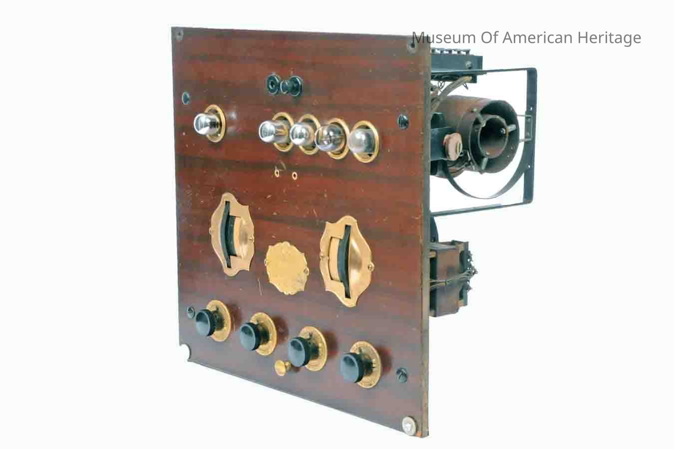5 tubes, Station selection and Amplification dials, 2 Vernier, Battery Setting and Volume Control knobs. Receiver without a phonograph.