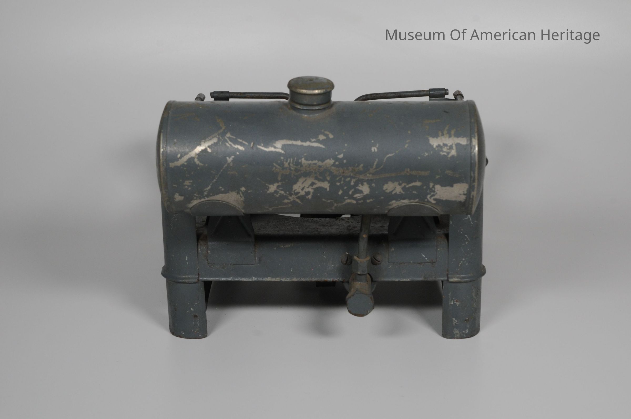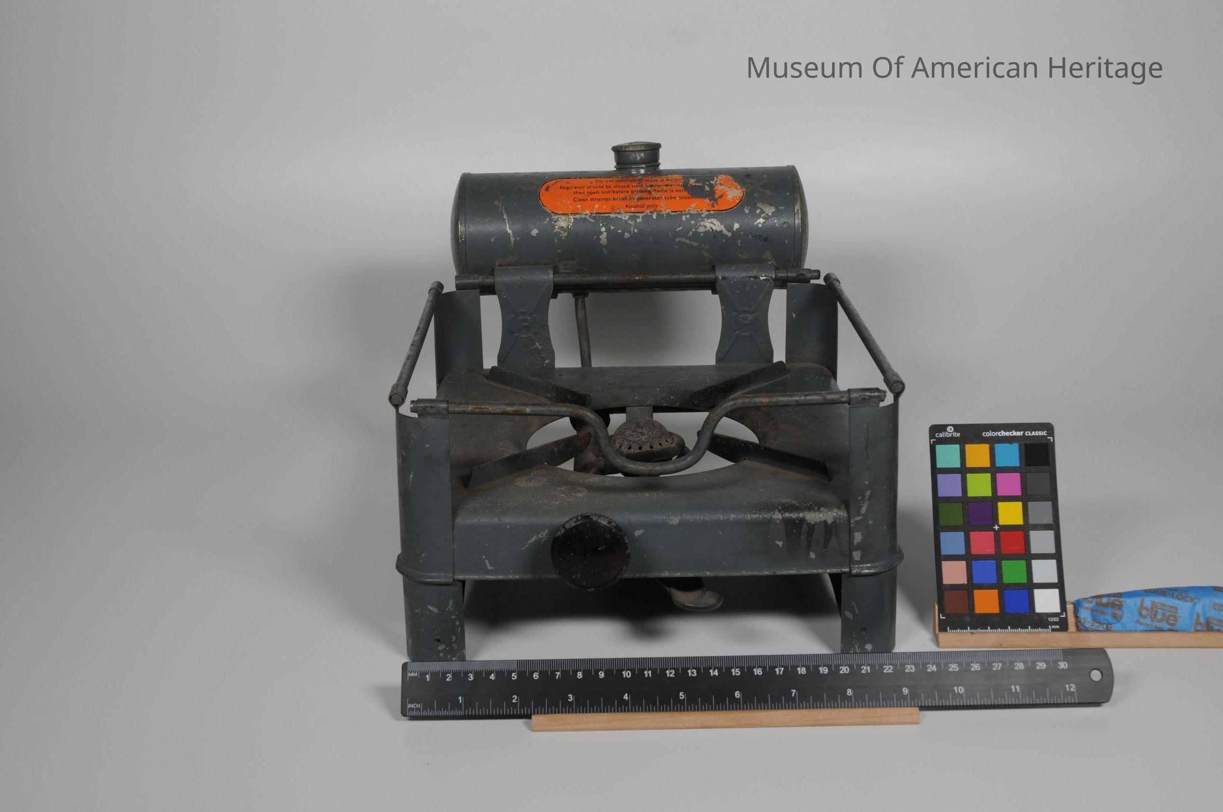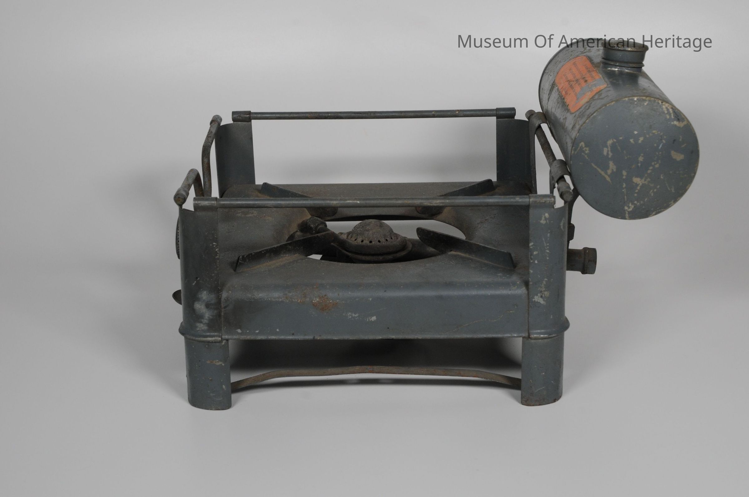 Gravity-fed, alcohol-fueled camp stove; enameled steel