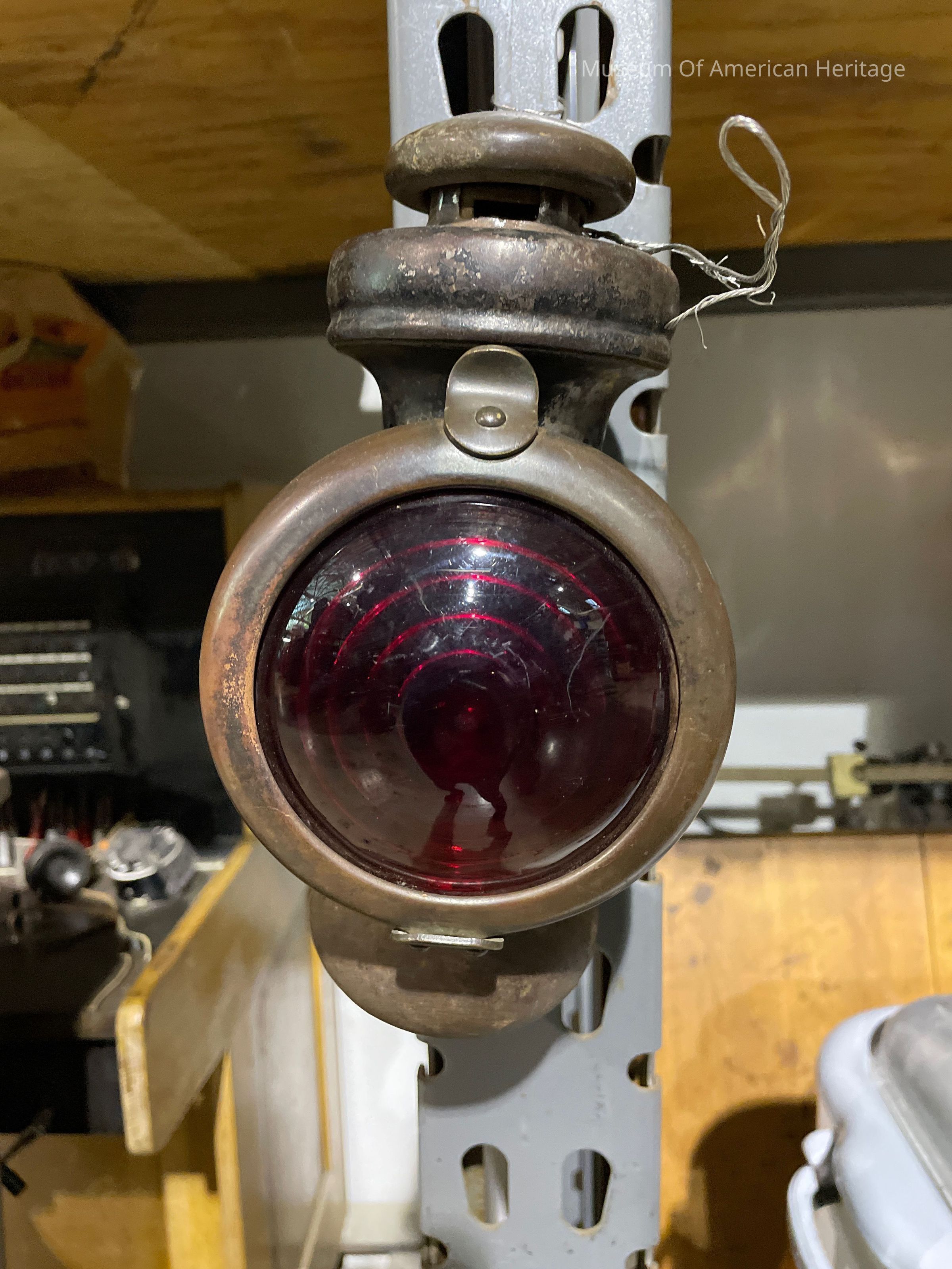 Red glass lens marked Jefferson 911 Kerosene wick lantern for Ford Model T rear facing lantern Rear facing hinged red lens and a clear side facing lens.