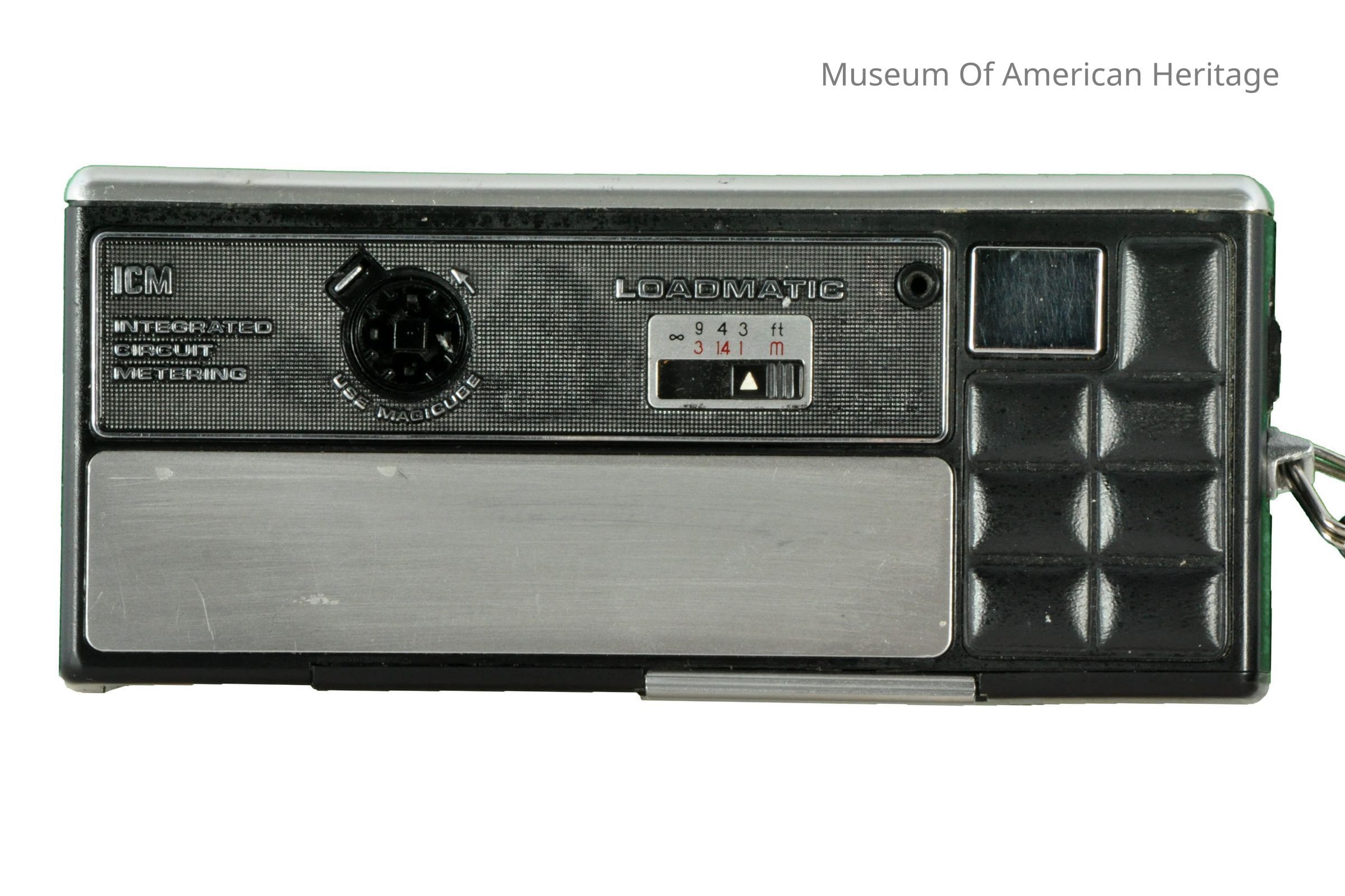Light metering, range sets in front, flash cube (magicube??), with black box.