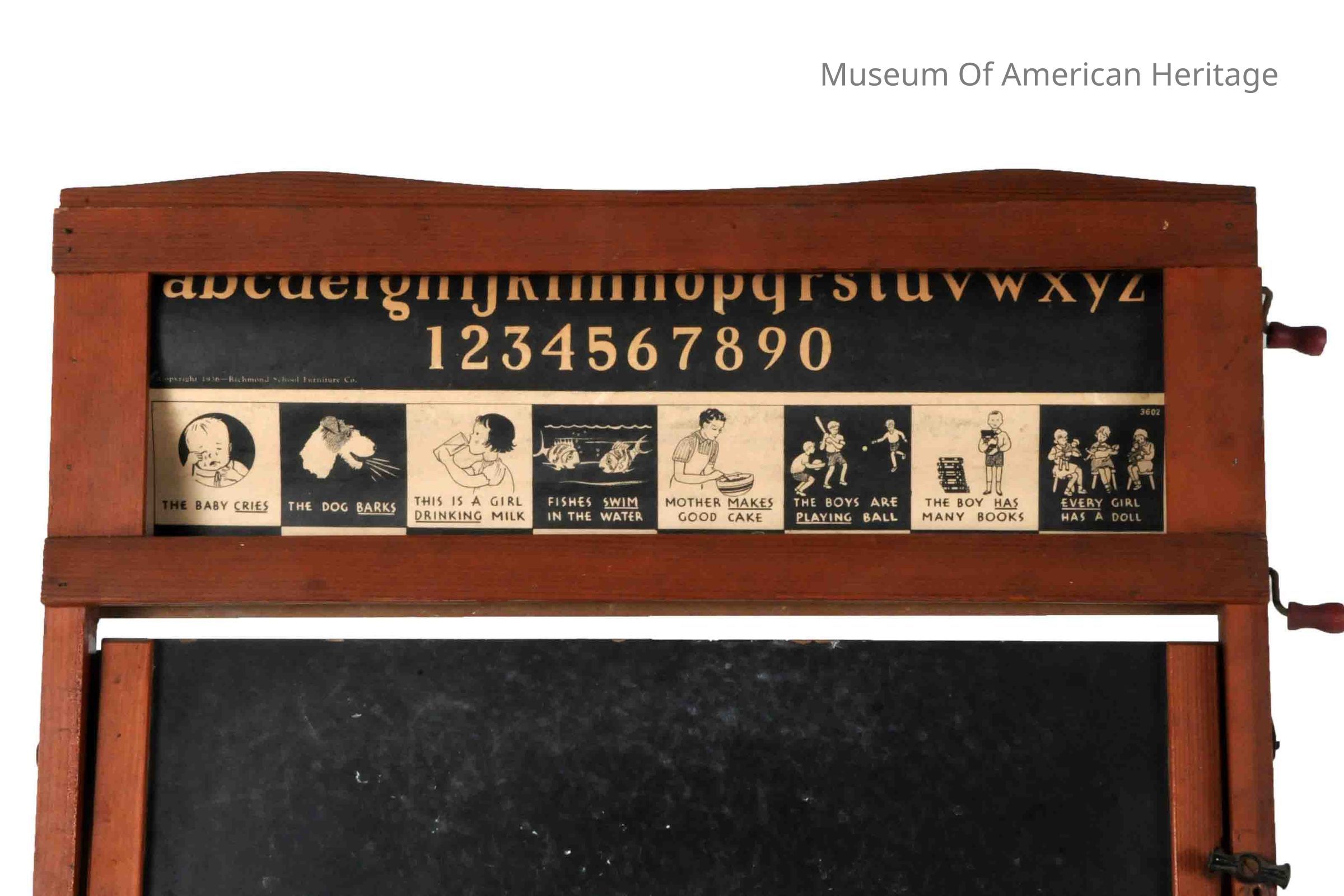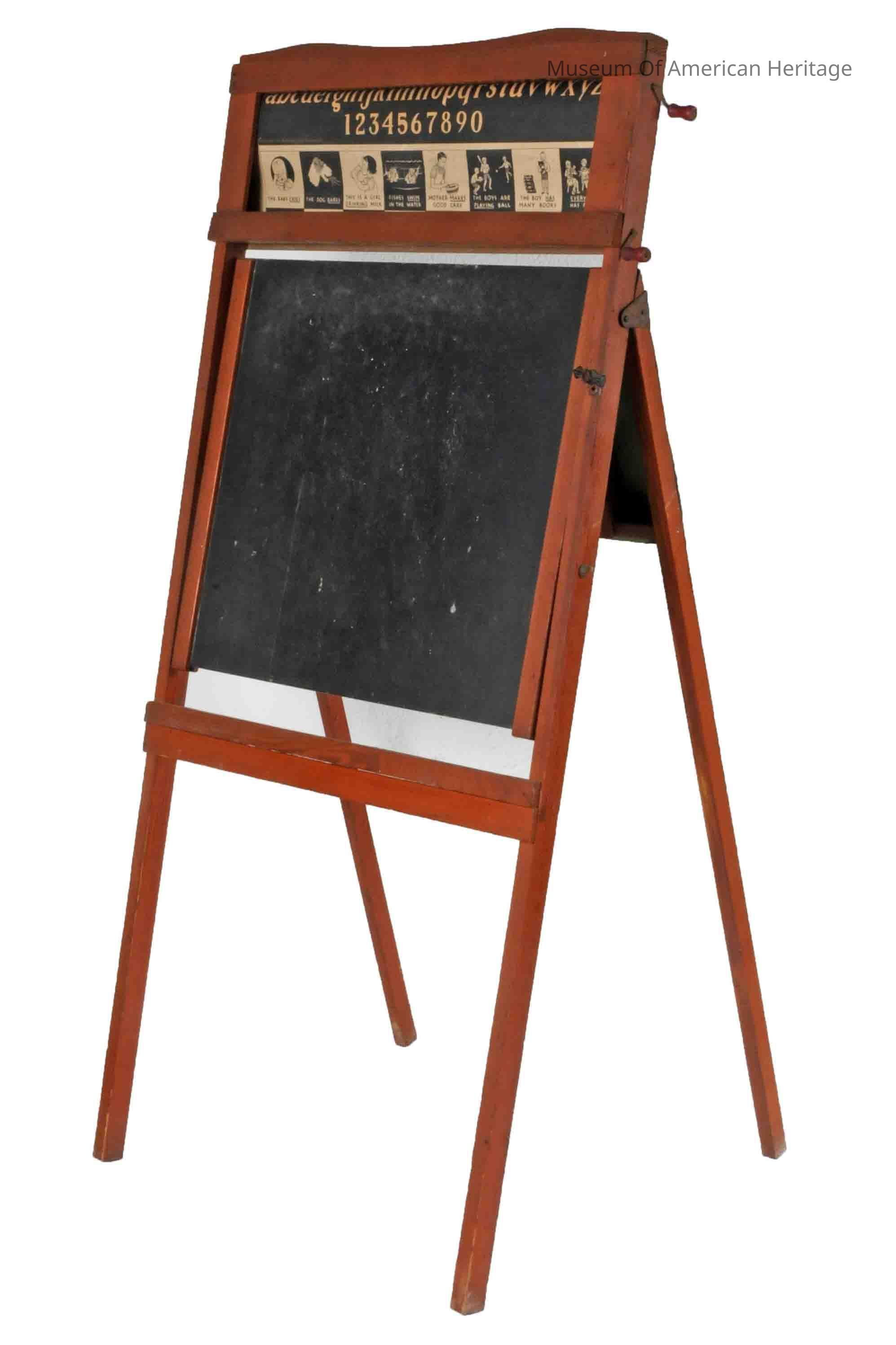 Paper scroll at top with alphabet/school lessons, flip down work table, easel design.