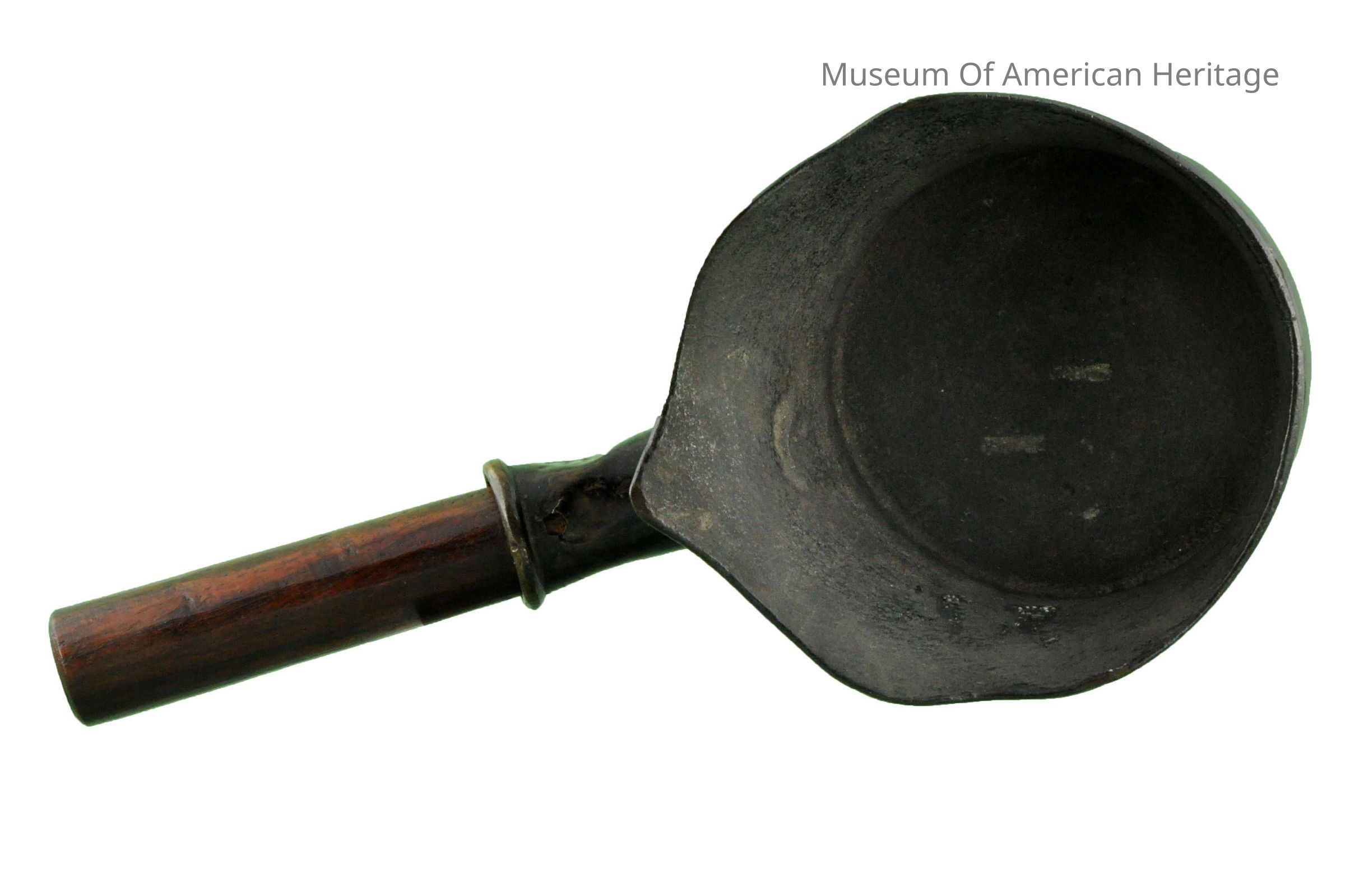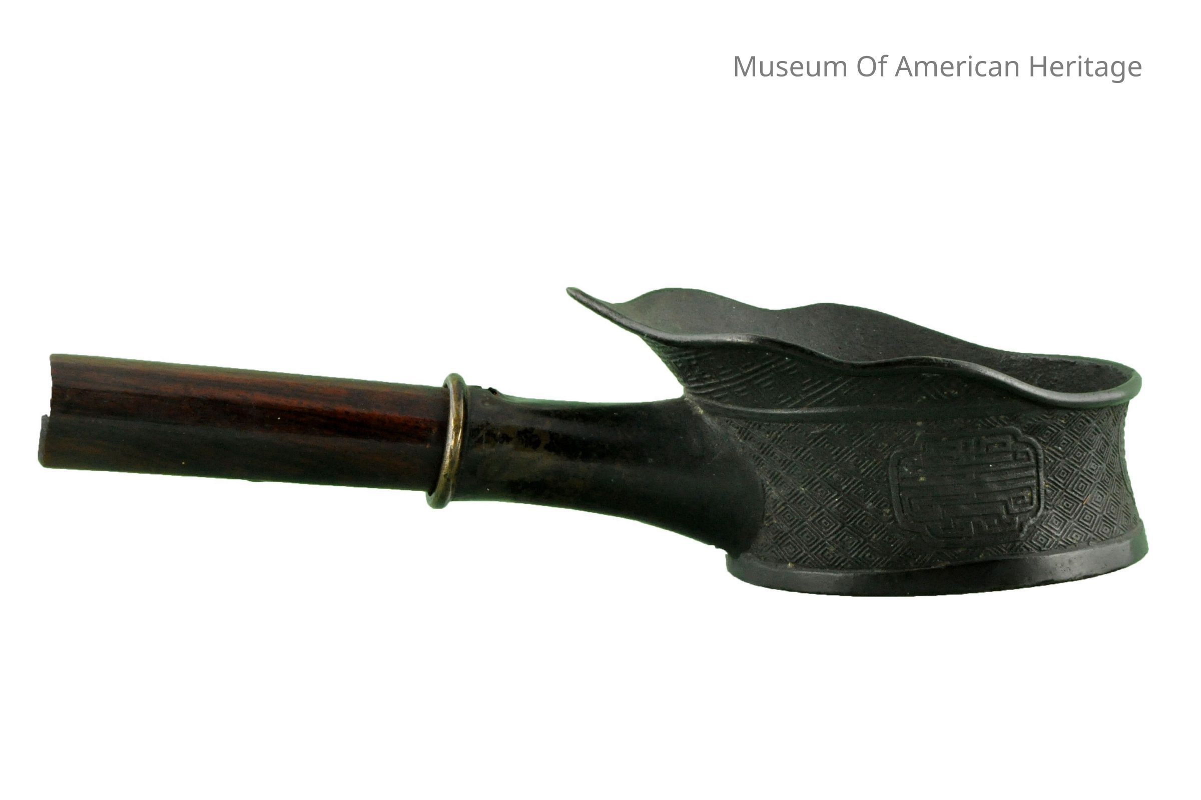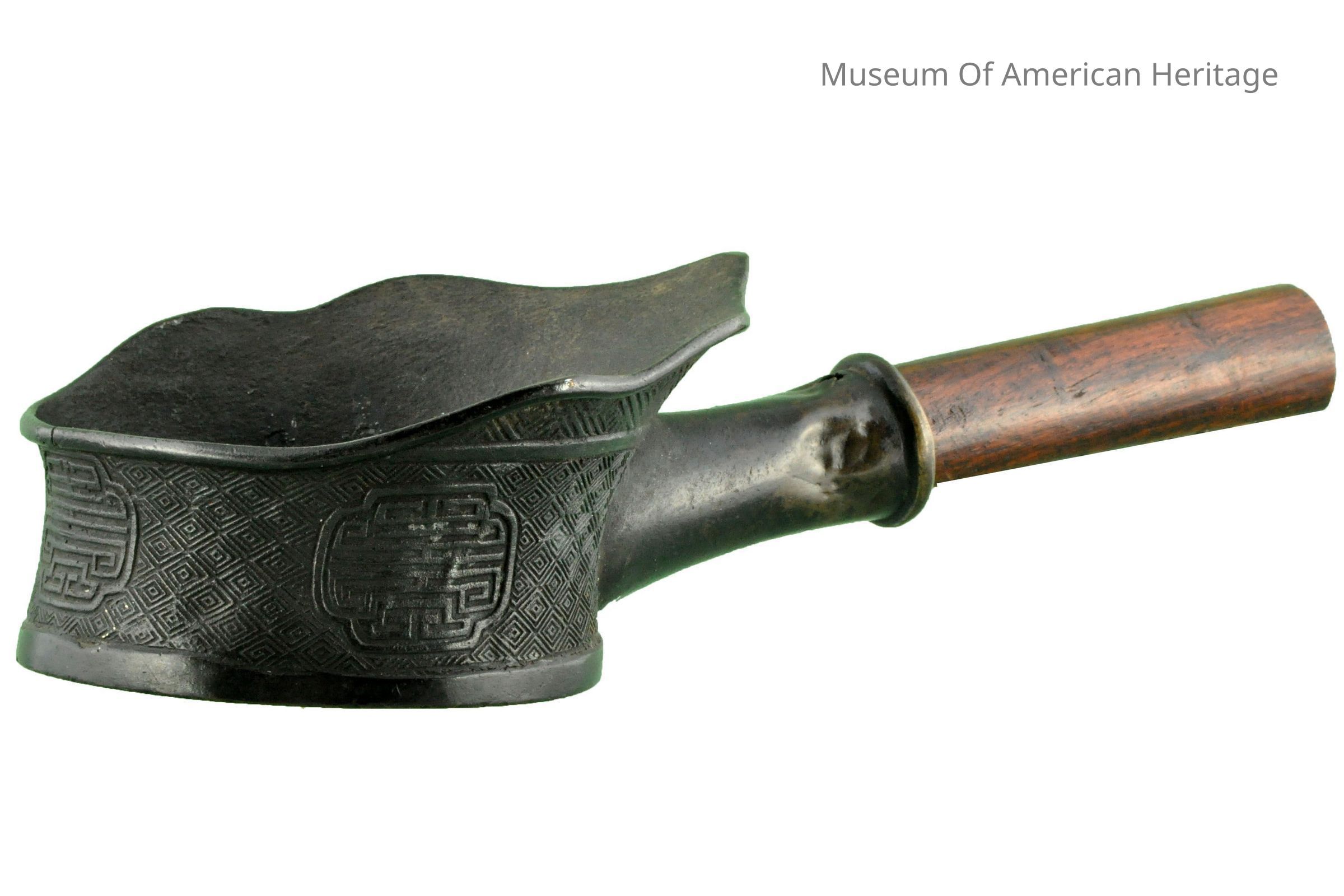 Wood handle w/floral motif, red, green, white design around outside, heated by charcoal in pan.