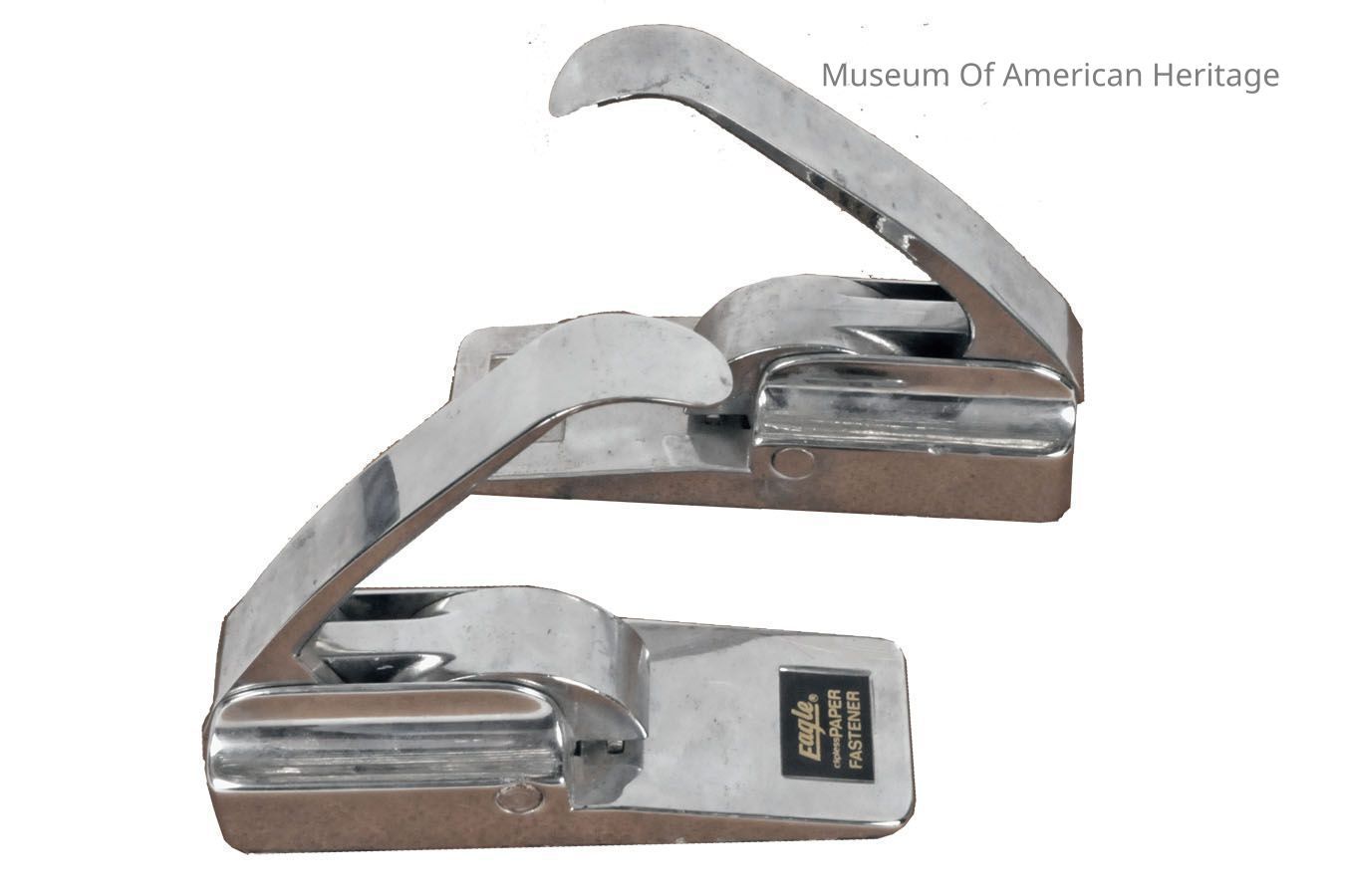 Pivoting arm that pushes fastener down onto the base, fastener made of two rigis pieces of metal that bit into the paper, fastening them together