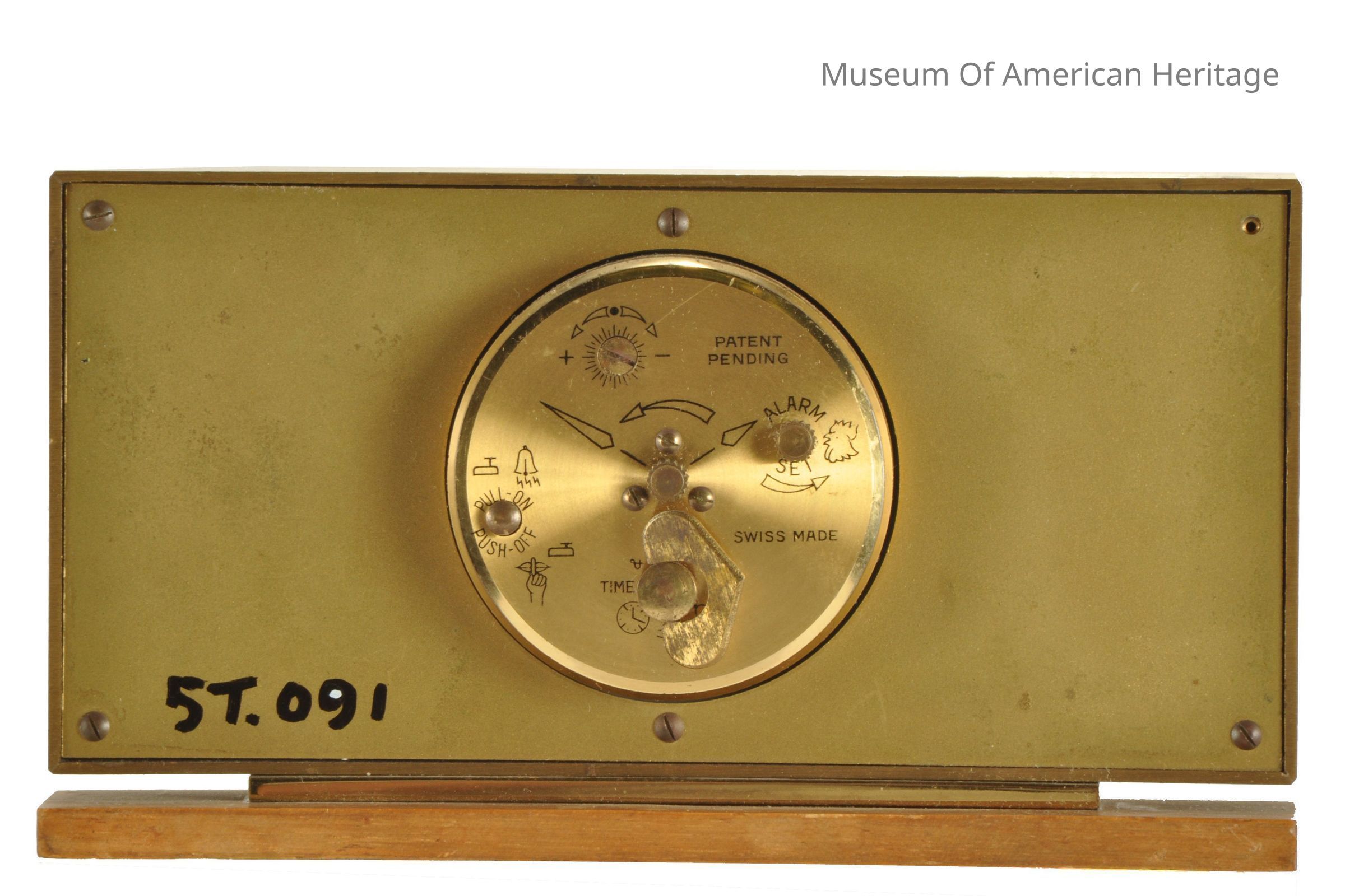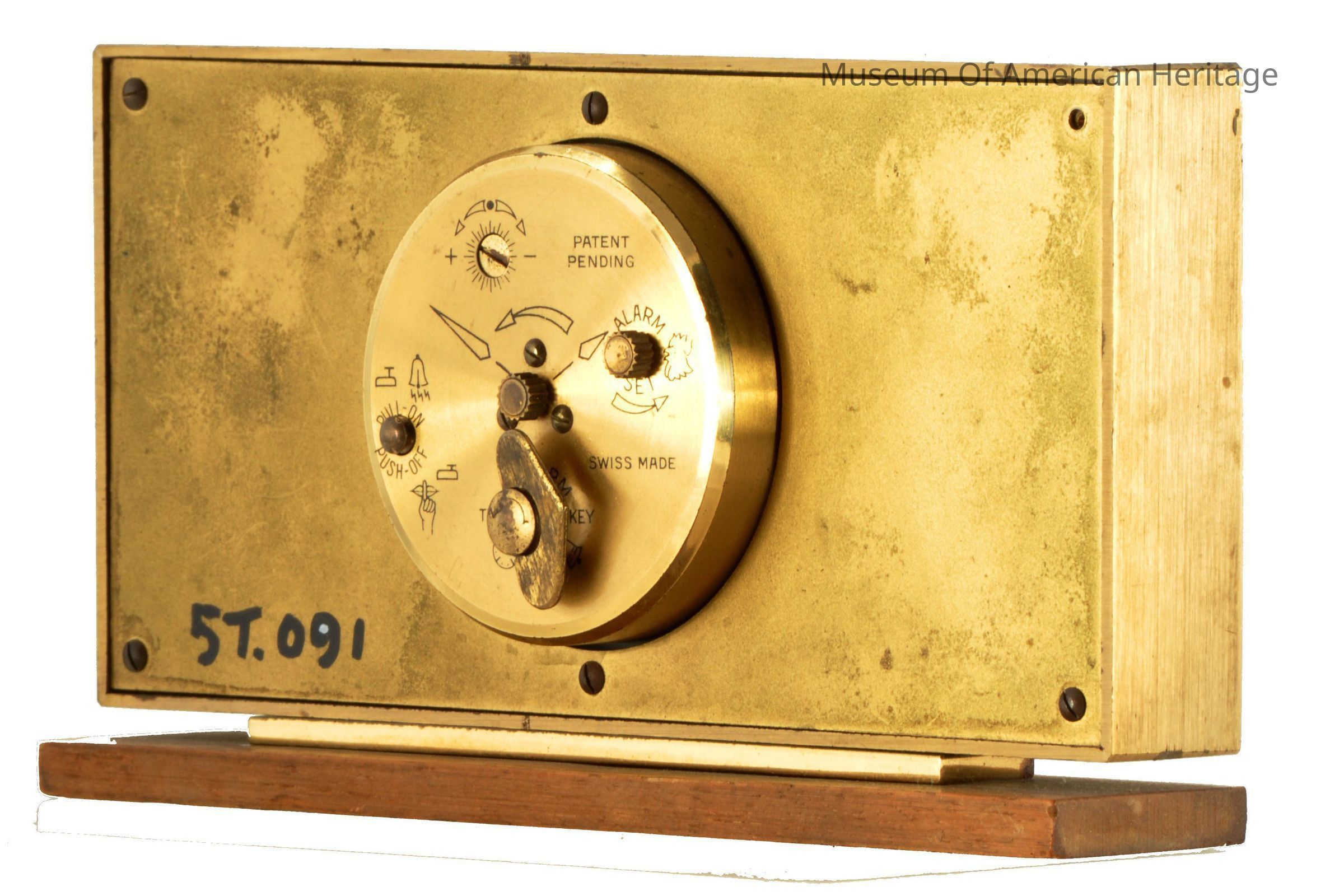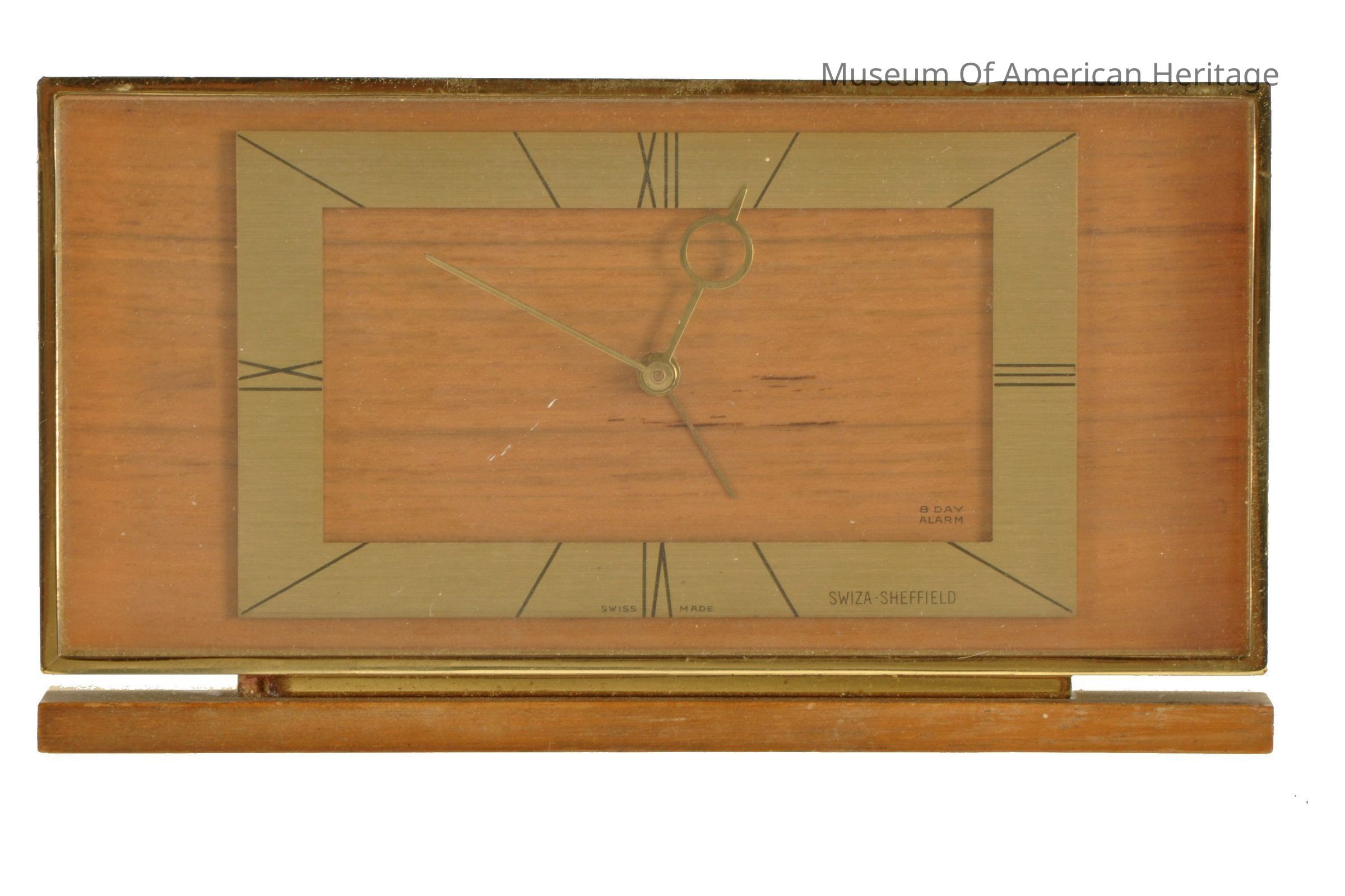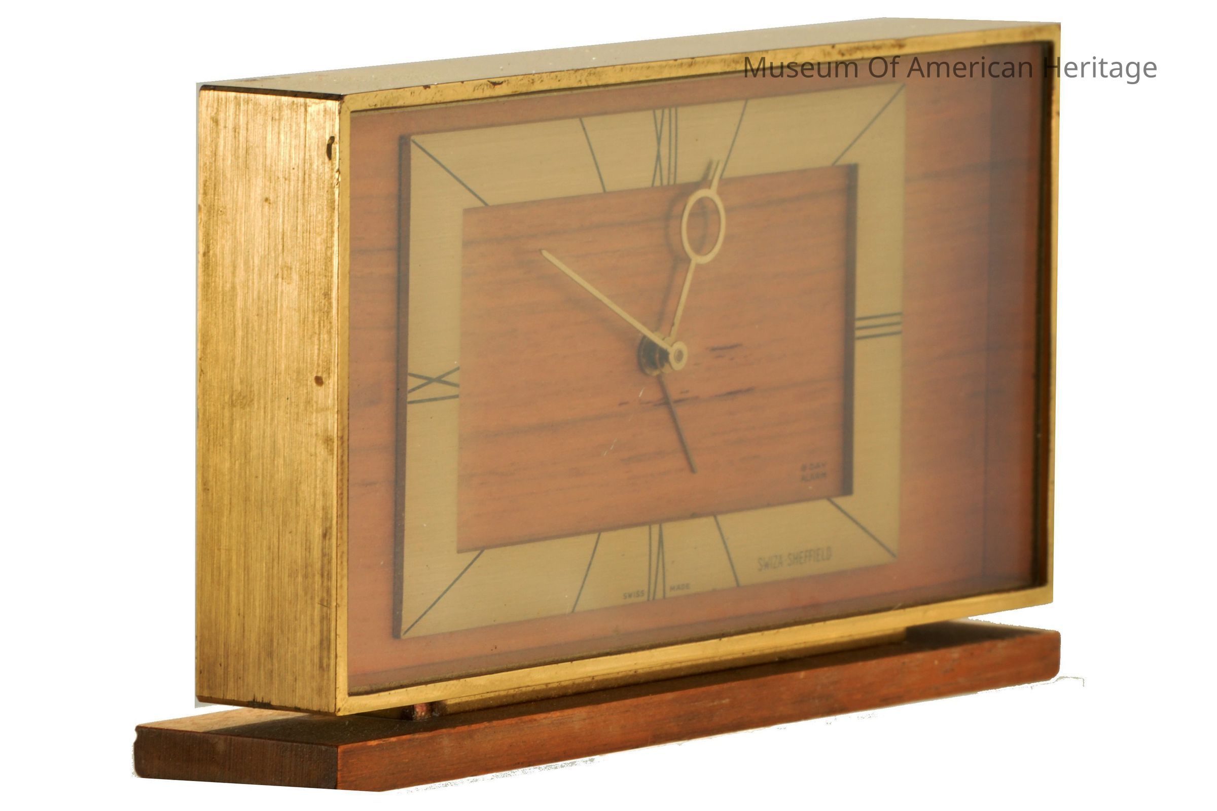 Brass rectangle frame on wood face, brass body on wood base.