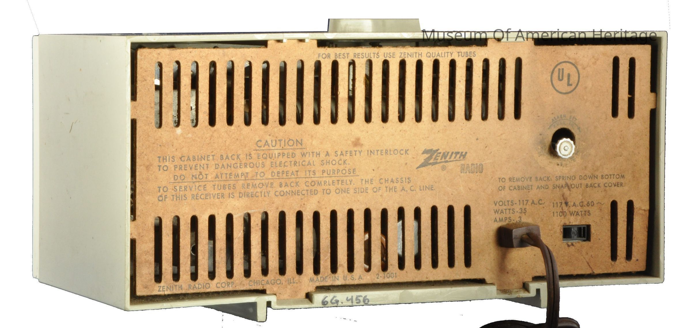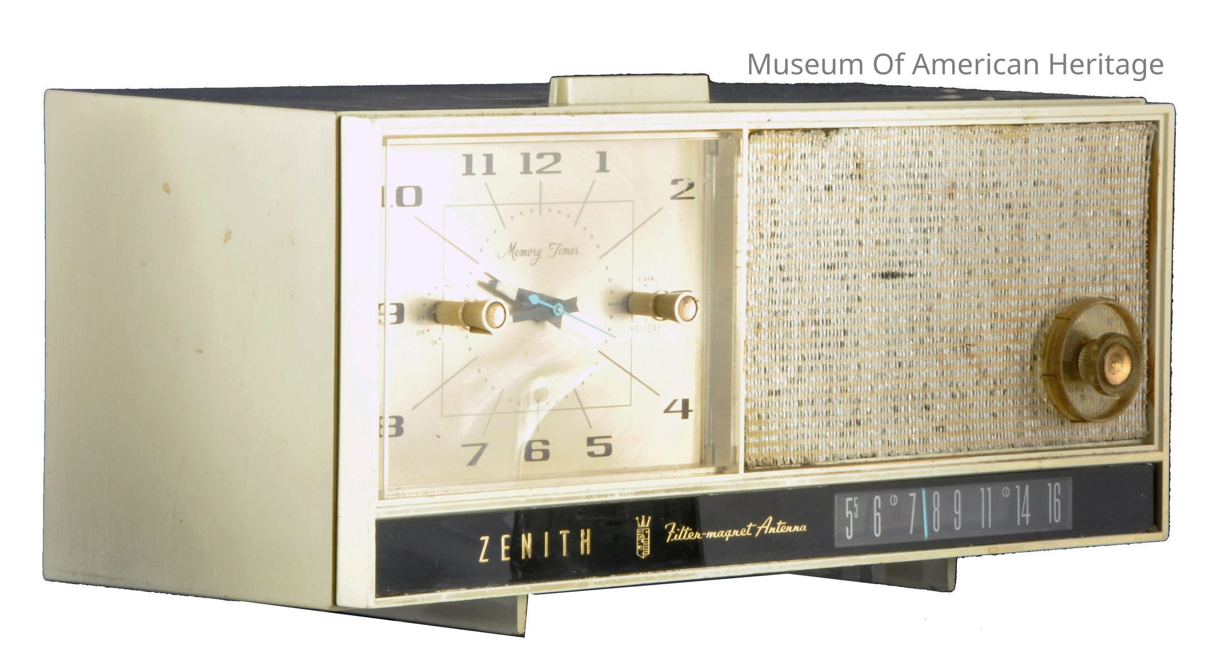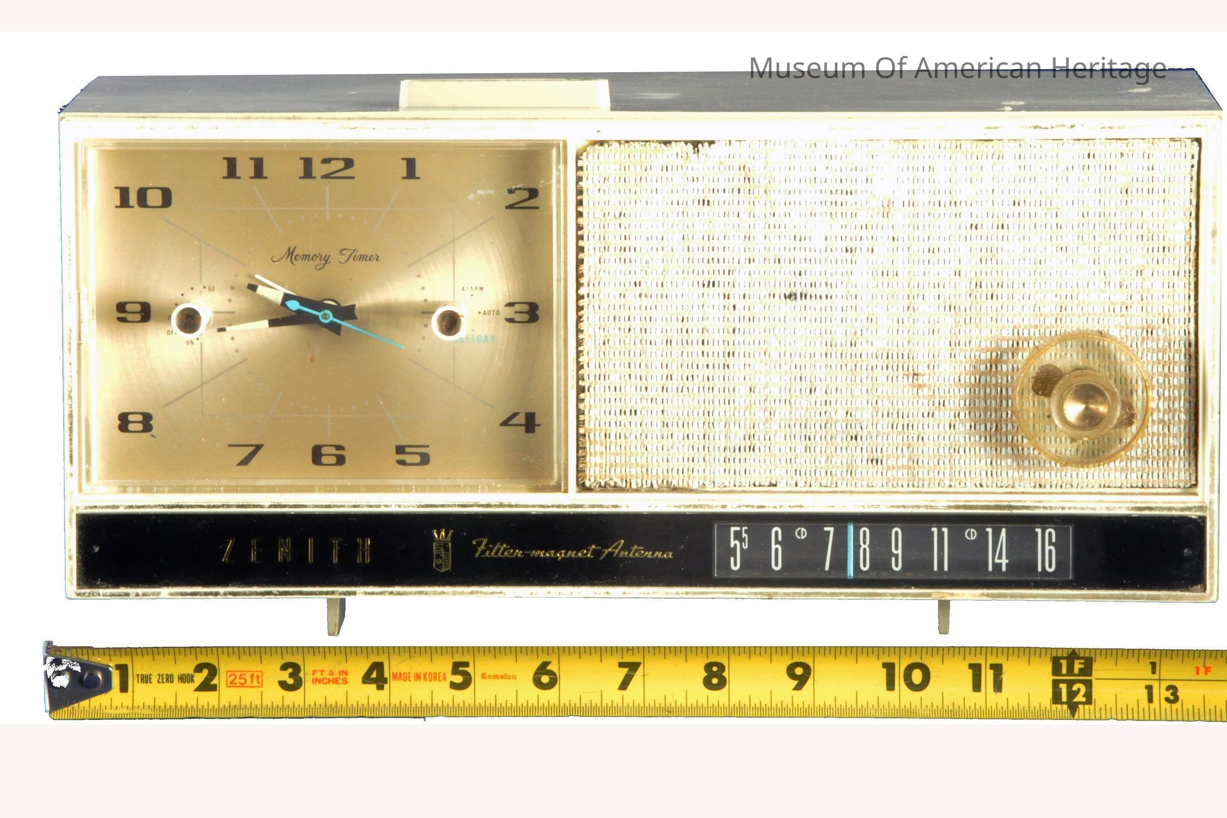 Filter Magnet Antenna, plastic body, cloth speaker face, alarm knob, clock face on/off knob.