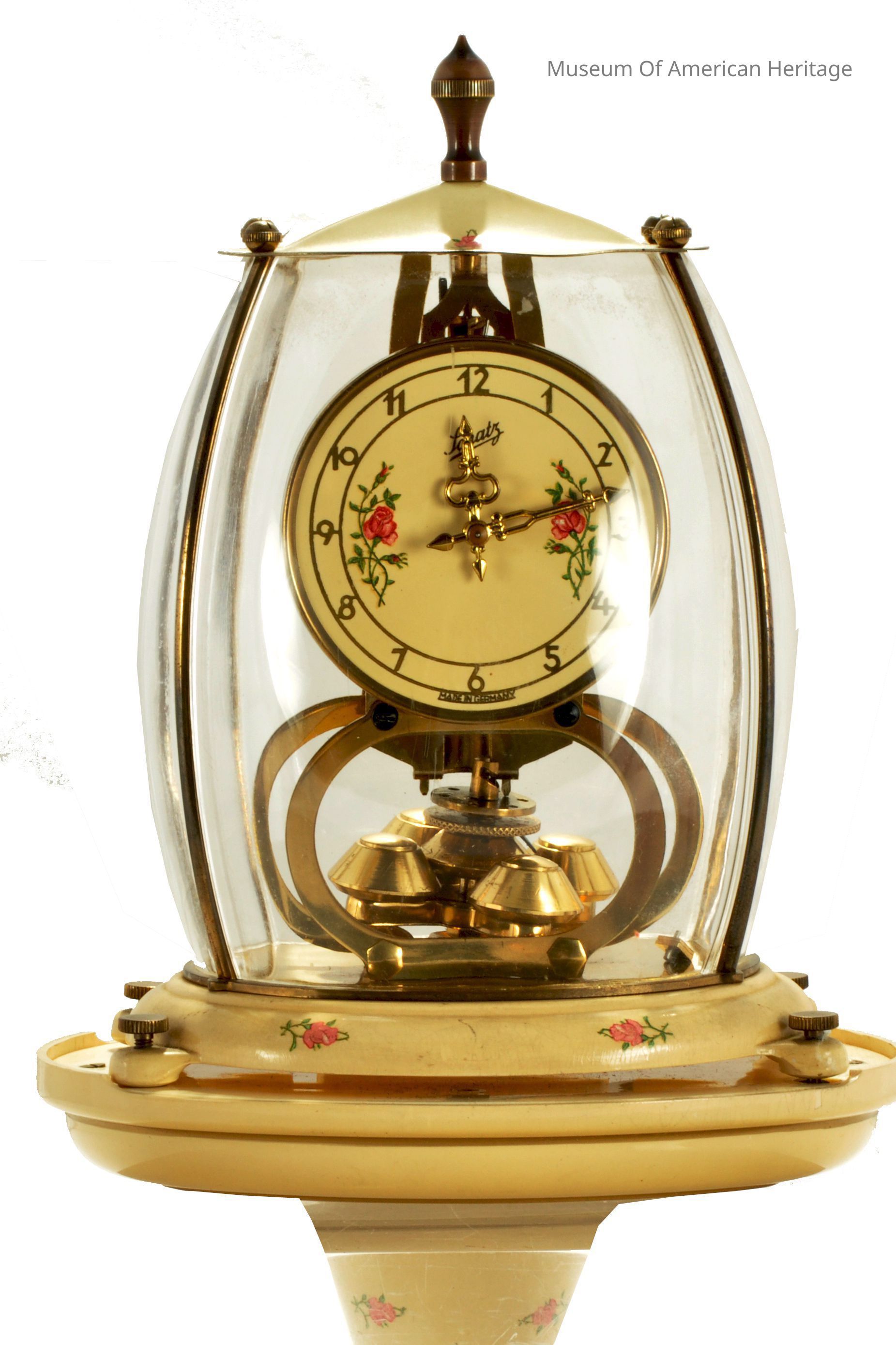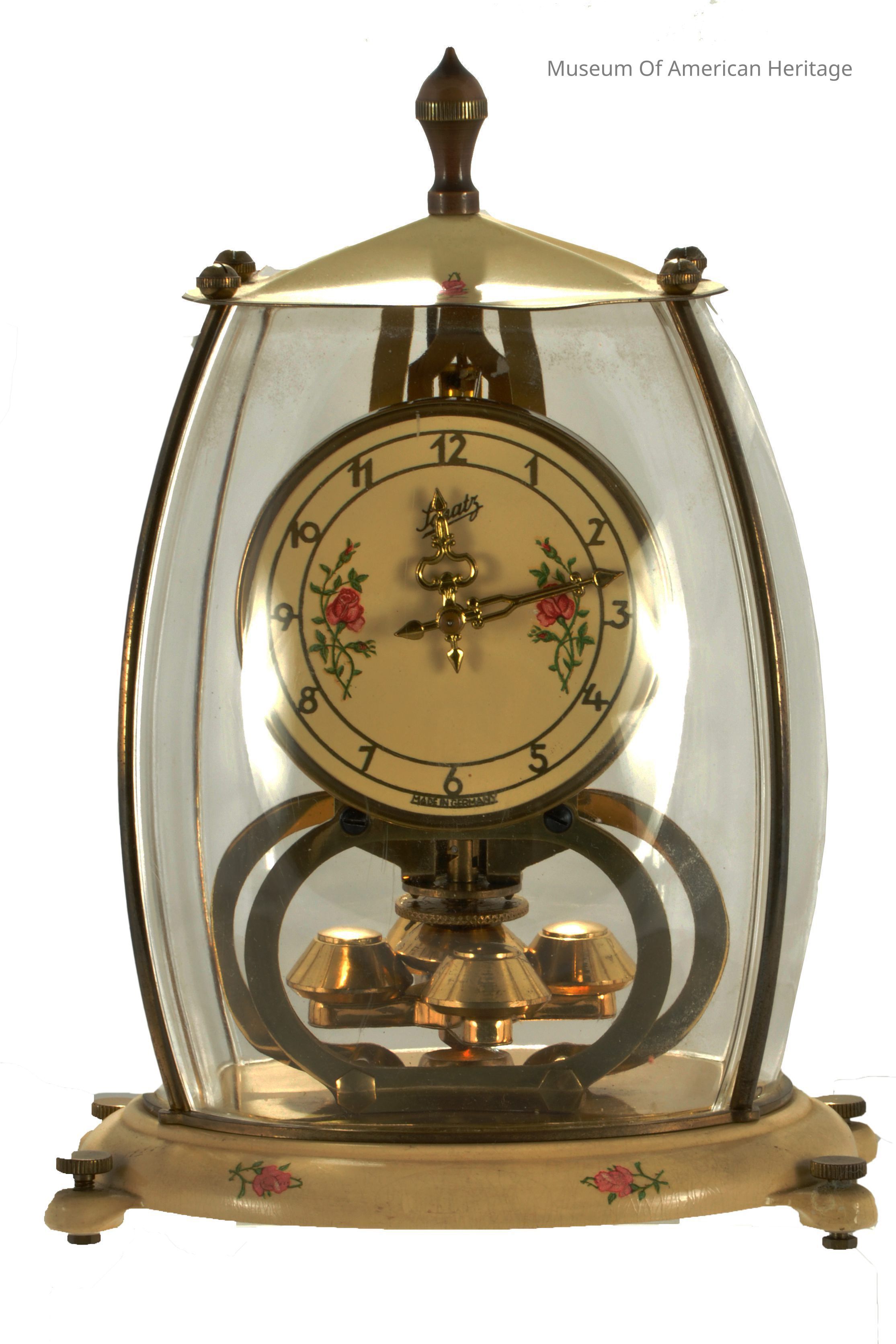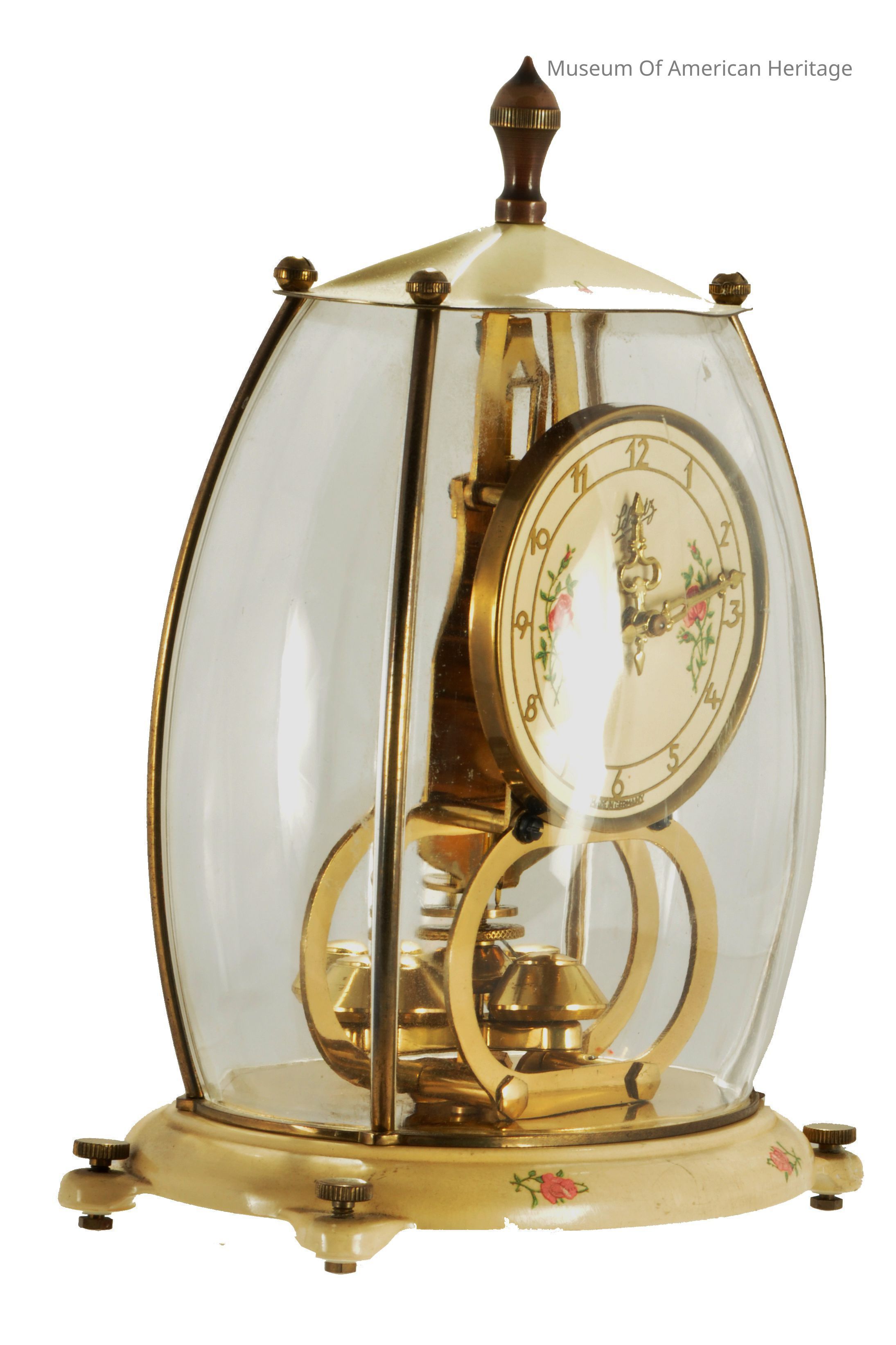 Plastic base w/metal top, glass body, four posts, finial on top, floral design on face, plastic wall mount bracket.