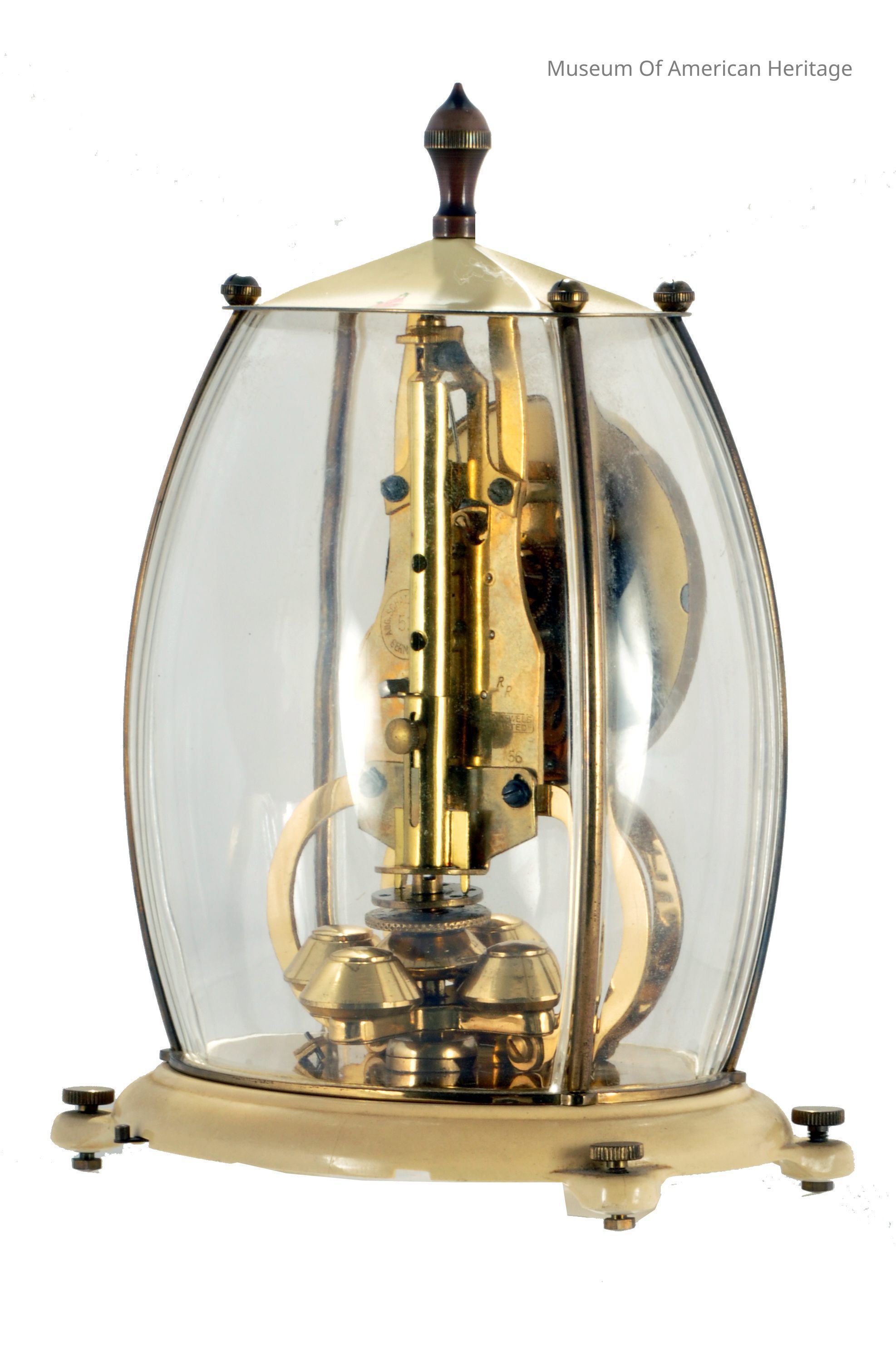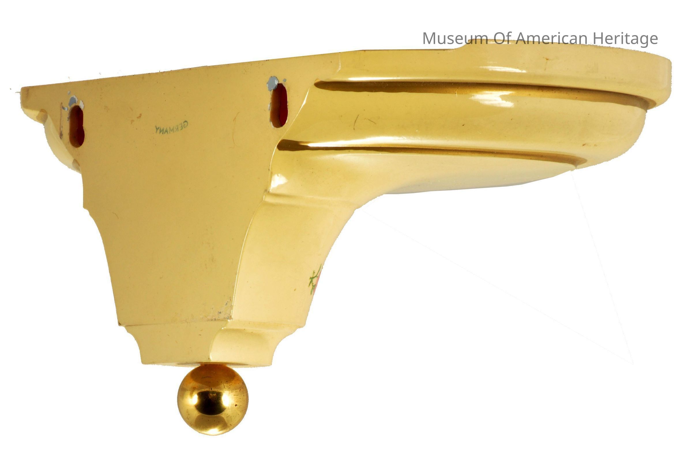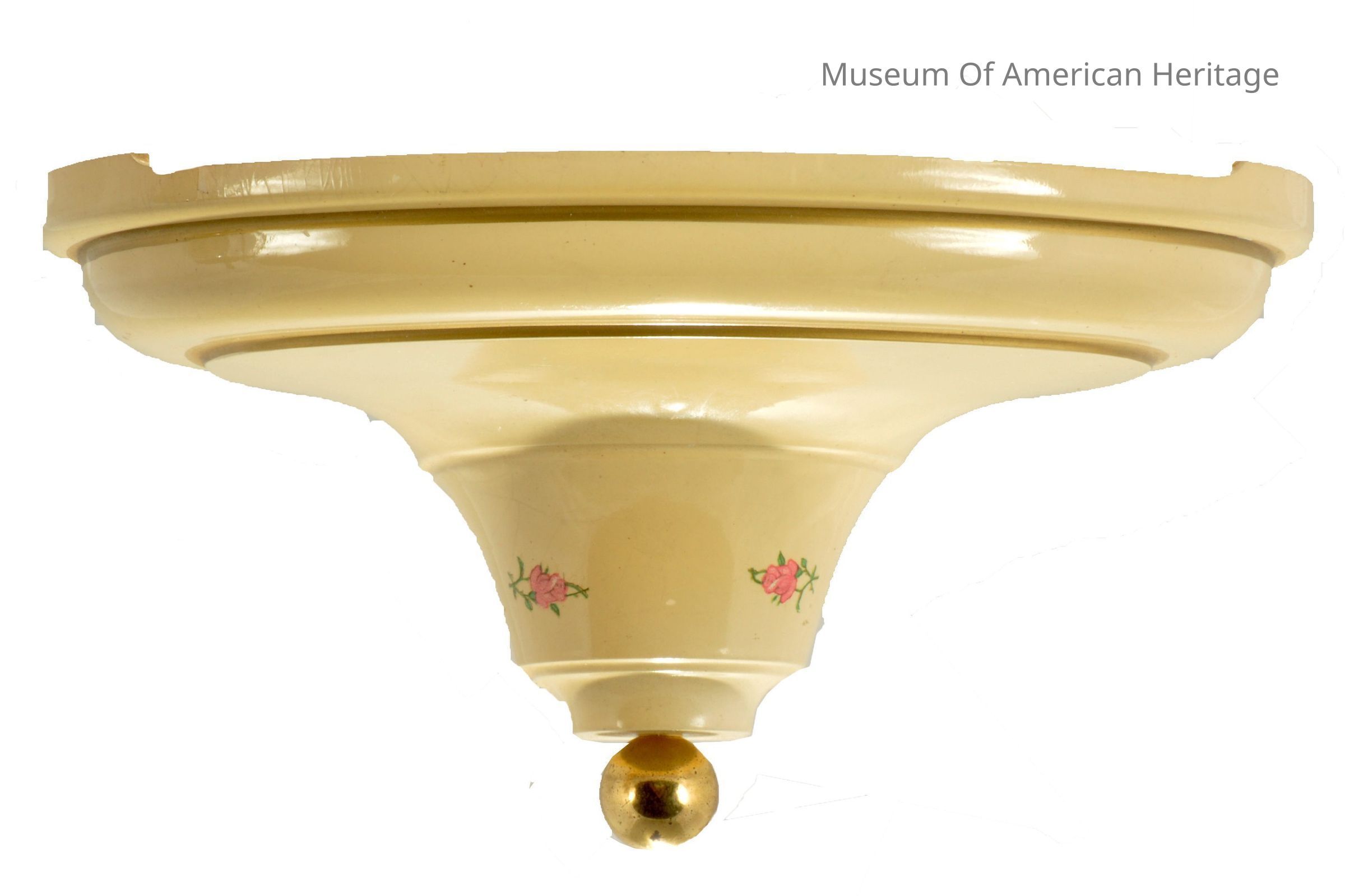 Plastic base w/metal top, glass body, four posts, finial on top, floral design on face, plastic wall mount bracket.
