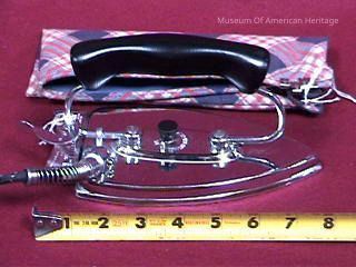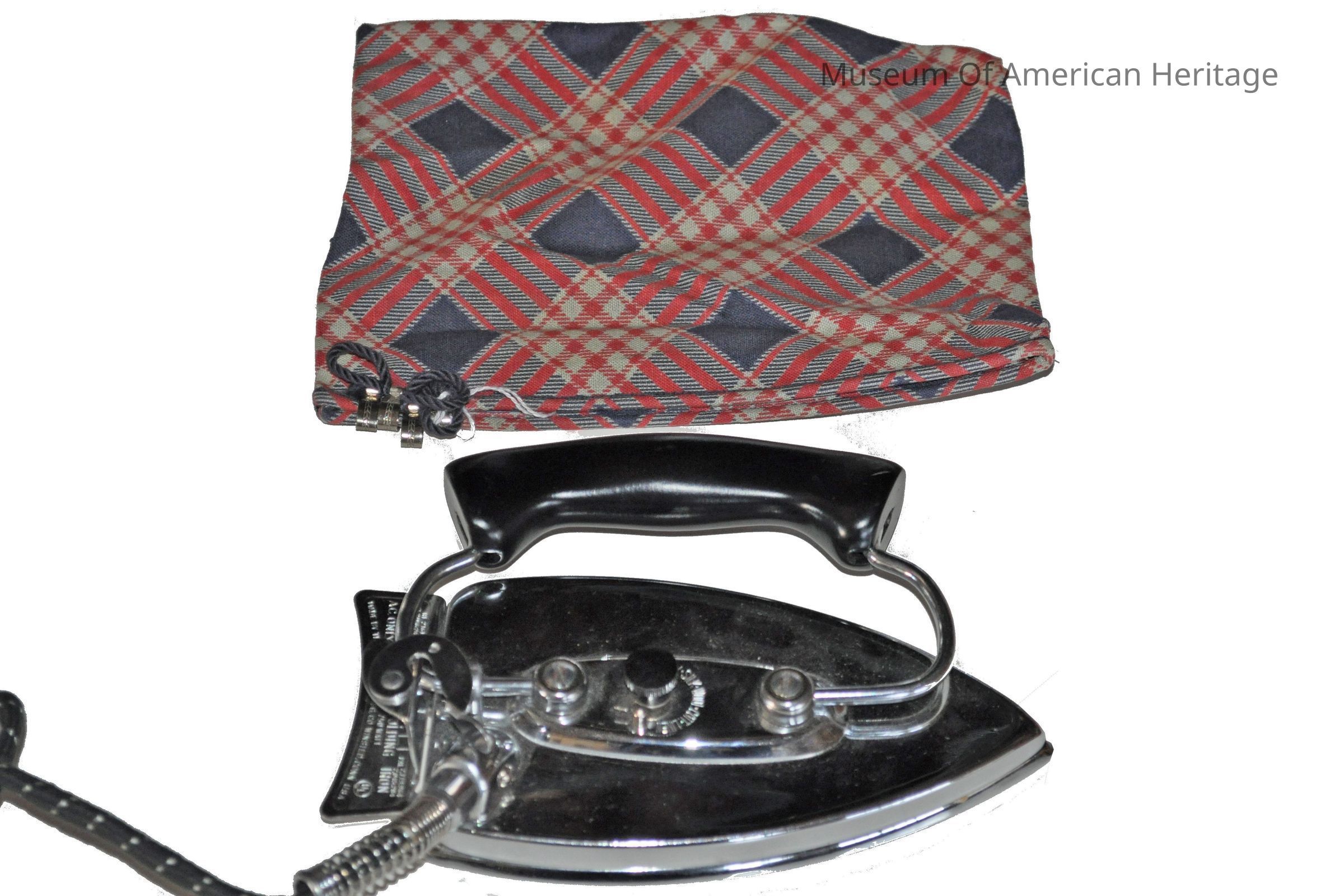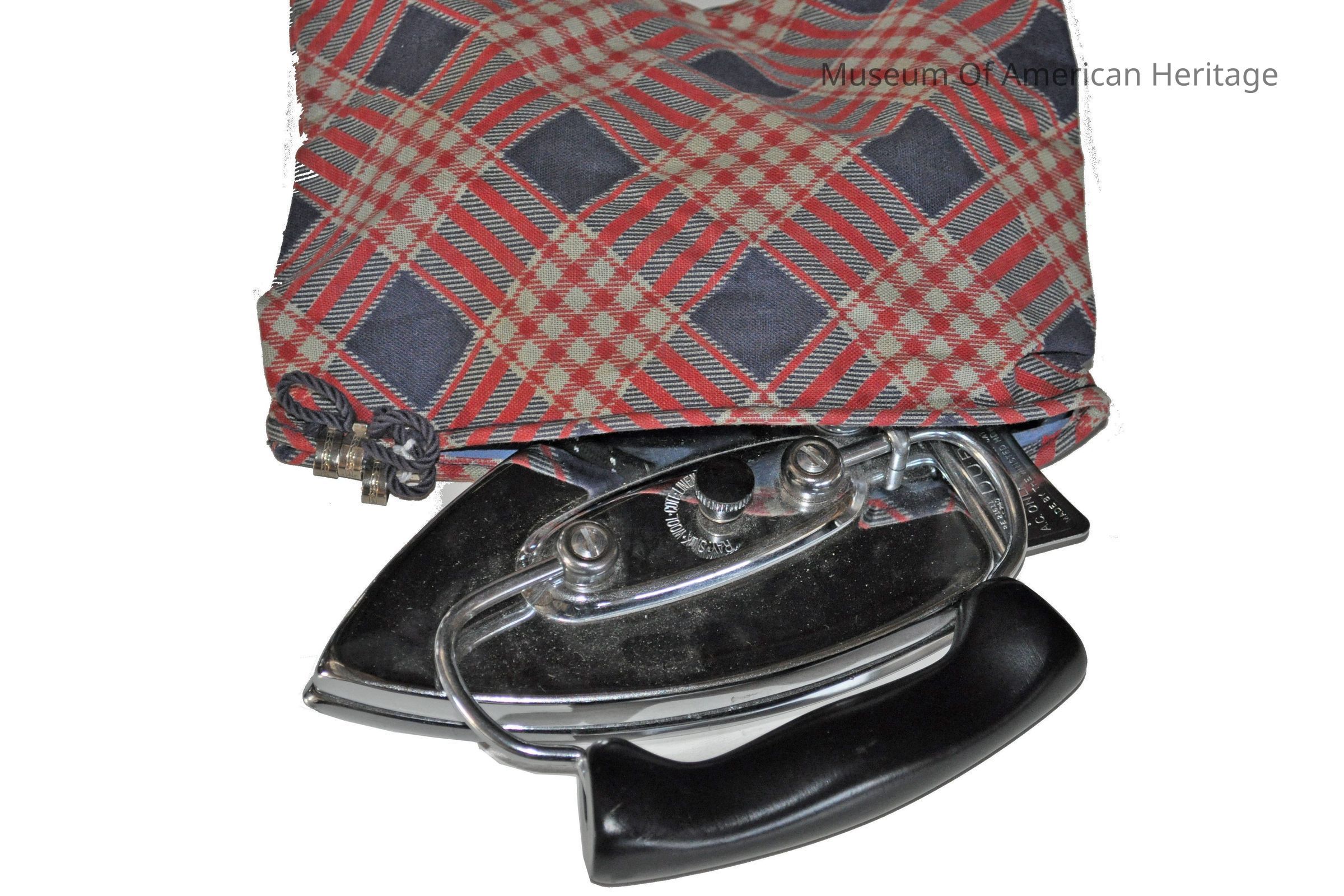 Electric w/cord, handle folds down, travel iron in plaid bag, fabric adjustment.