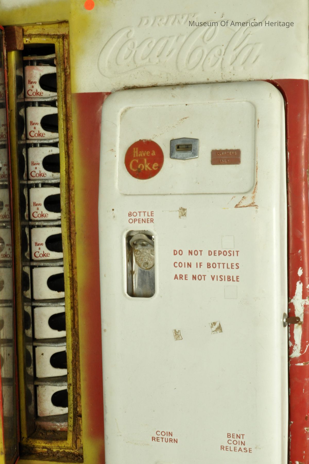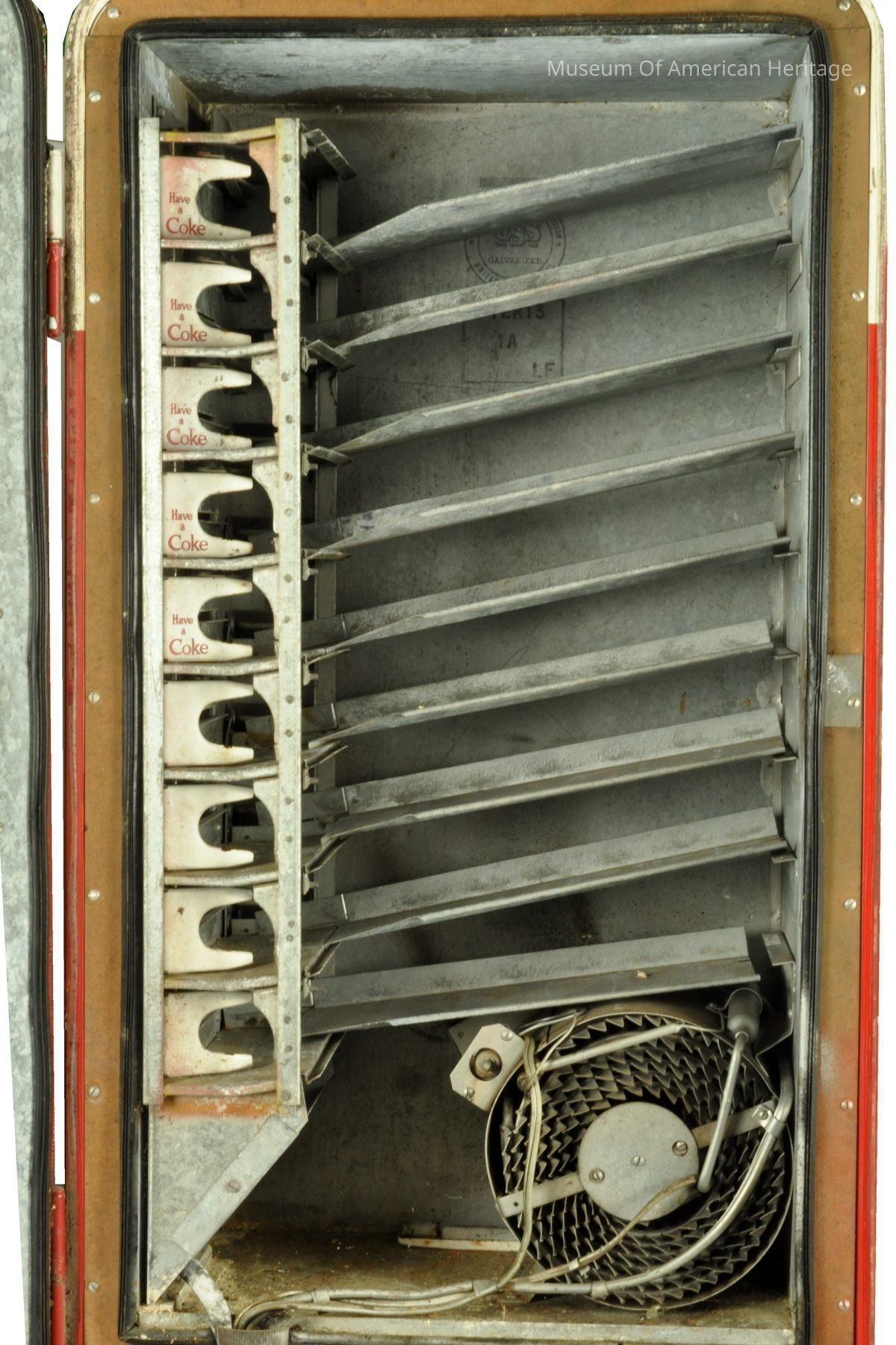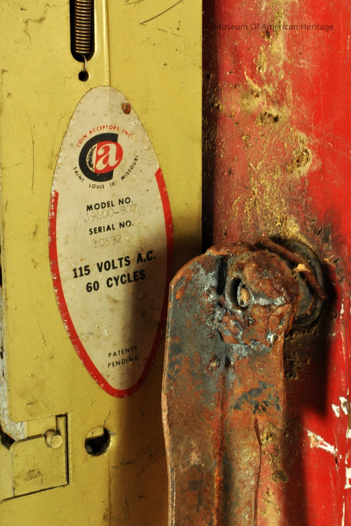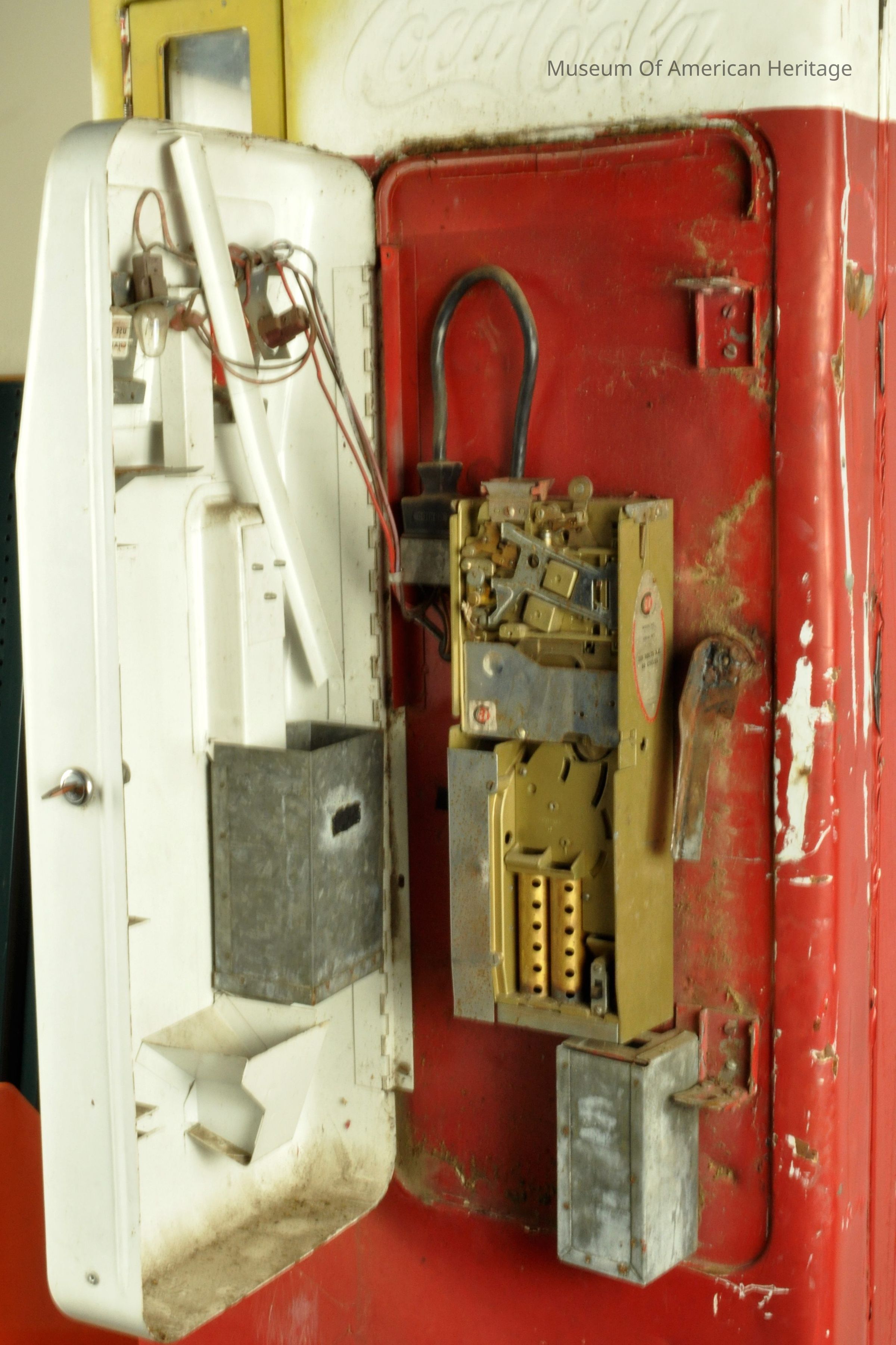 Coin return and bottle opener, coin slot, bent coin release, 9 coke slides to server, motor & refrigerator compressor, galvanized steel interior, Coin Acceptors Inc. J9400-807 S/N 10532, St. Louis, MO.