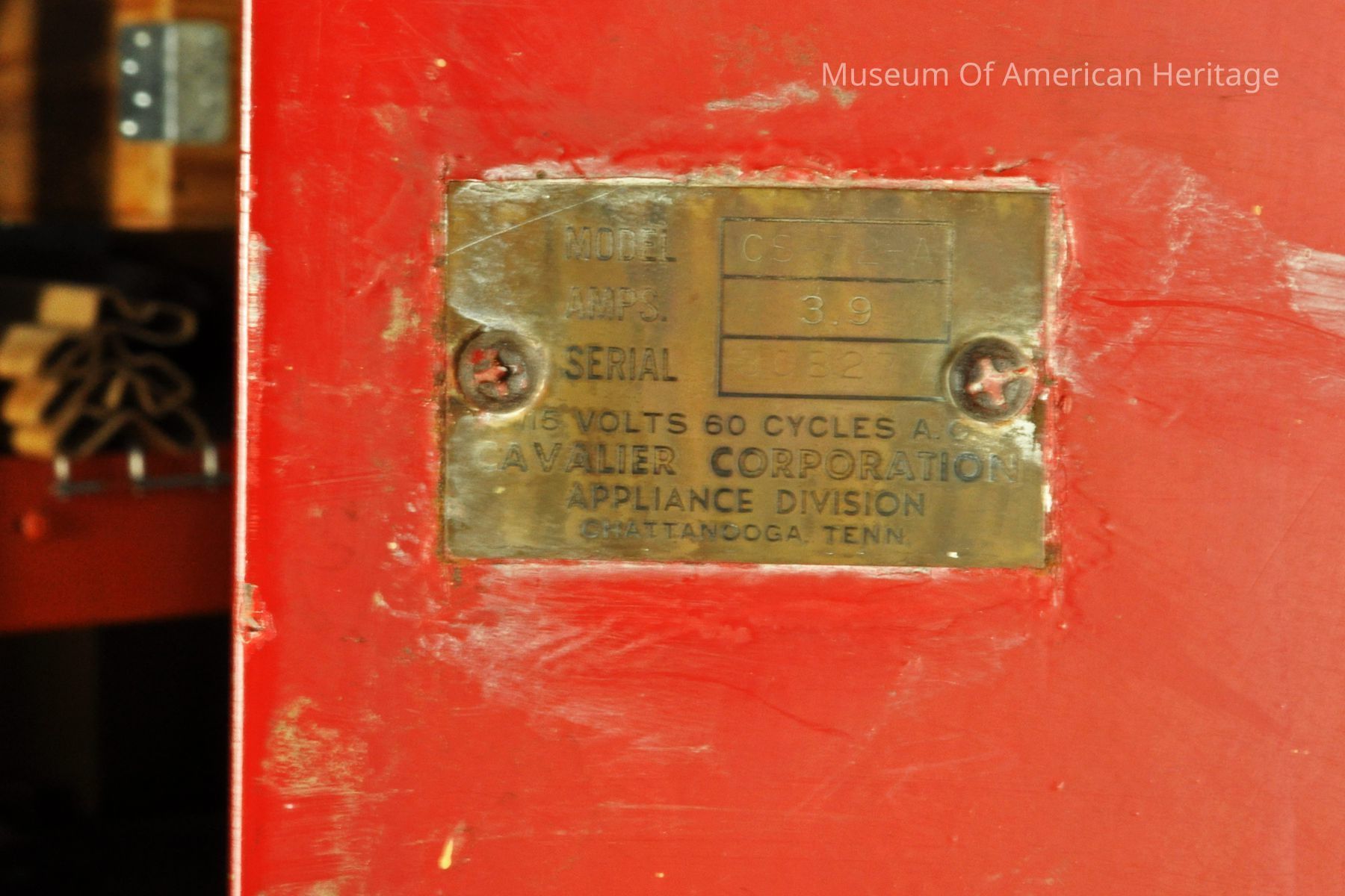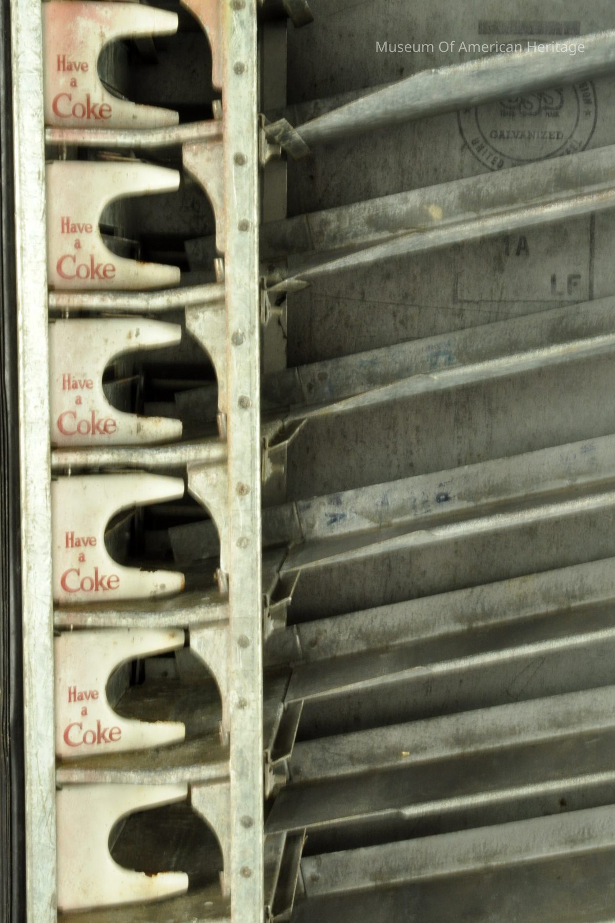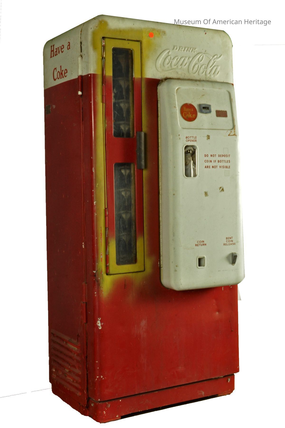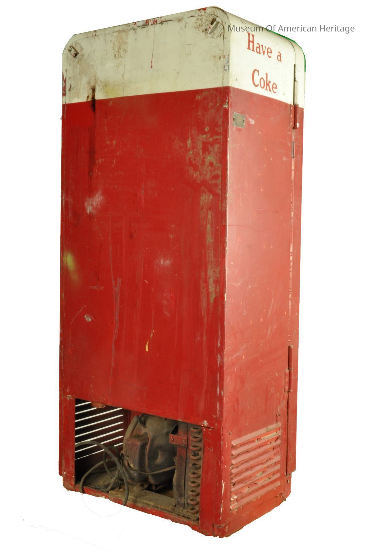 Coin return and bottle opener, coin slot, bent coin release, 9 coke slides to server, motor & refrigerator compressor, galvanized steel interior, Coin Acceptors Inc. J9400-807 S/N 10532, St. Louis, MO.