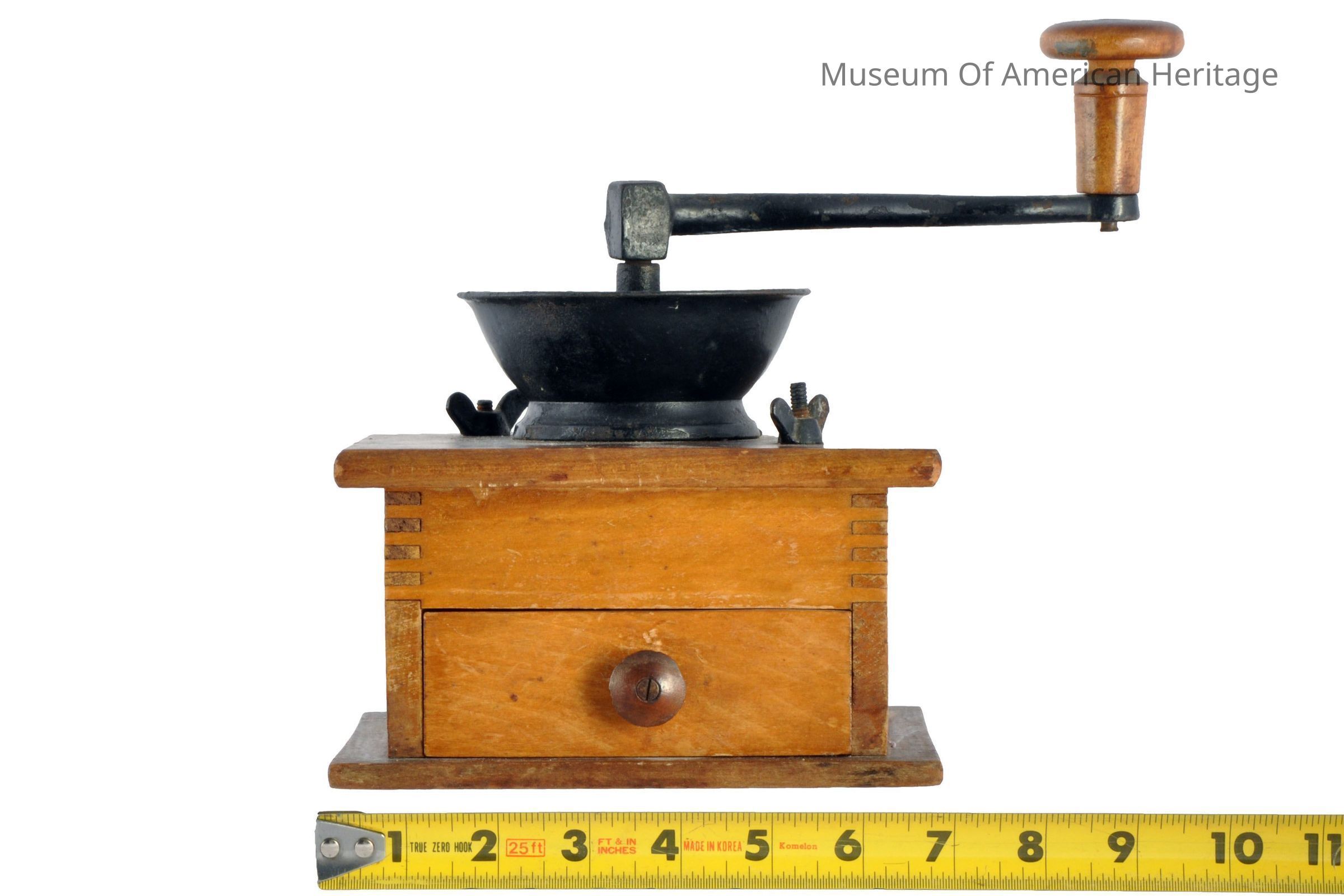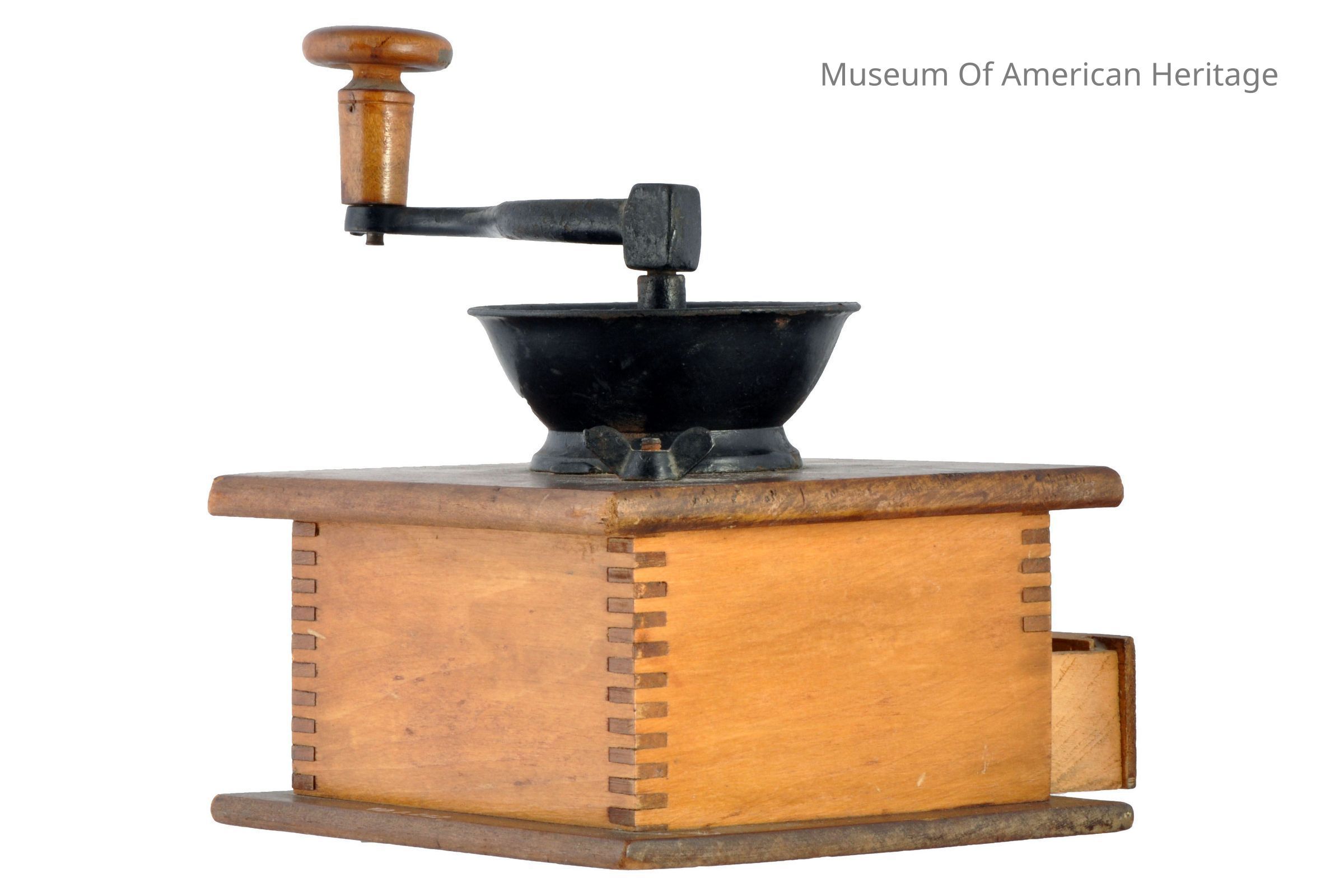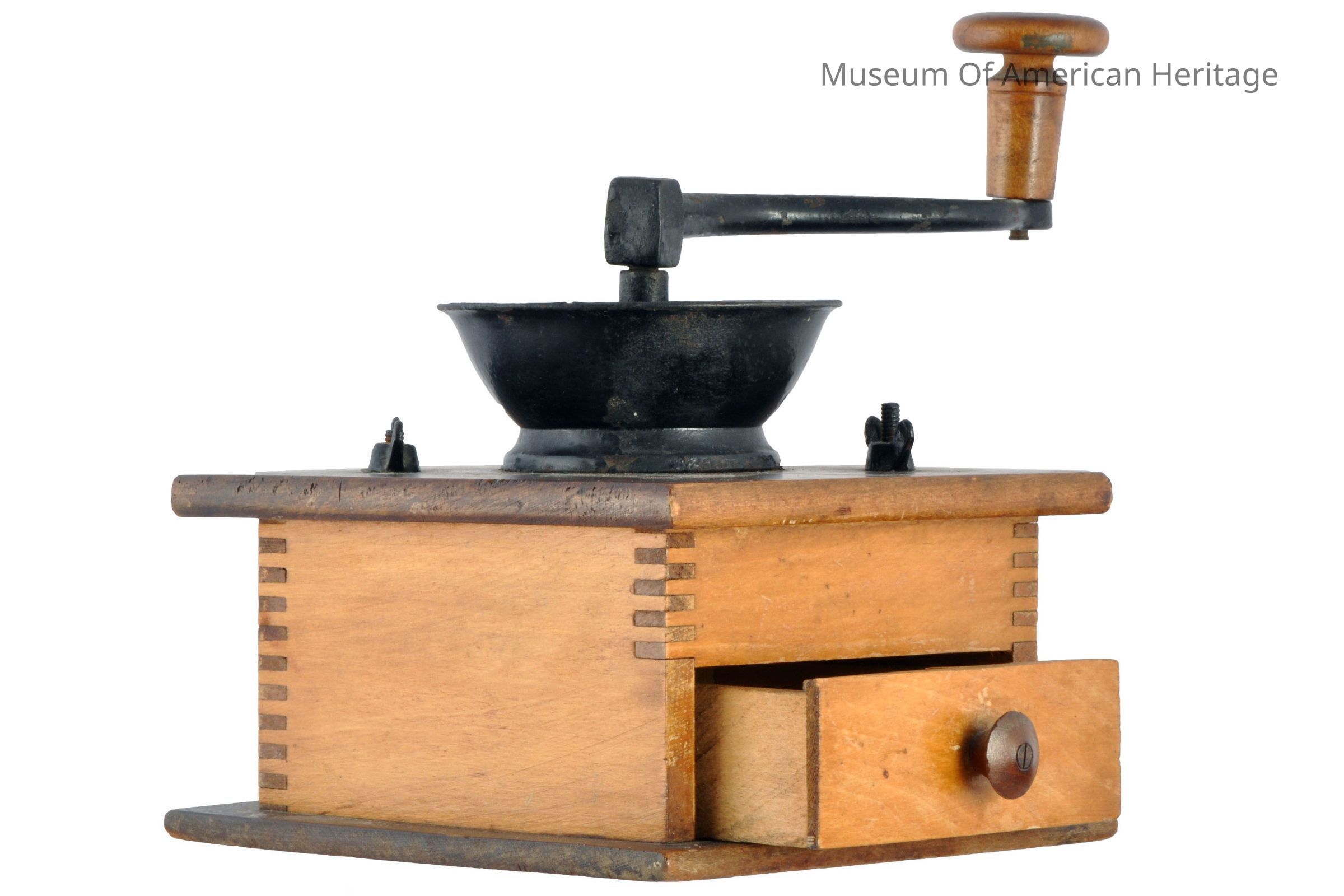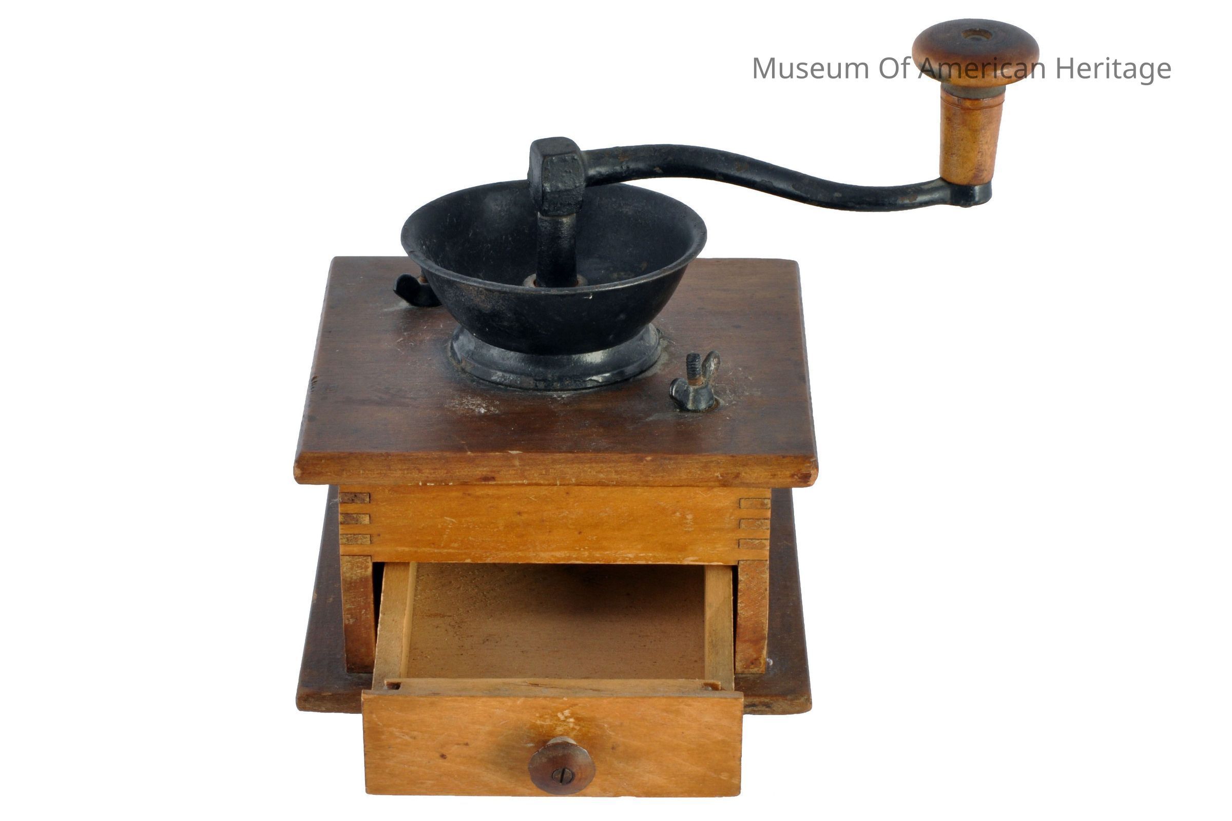 Wood box w/drawer, wood top screws onto box, bowel shaped metal filling receptacle, metal grinder handle.