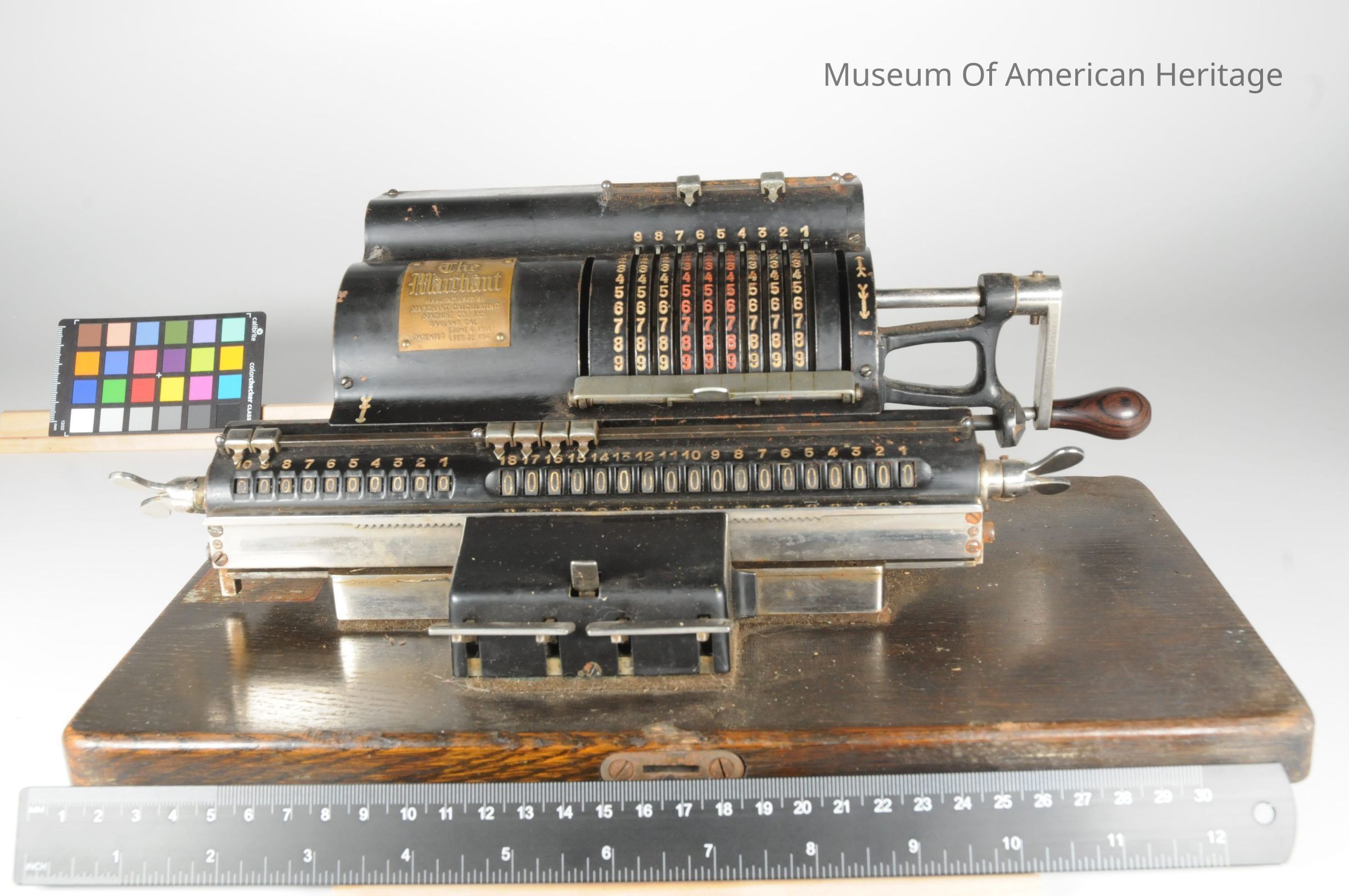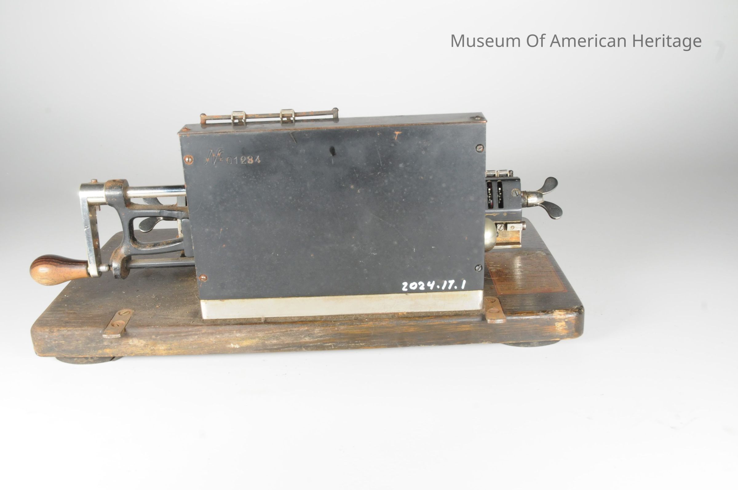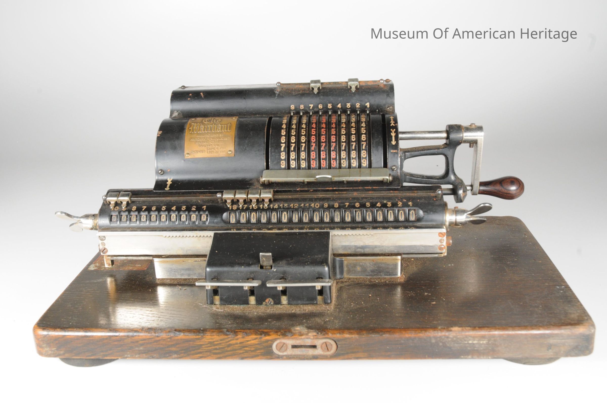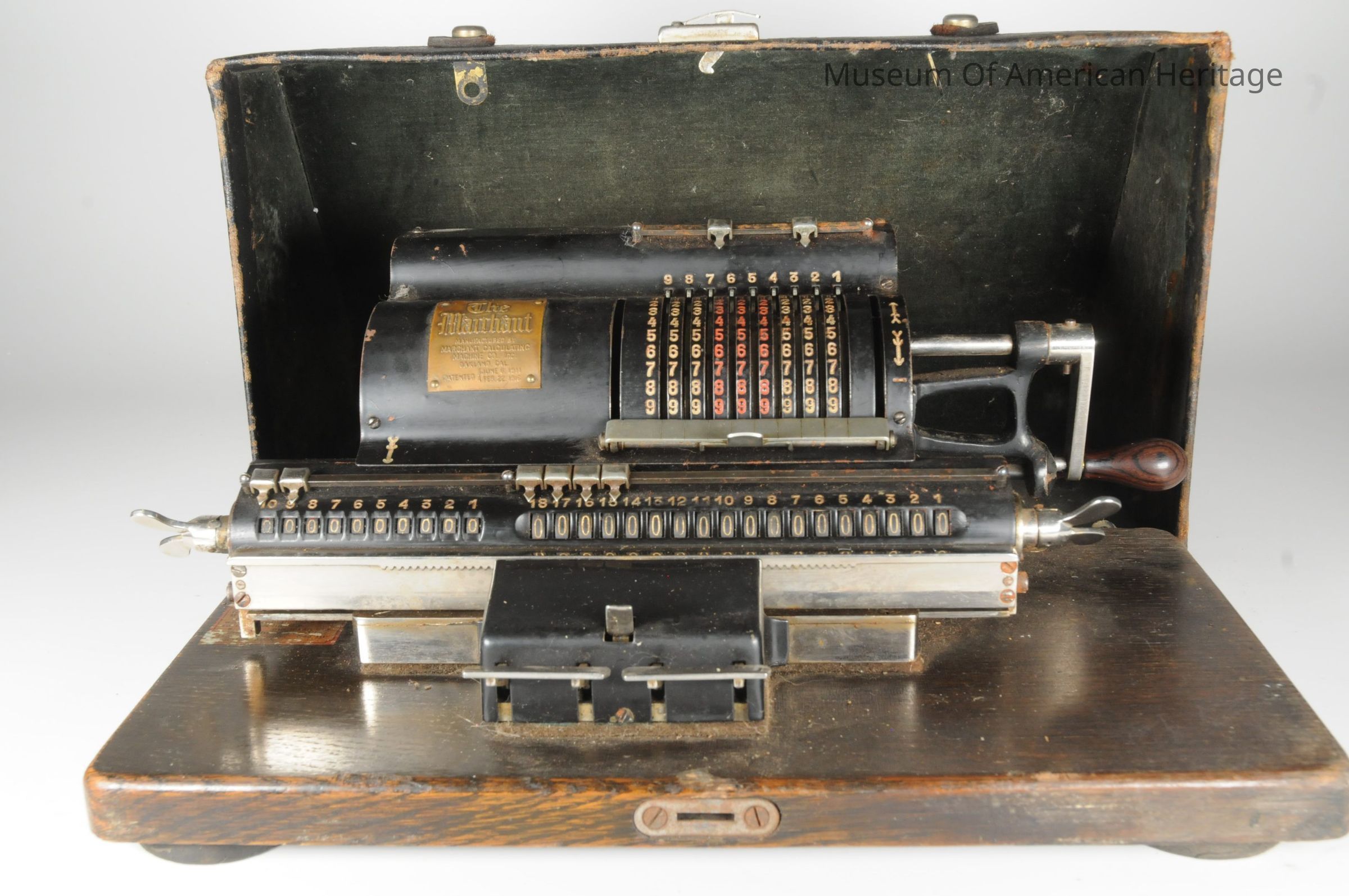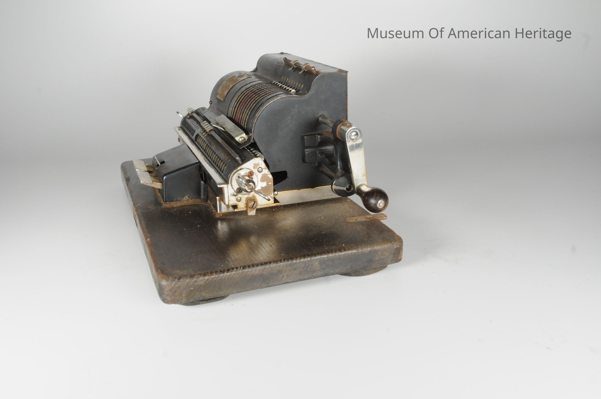 Shift left and shift right levers. Rotating handle to perform the add or subtract. Thumbscrews to reset to zero. On original wooden base and in original metal box.