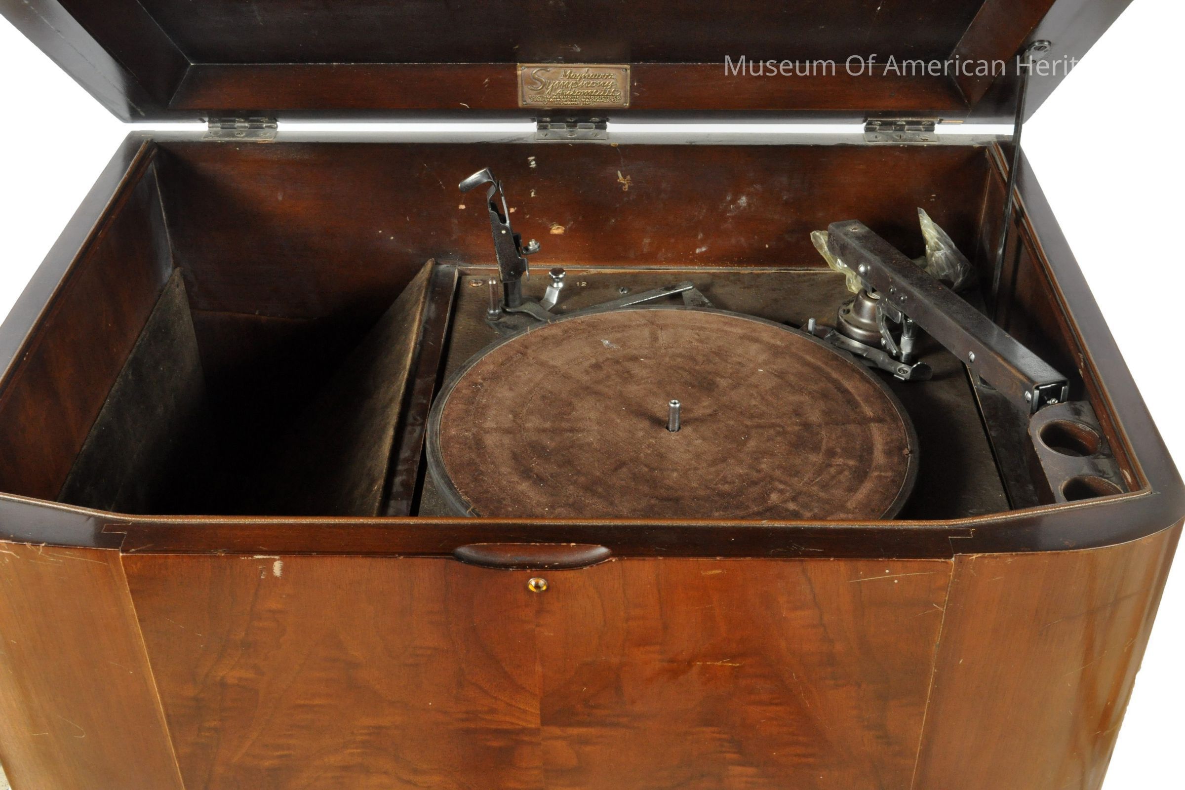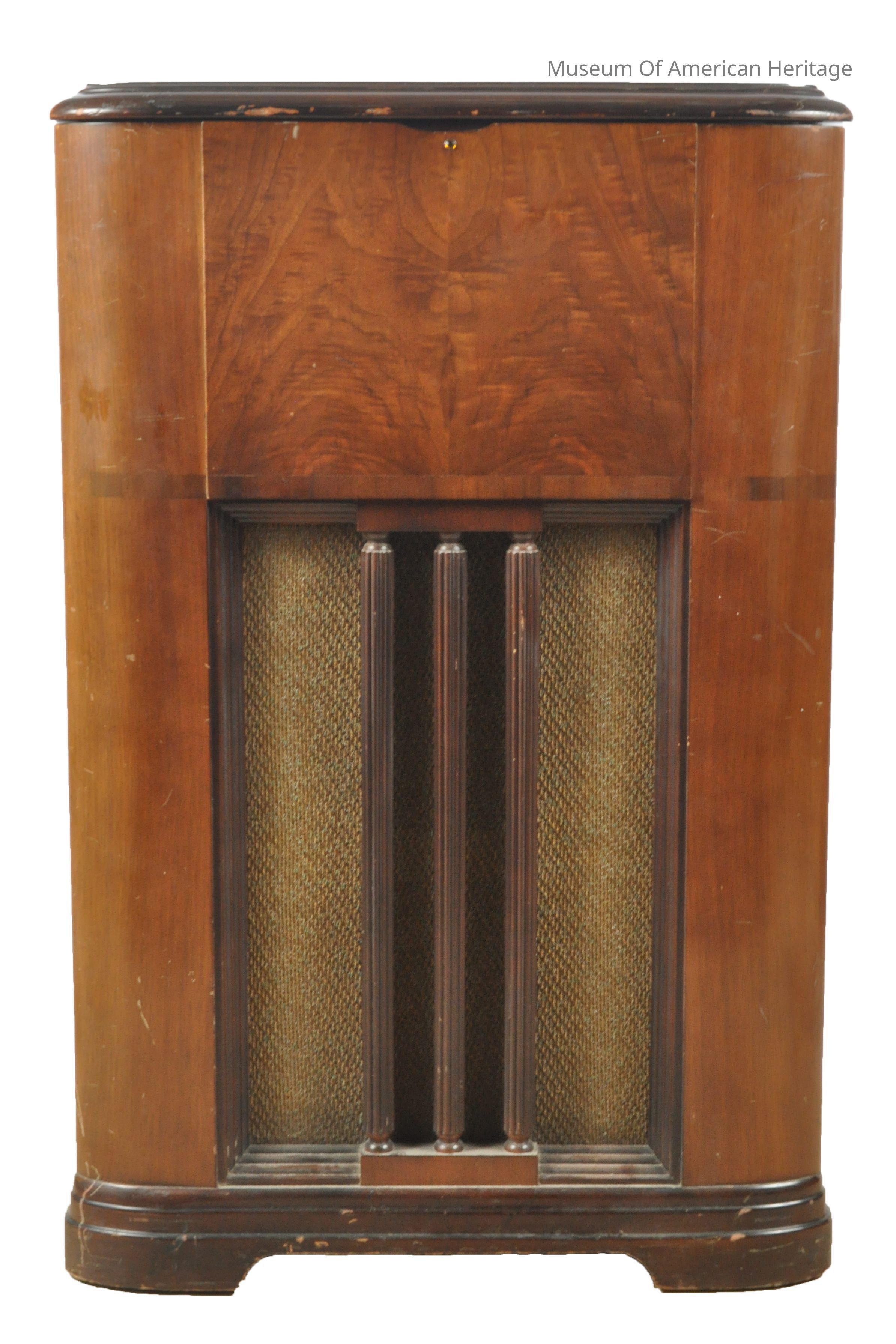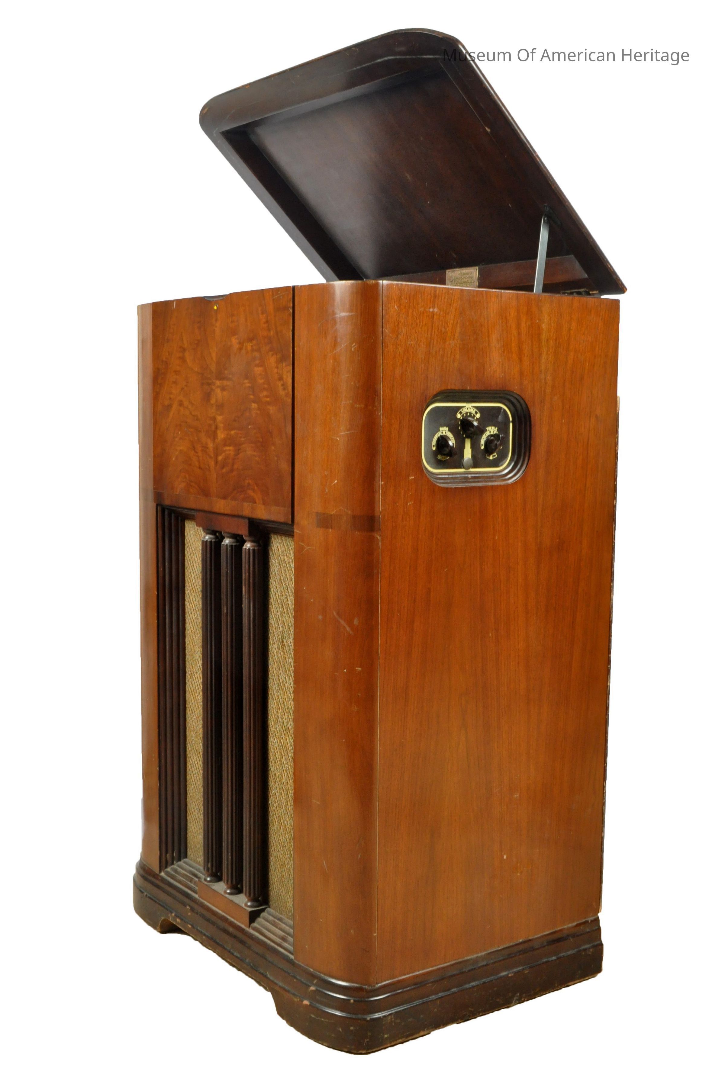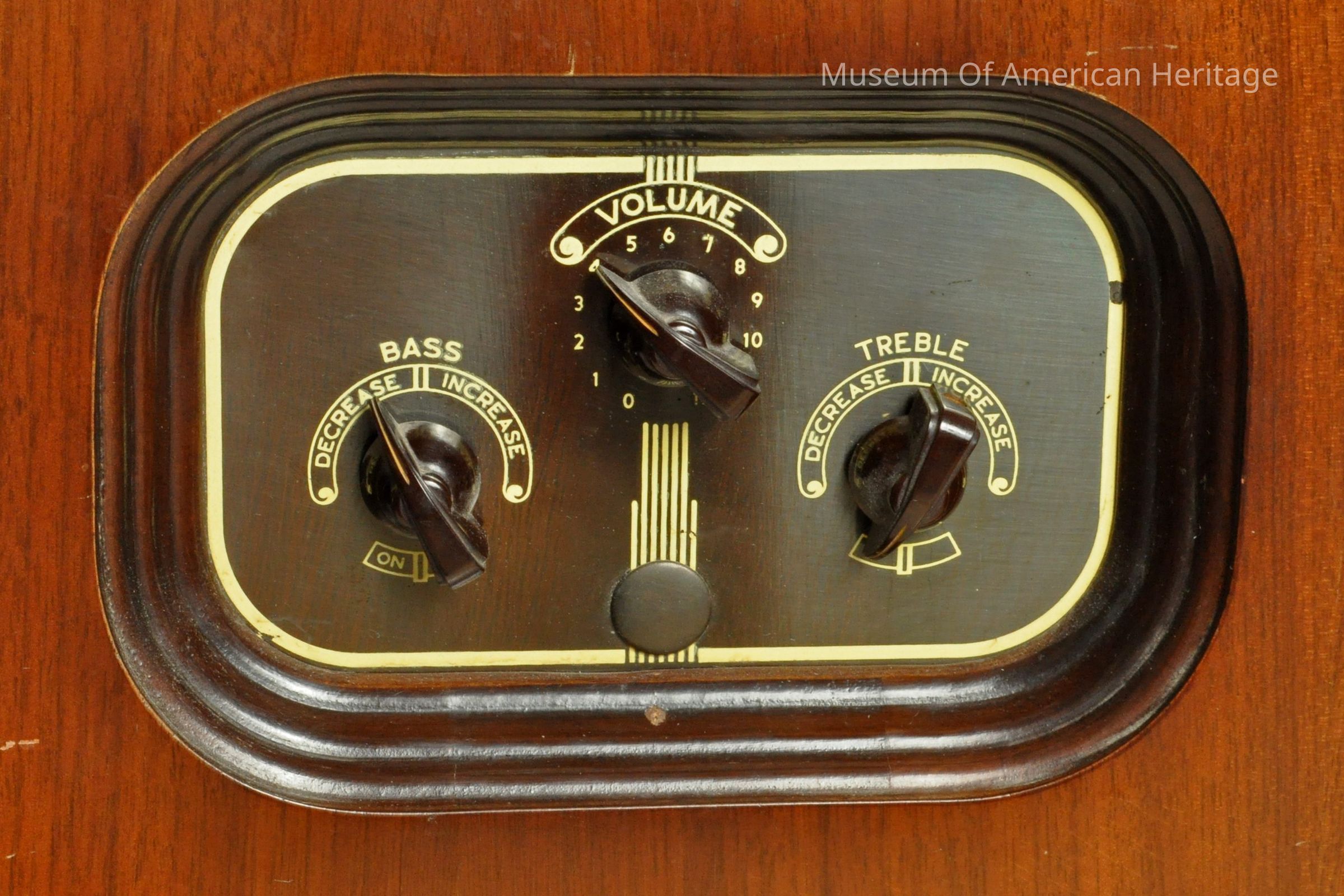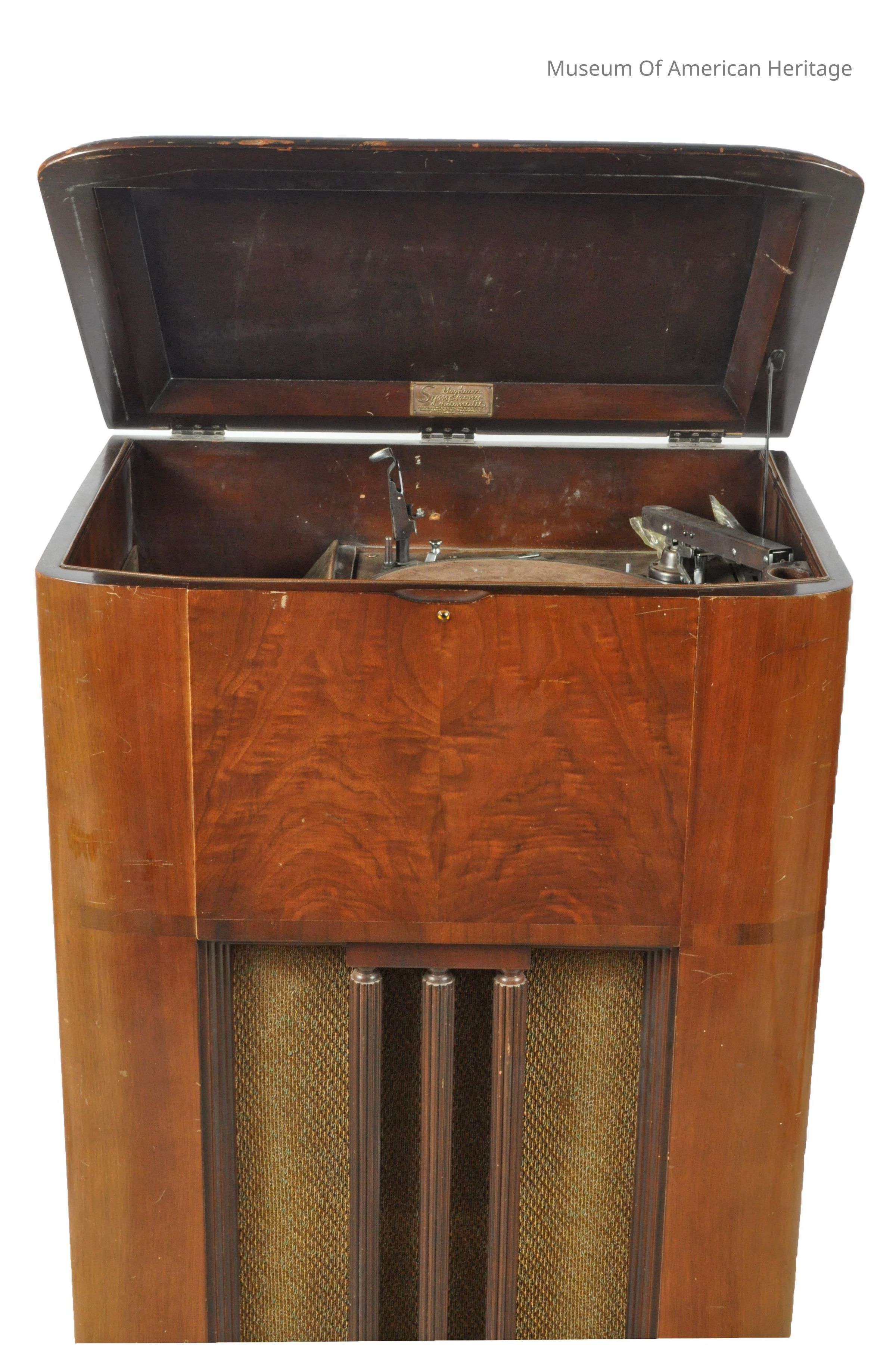 Bass and treble controls, 115v ac 60 Hz, 175 watts, first hi-fi console record player by Magnavox, Walnut cabinet.