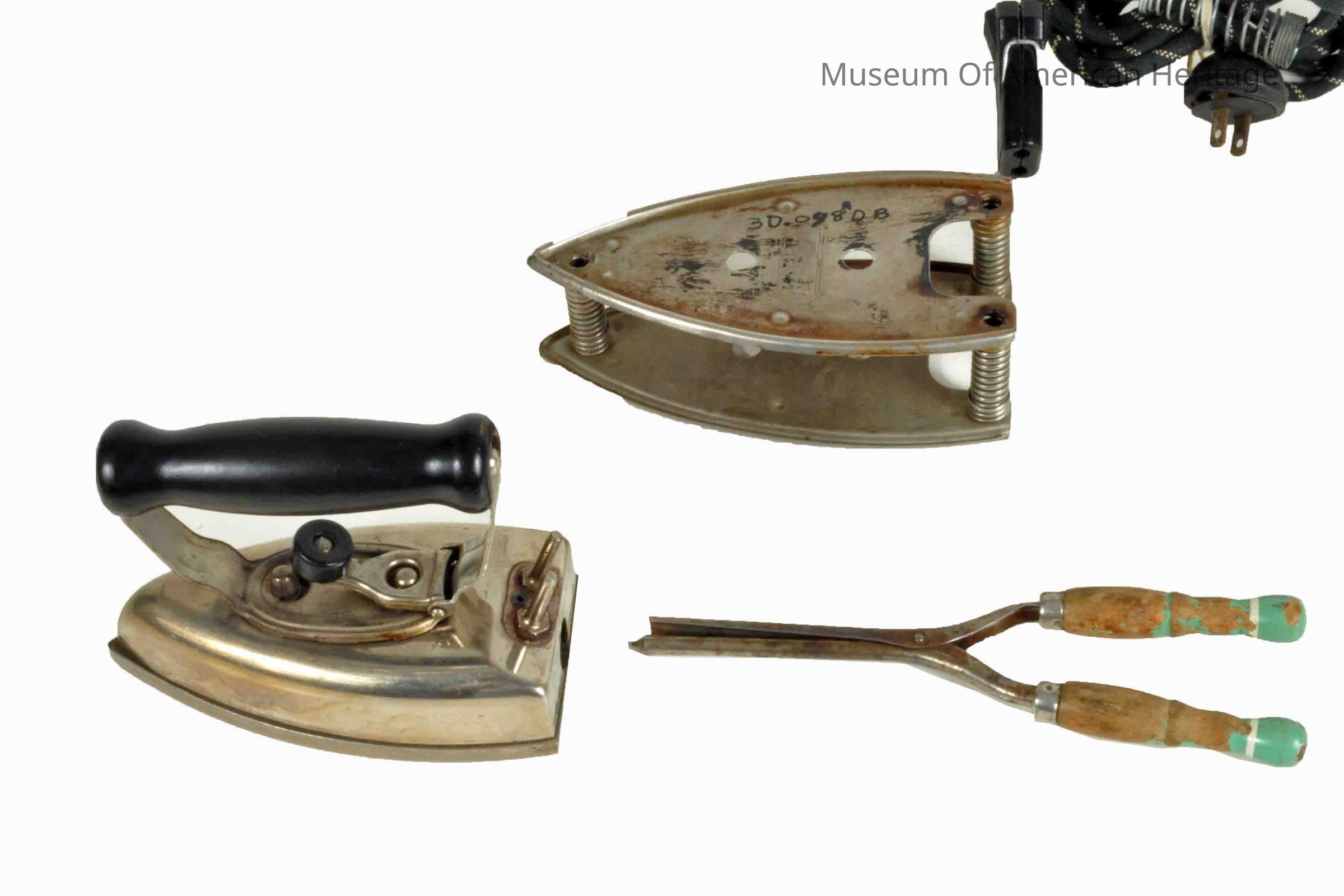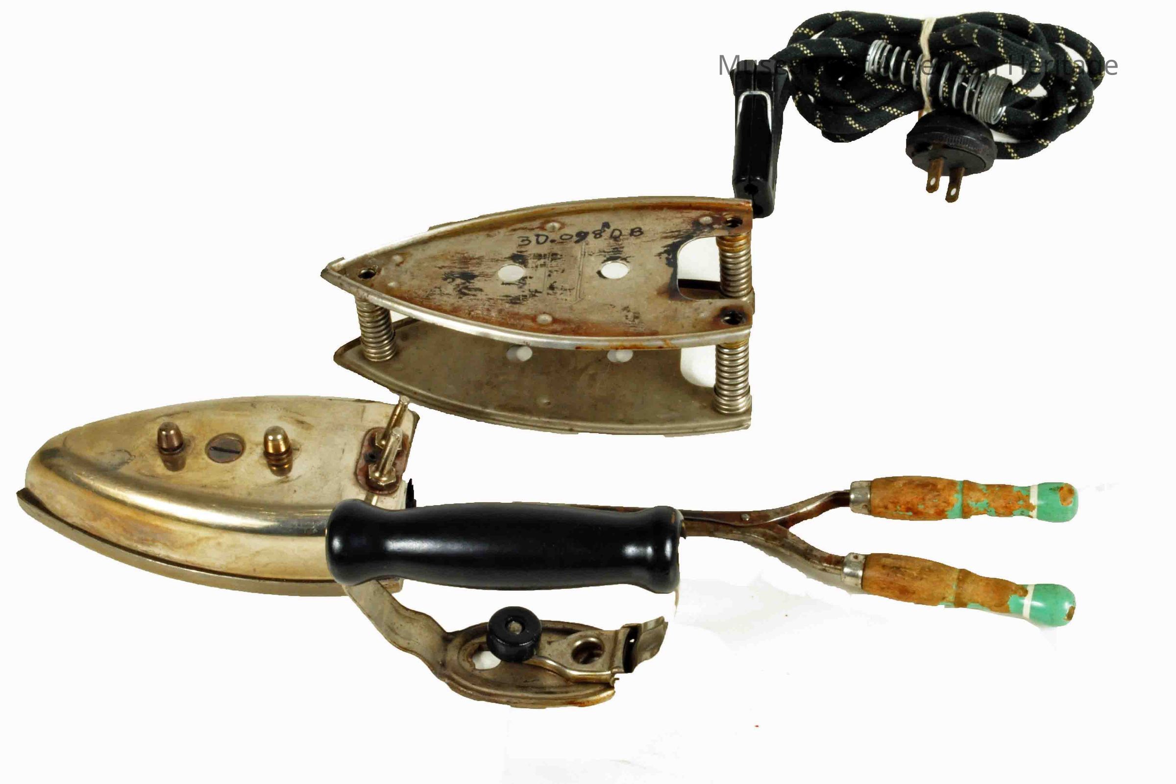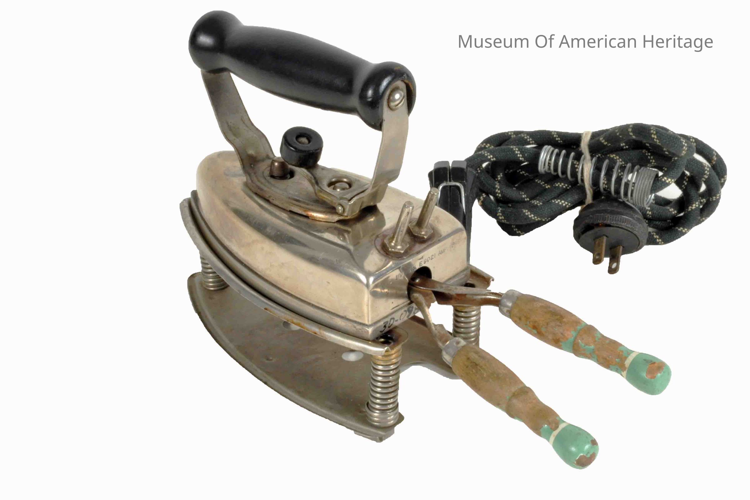 Flat pressing iron, w/curling iron, 110v ac,3.18 amps with cord, curling iron inserts into back of flat iron, detachable handle.