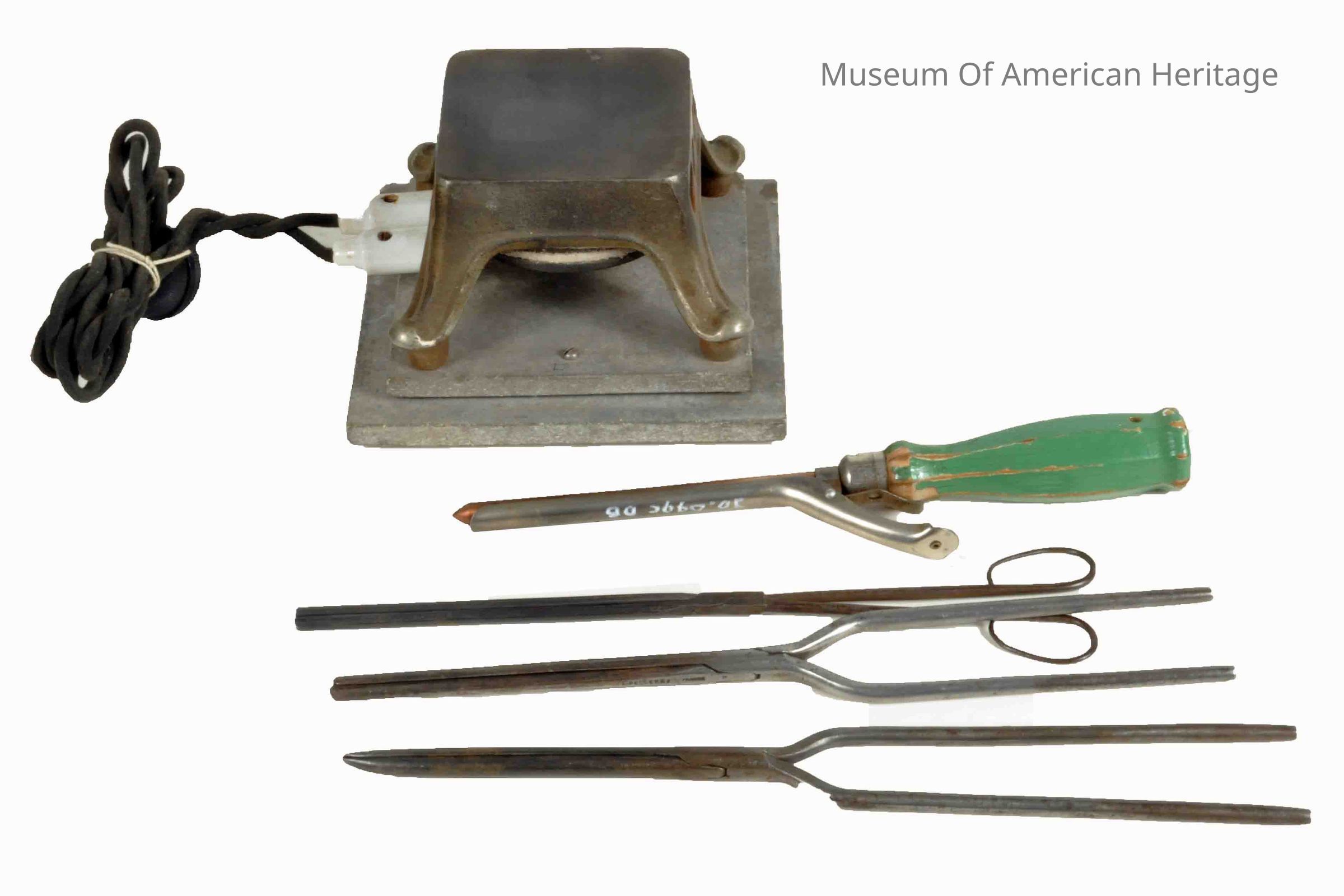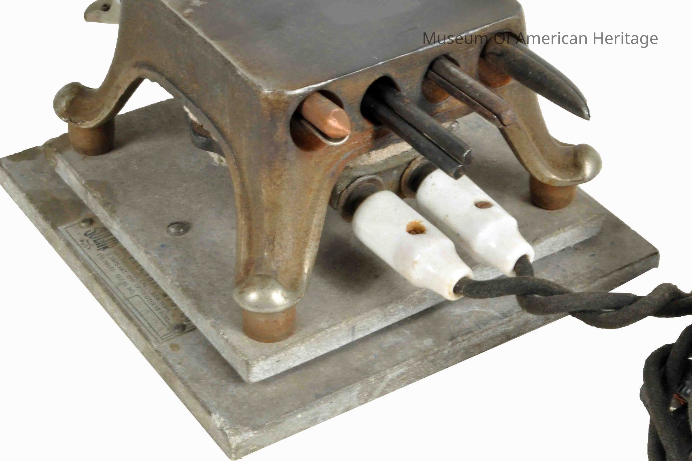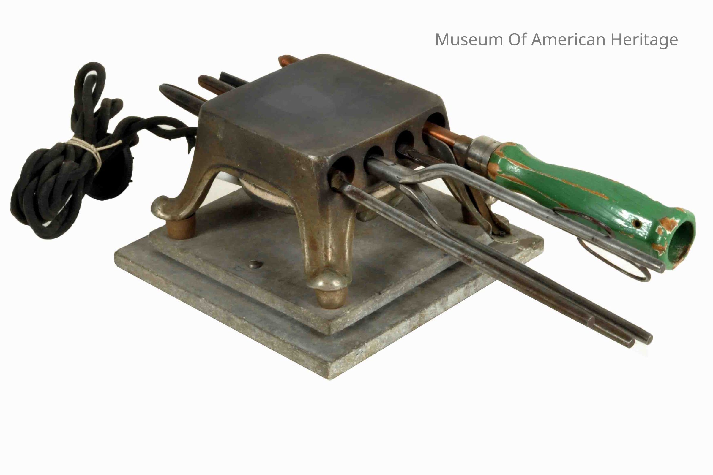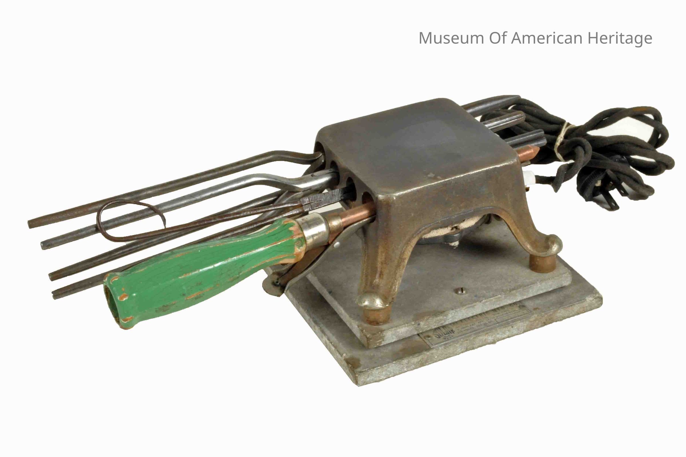 Pat #17723, 115 volts ac, detachable electric cord, holds 4 curling irons (included), mounted on Transite base.