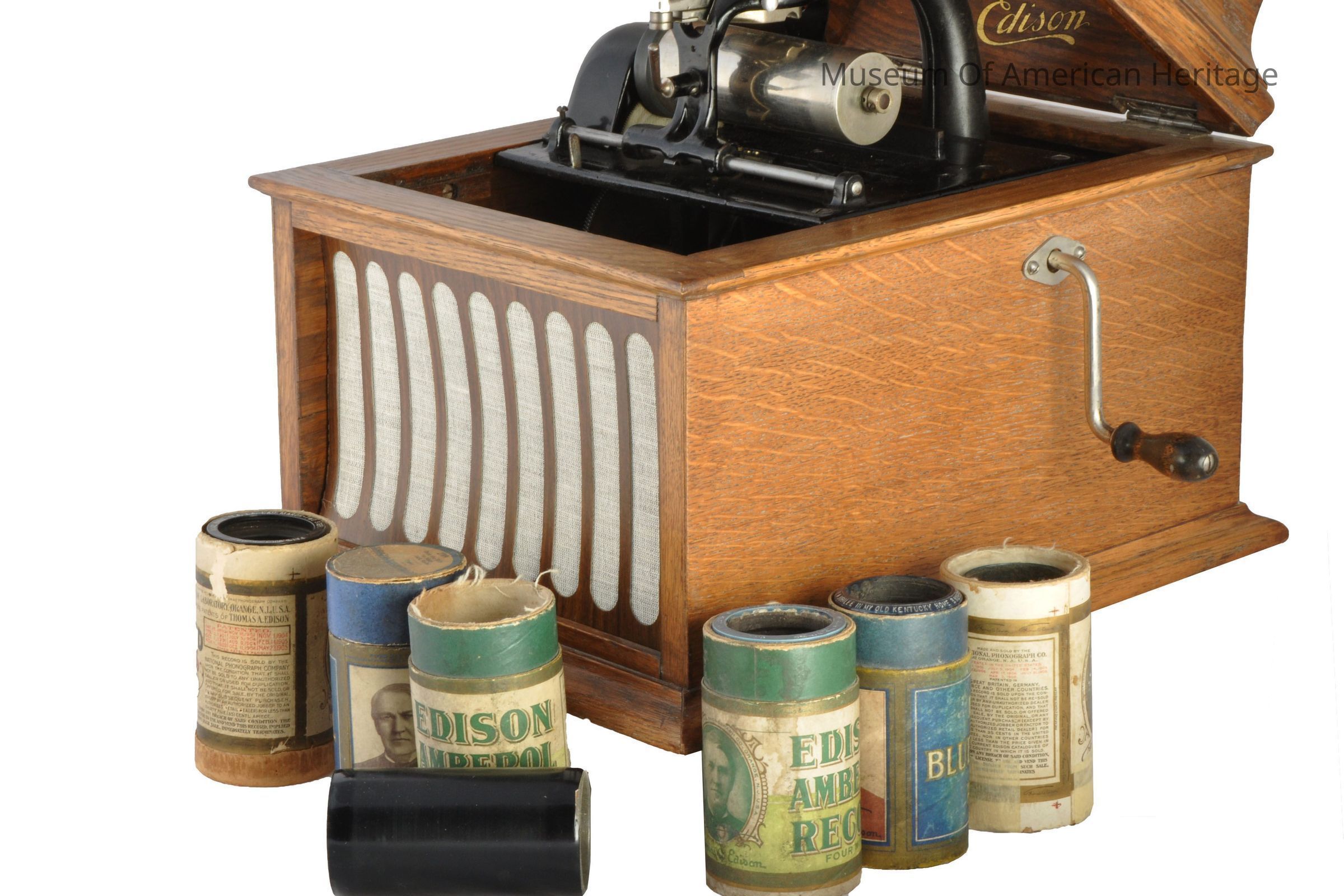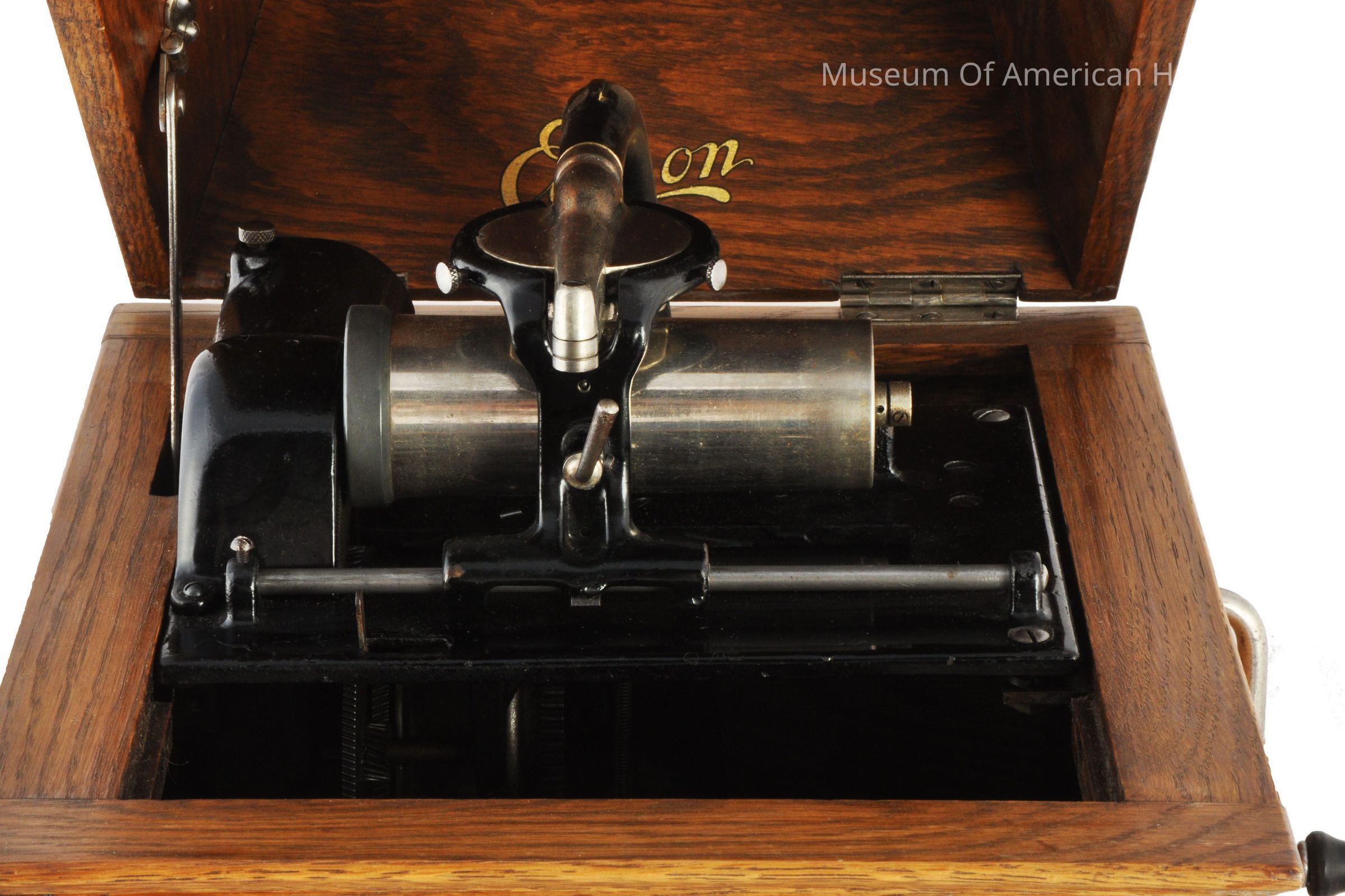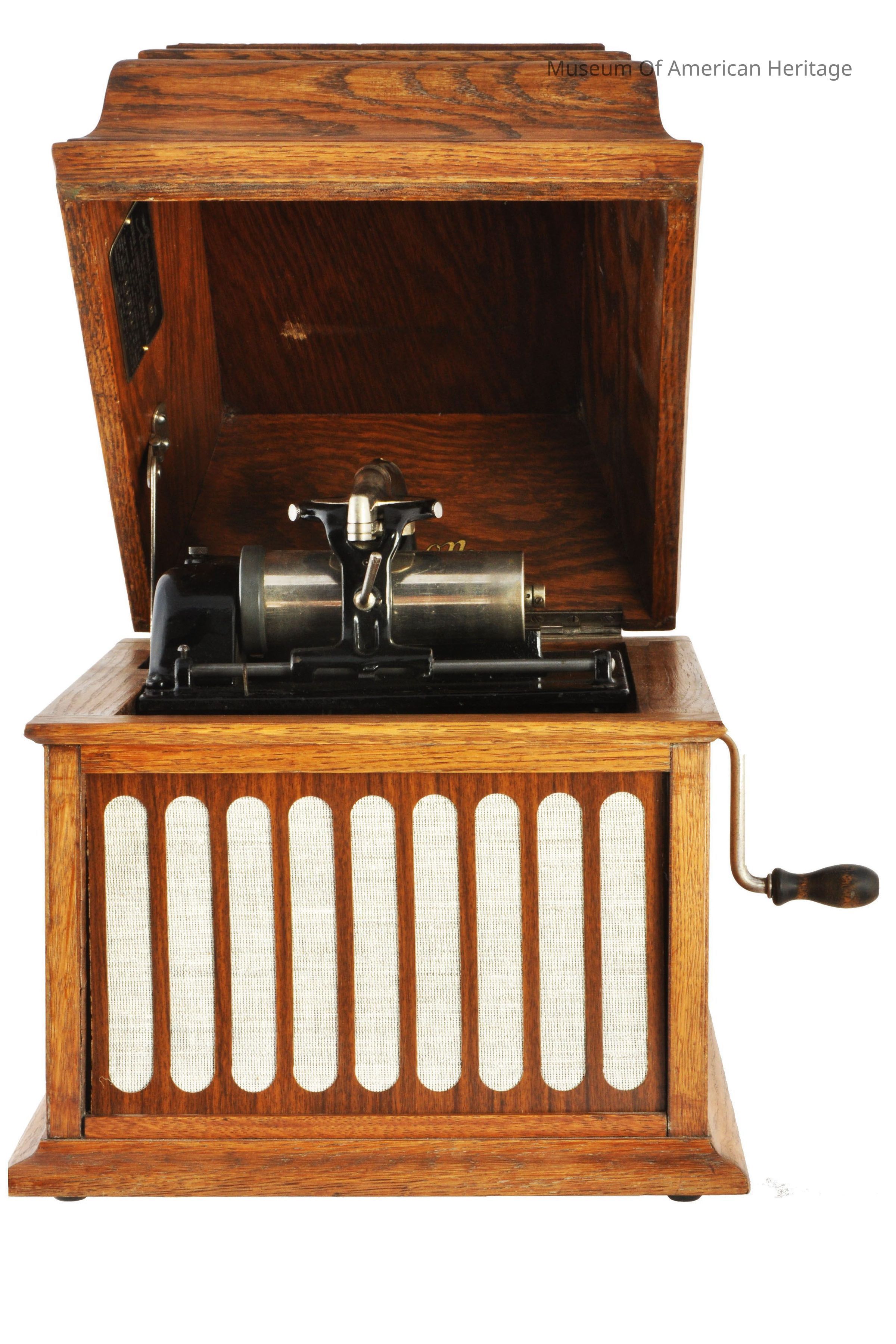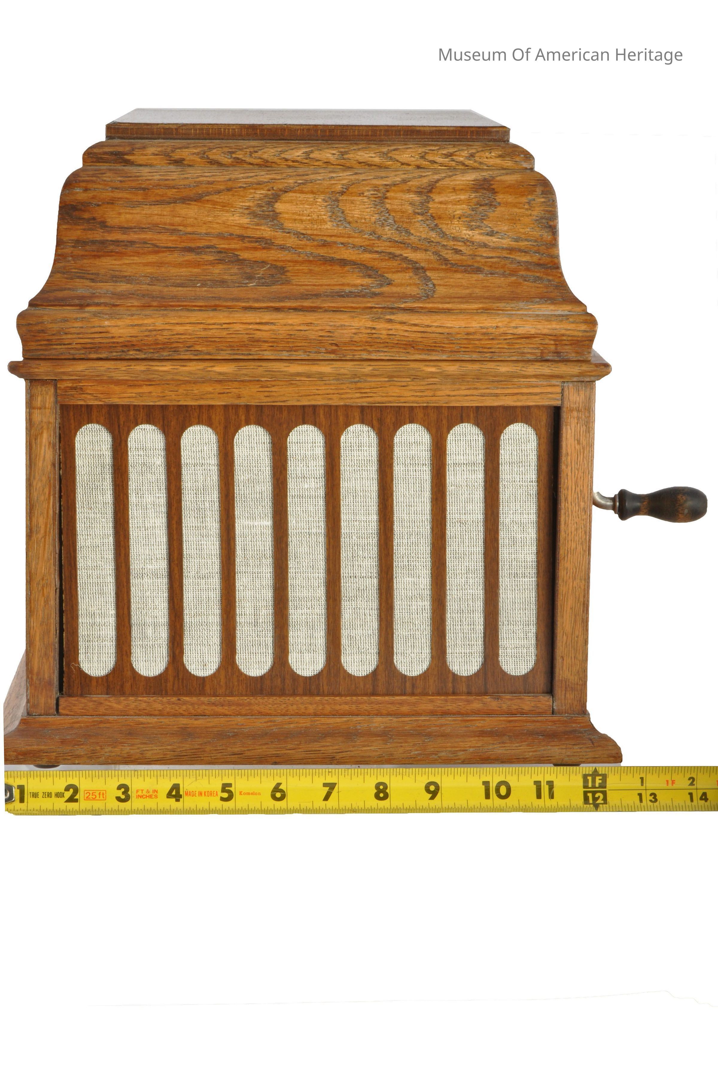 Table model, speaker moves with needle, wind-up crank, 6 music cylinders.