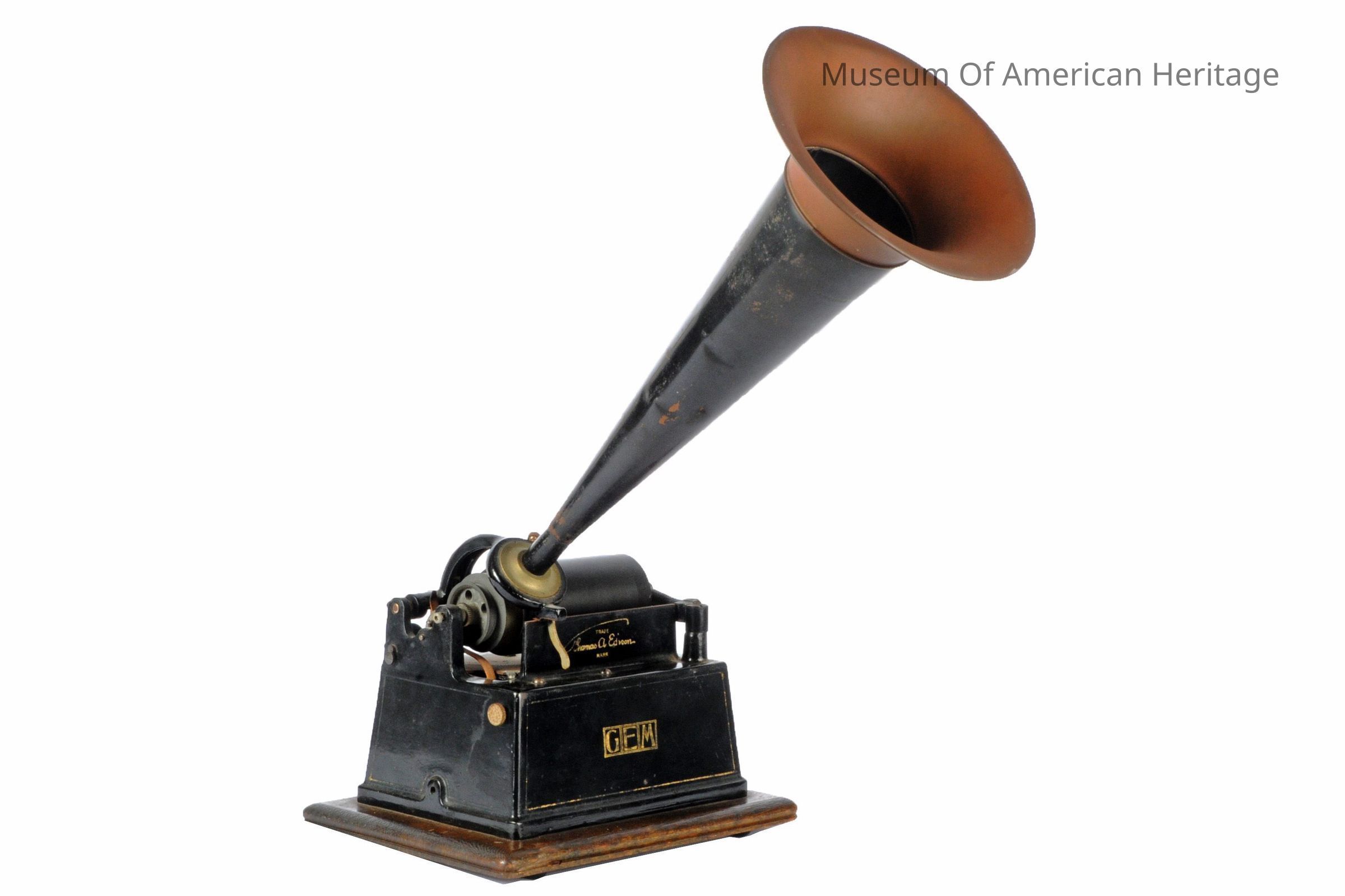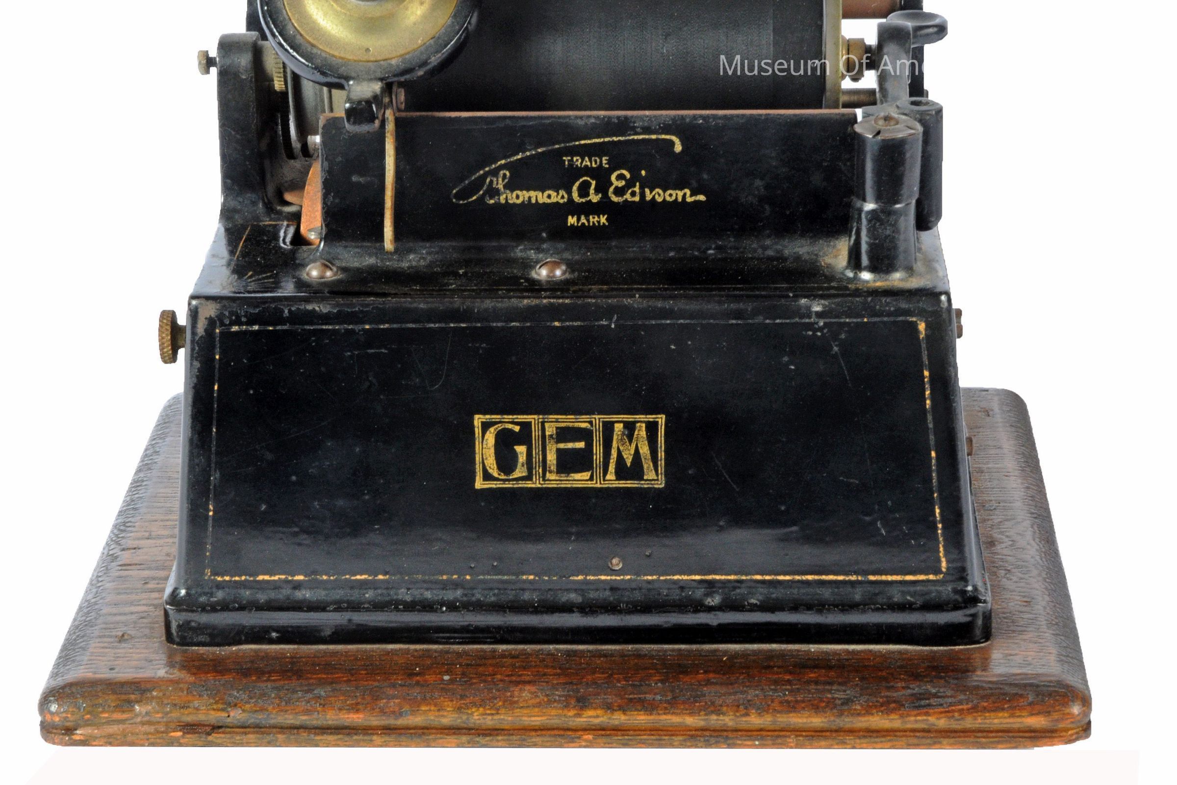 Cover held by thumb screws, Gem decal on front, removable amplifier horn, wax music cylinder.