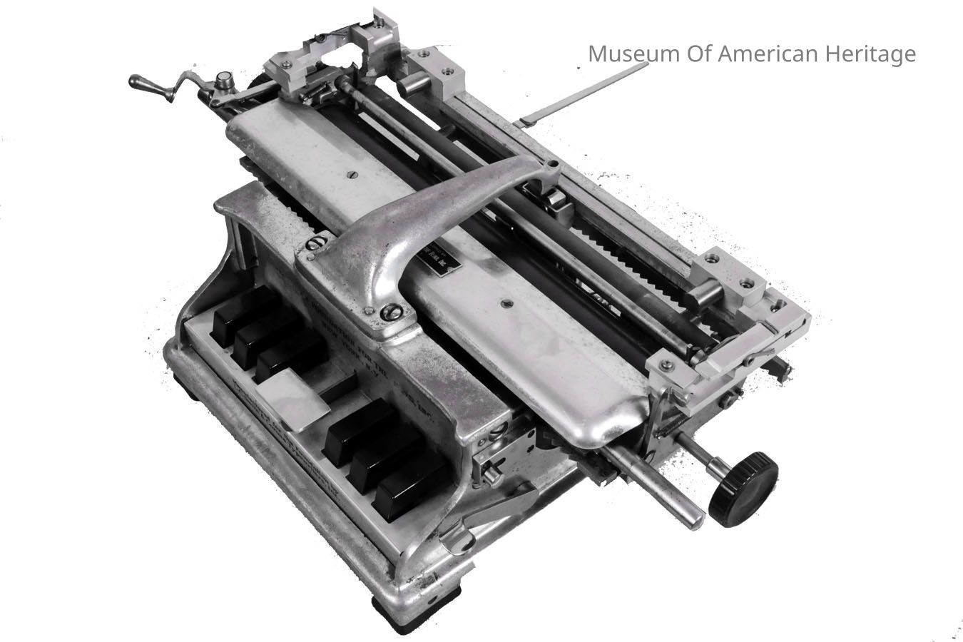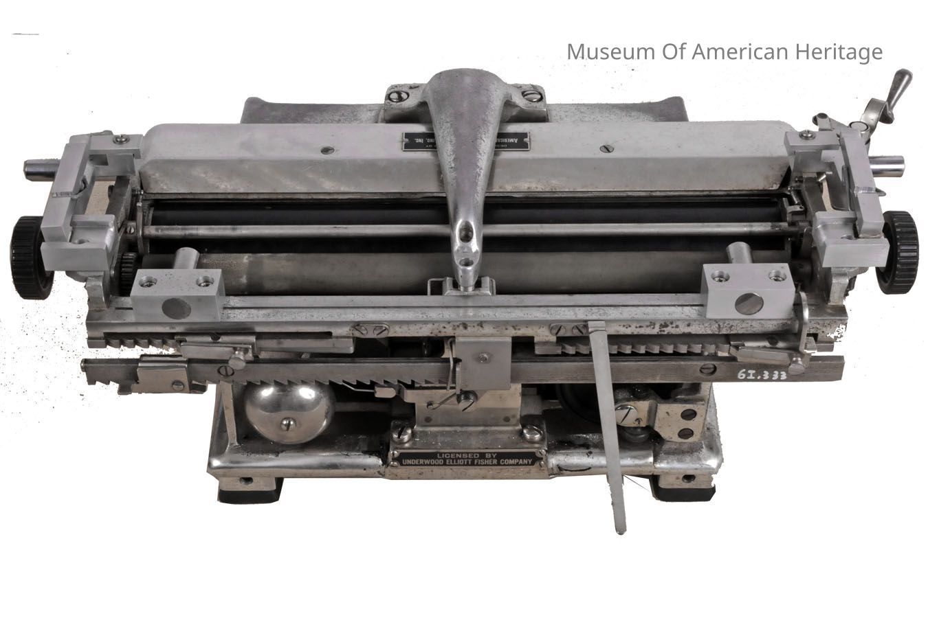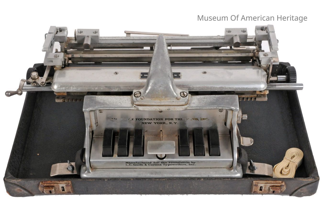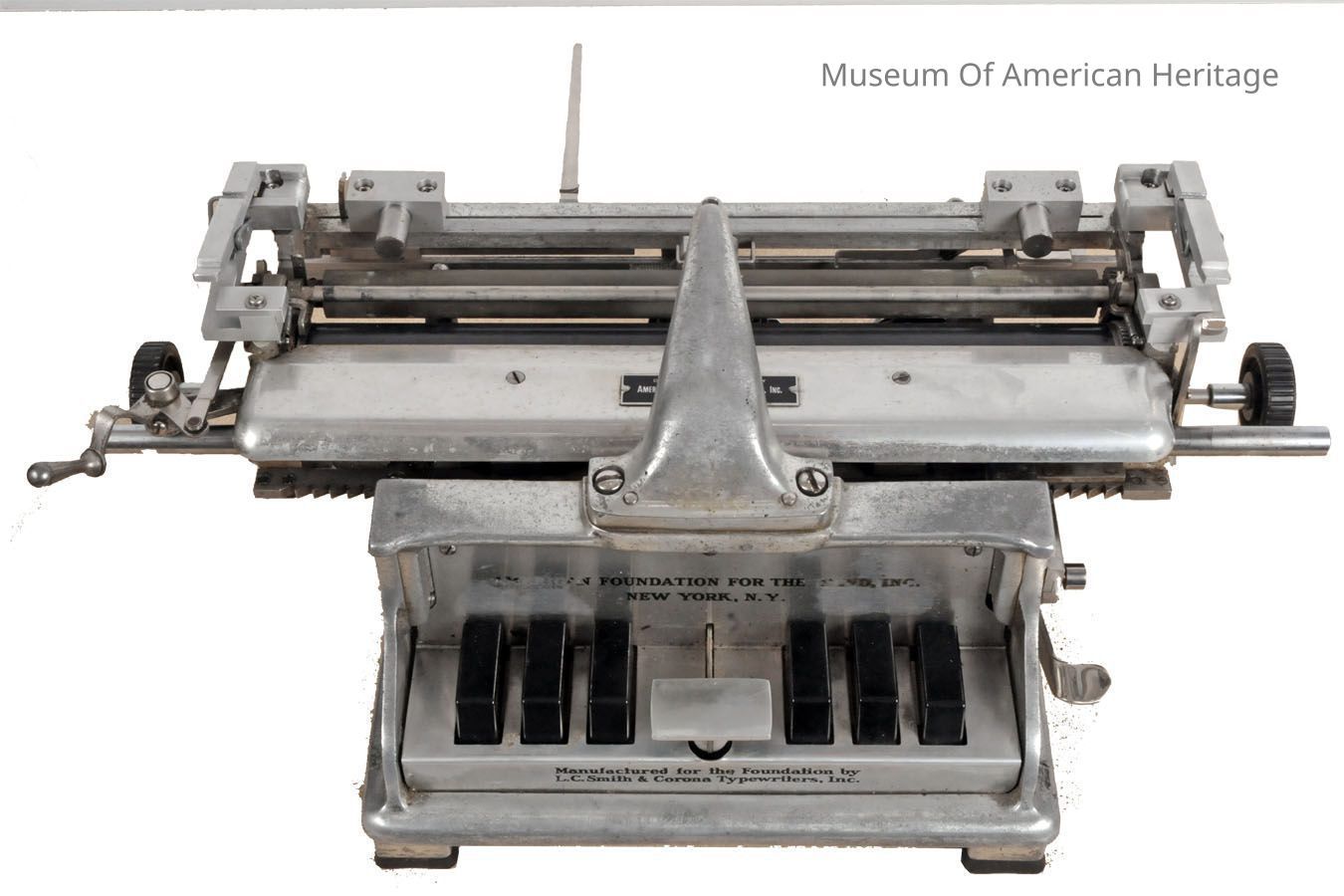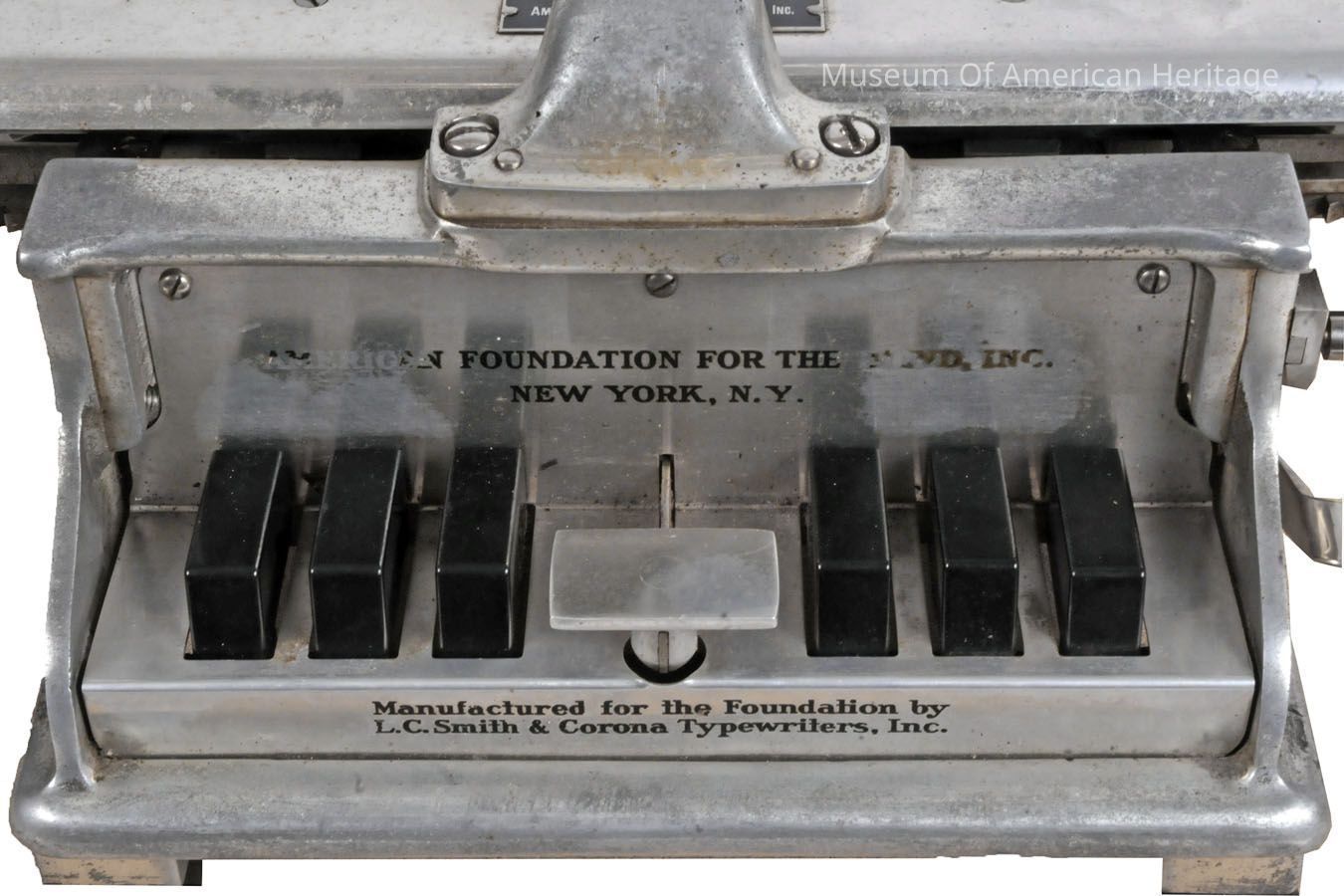 These typewriters were developed by L.C. Smith & Corona for the American Foundation for the Blind. Braille characters are typed using combinations of the six keys with the central bar serving as the space bar.