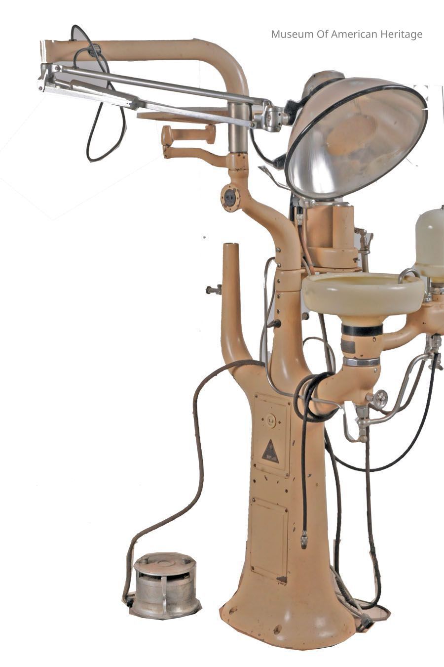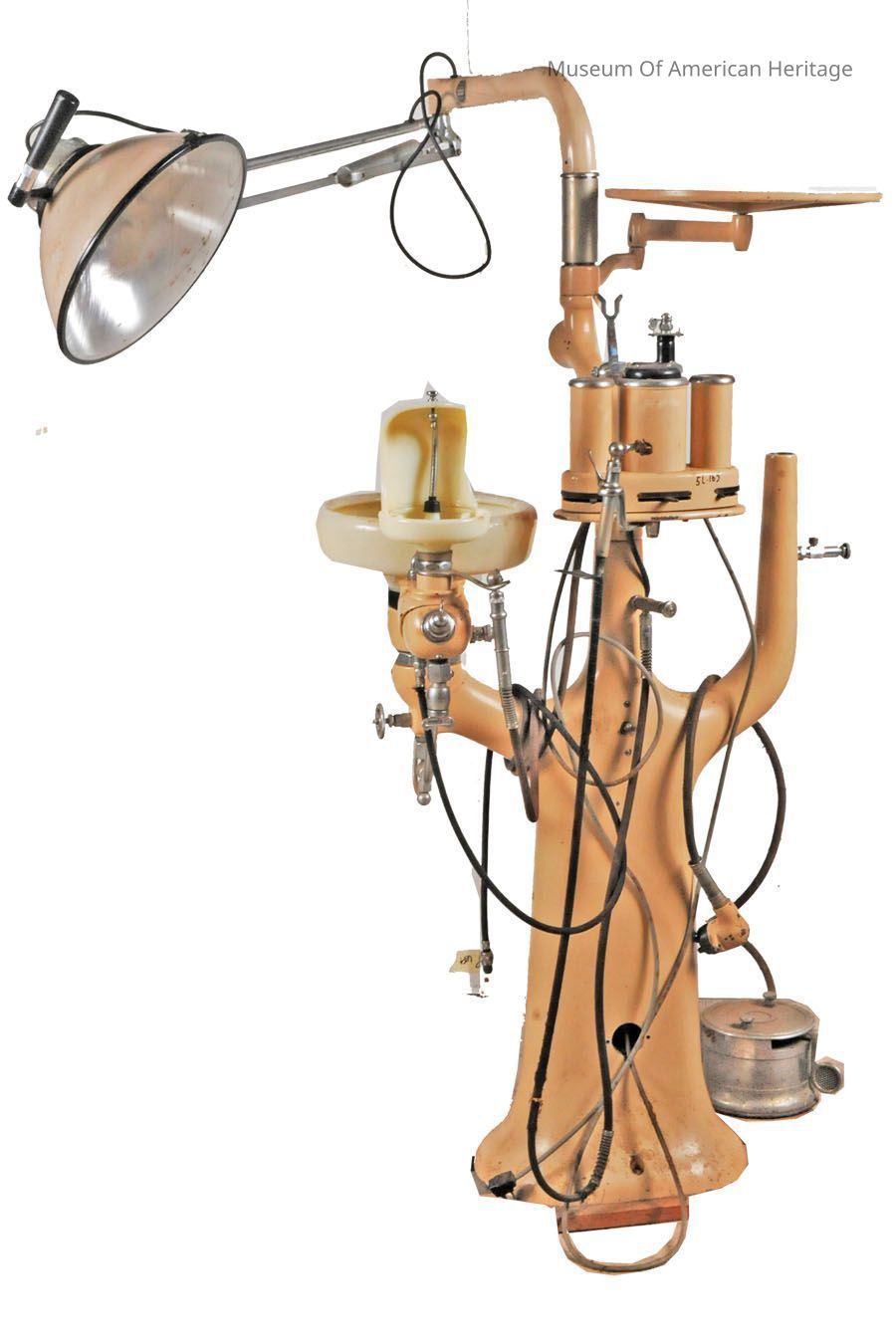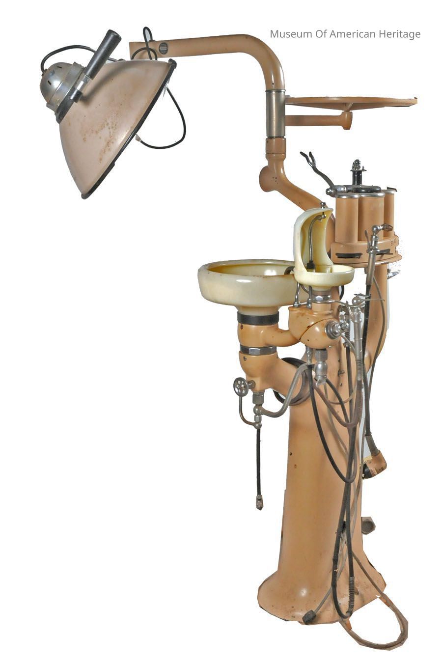 Dental station with water dispenser, spit sink, lamp, water sprayer. Missing dental drill and motor arm.