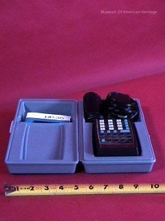 In hard plastic case w/AC adapter/charger, leatherette case, battery power.