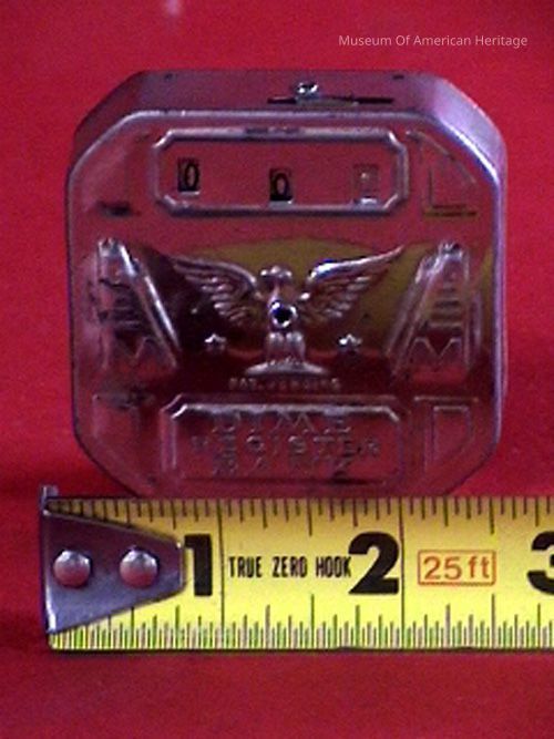 Has counter for dimes, unlocks at $5, Eagle pressed into sheet metal.