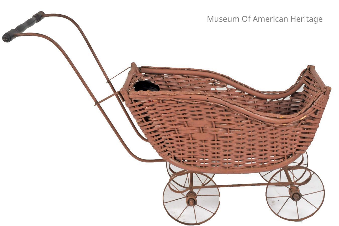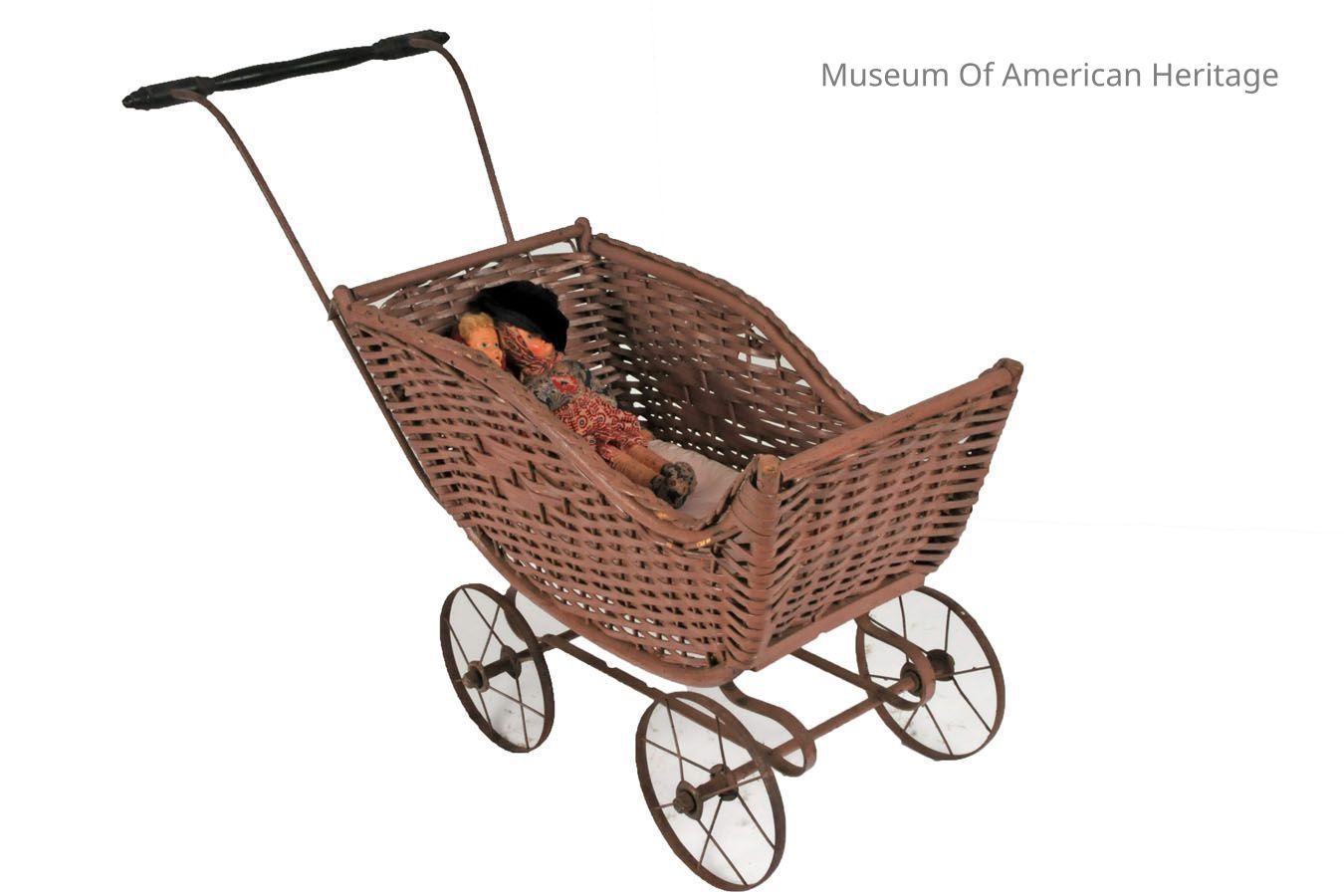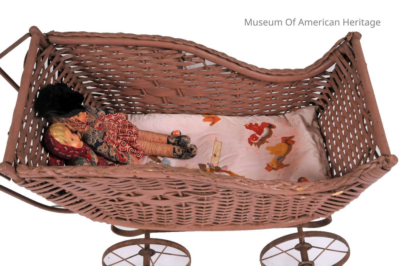 Metal wheels, wooden handle. Plastic liner pillow. Rattan/wicker body. 2x dolls.