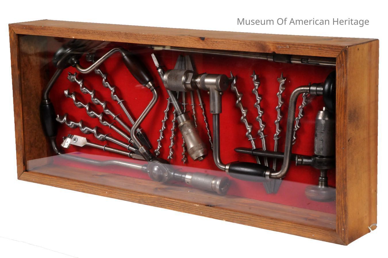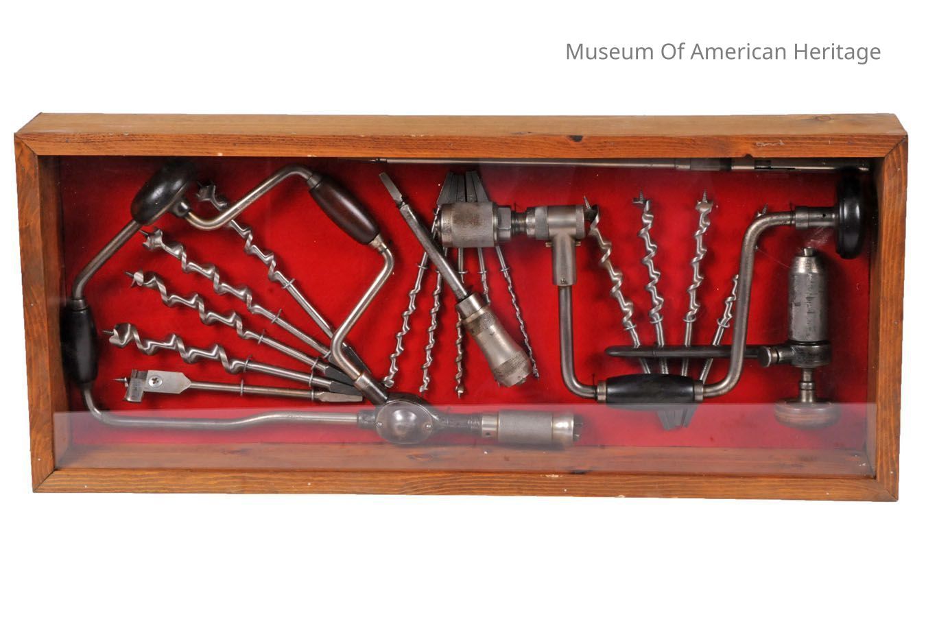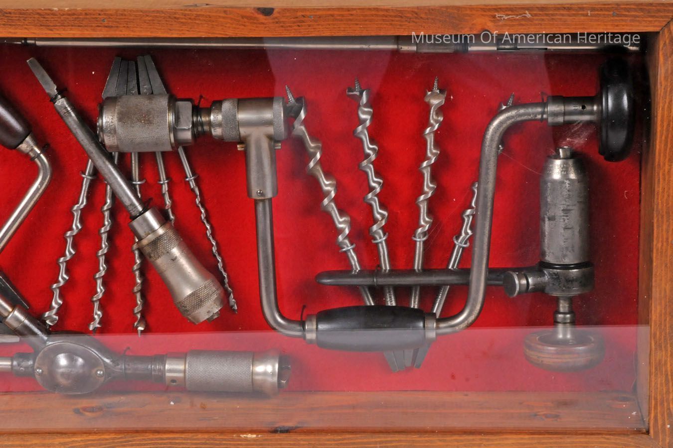 Two display cases of hand drills, drill bits, and attachments.